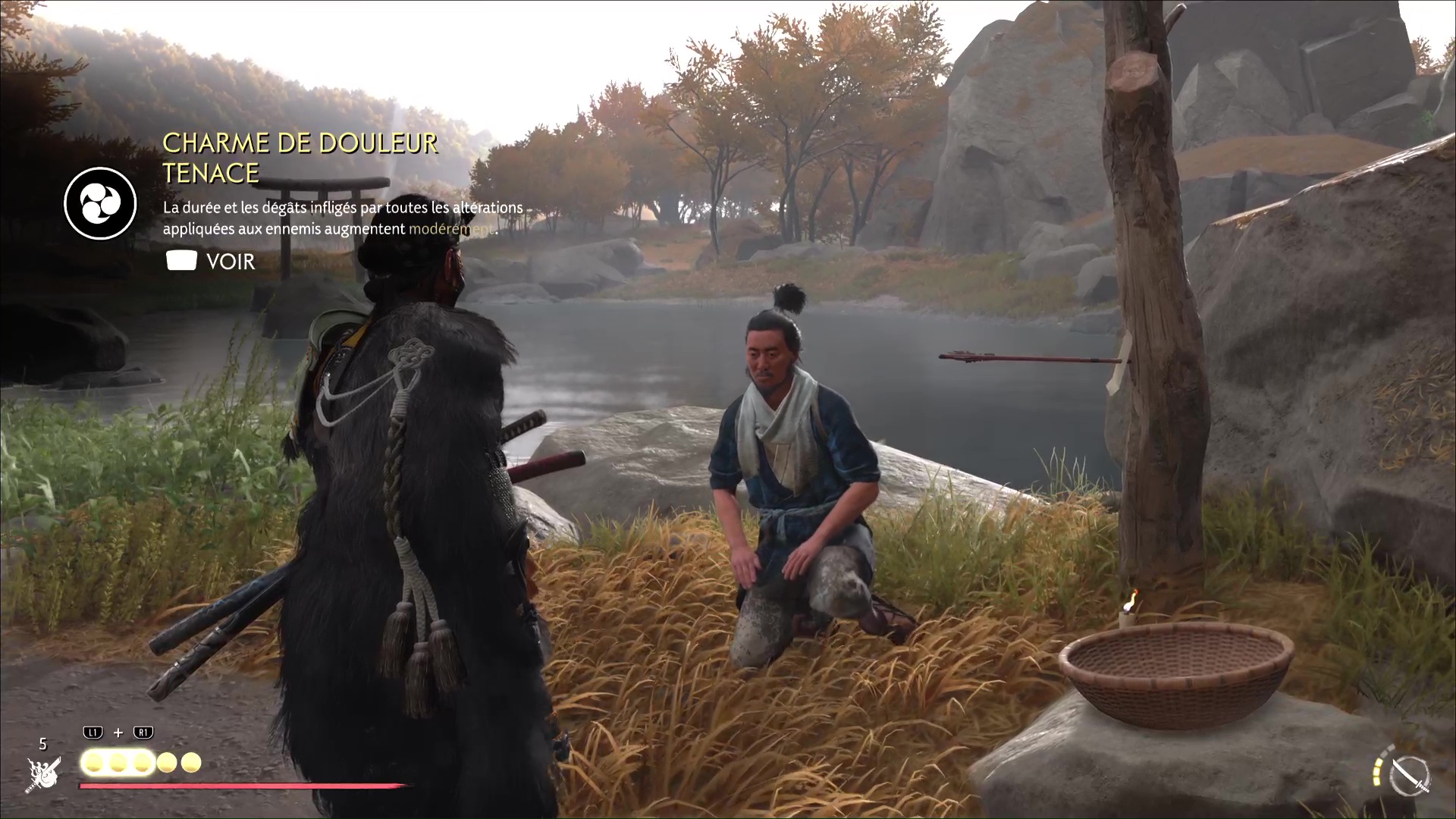 Le message indique qu’il faut cueillir les fleurs bleues du sanctuaire puis les déposer dans le panier qui se trouve à côté. Tout commence donc par l’ascension du sanctuaire en lui-même, puisque les fleurs se situent à leur sommet. Une fois le sommet atteint, soyez bien assuré d’avoir prié devant le sanctuaire pour récupérer le Charme de Masakado.