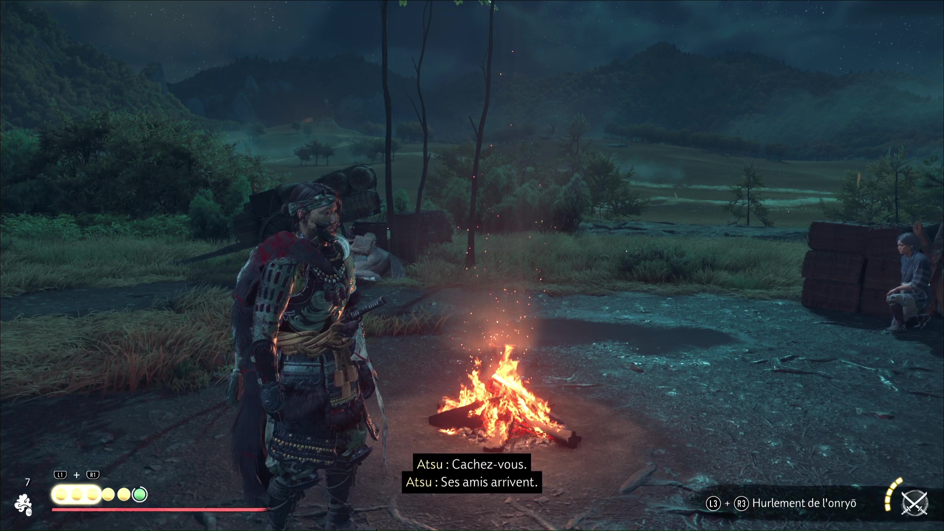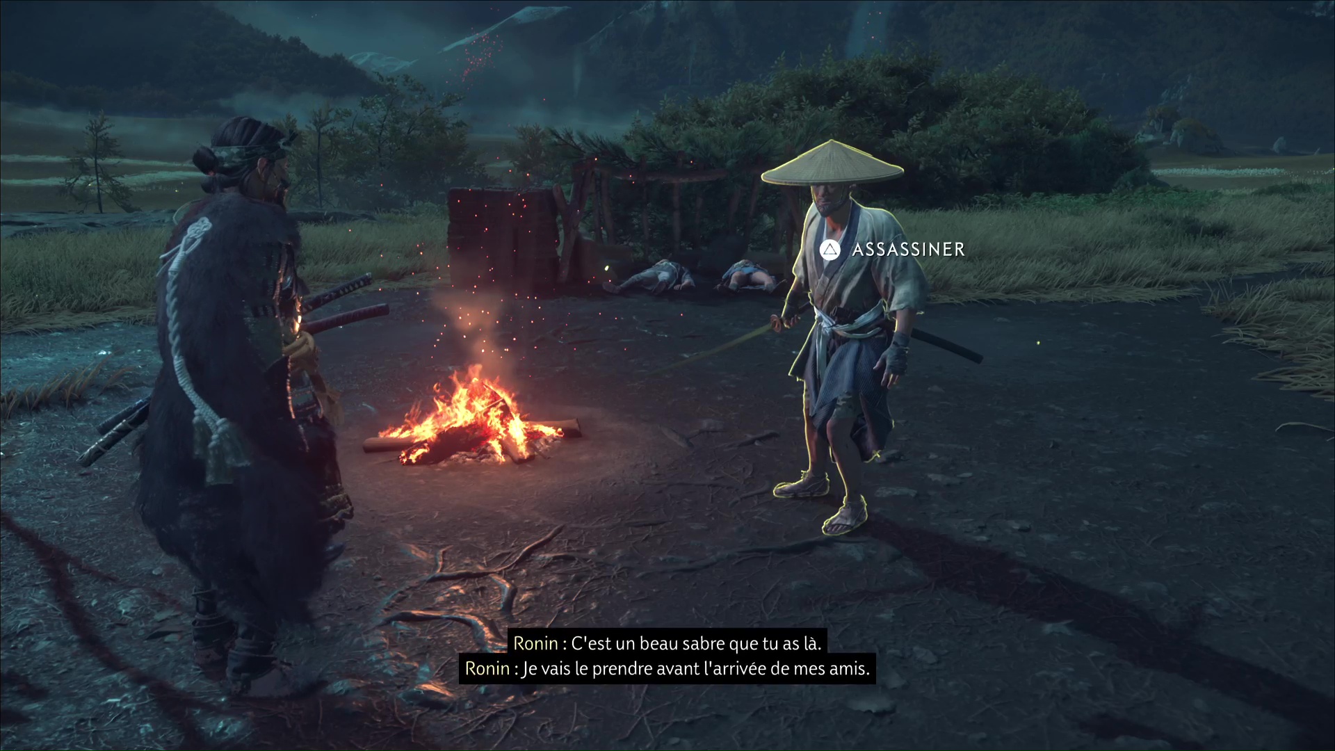 La nuit tombée, Atsu et le ronin se chargent donc de veiller sur le camp. Très rapidement, vous comprenez que le ronin est impliqué dans les vols. Il vous demandera de vous lever et de lui rendre votre sabre. Mais quand la commande « Assassiner » apparaît, faites-le.