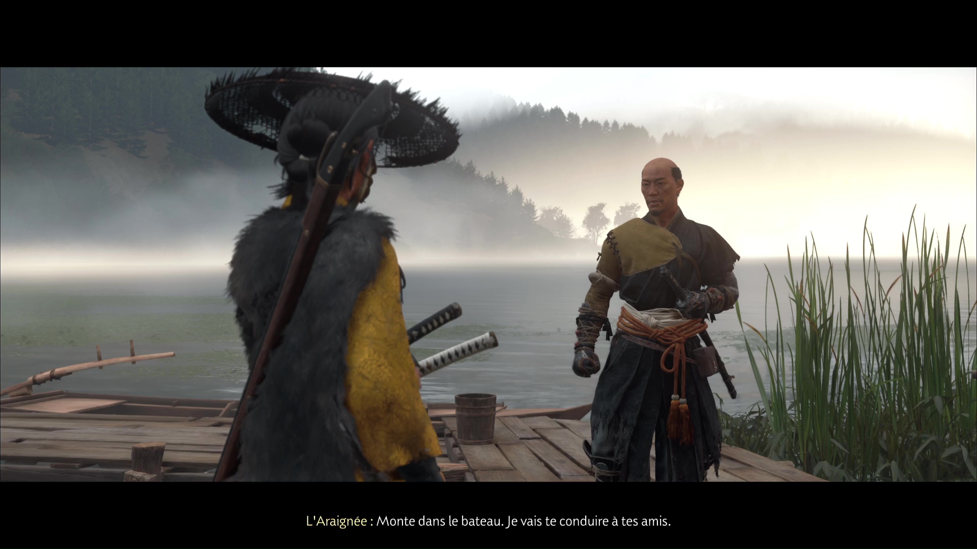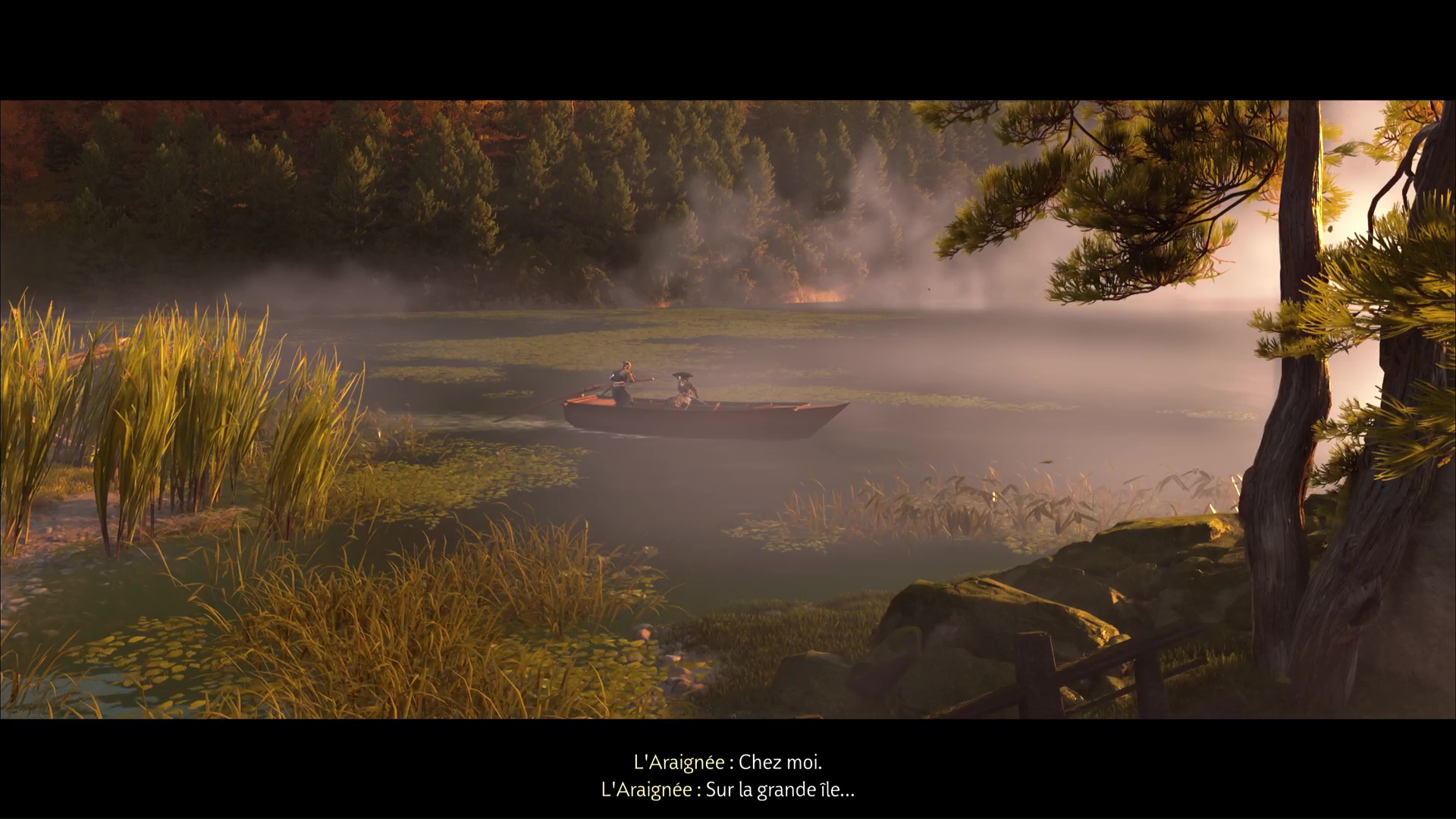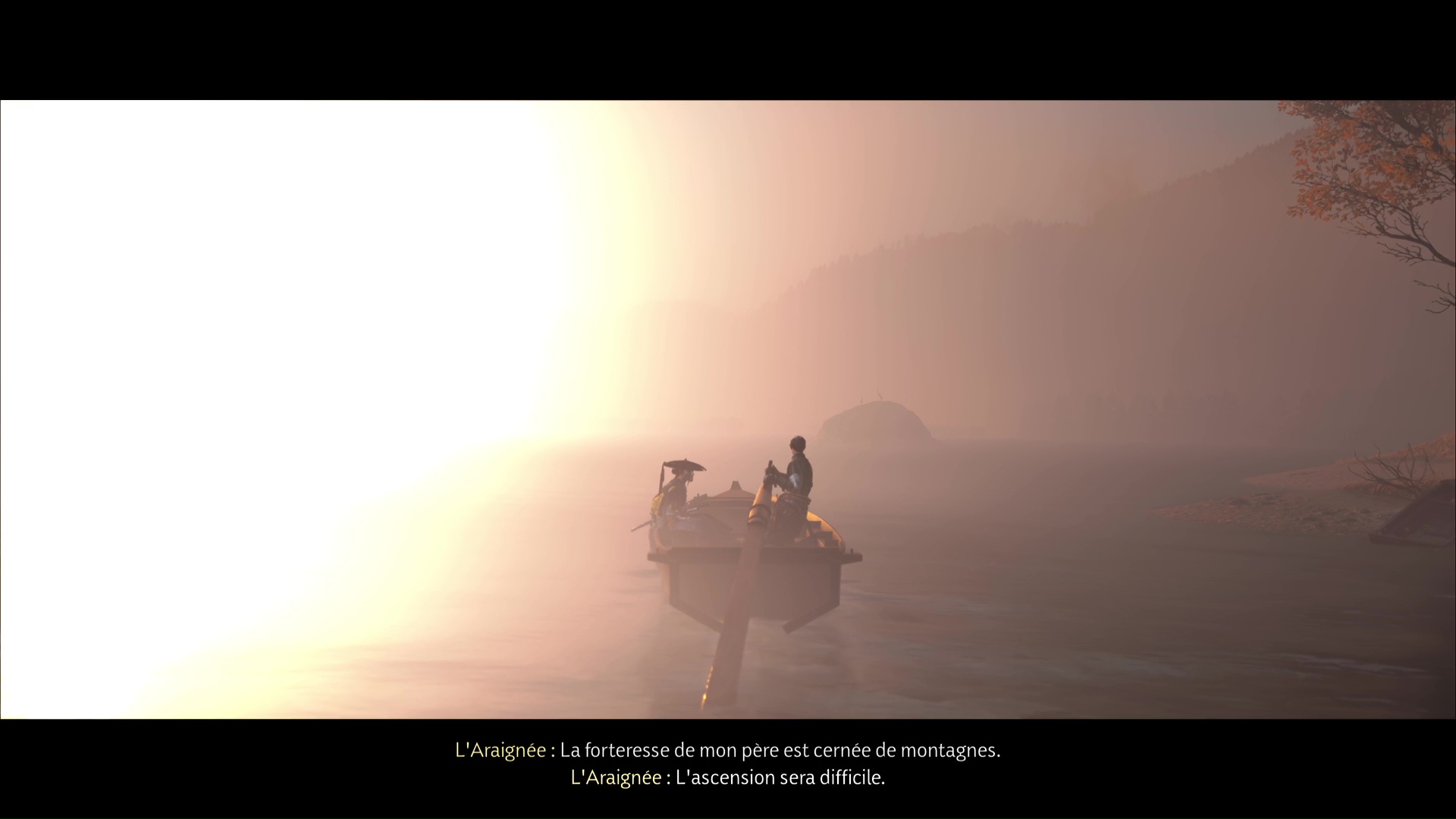 Vous voilà parti à traverser le grand lac pour rejoindre la forteresse de Saito. Atsu n’obtiendra rien de plus de l’Araignée, qui après vous avoir amené à destination, retournera dans le sud.