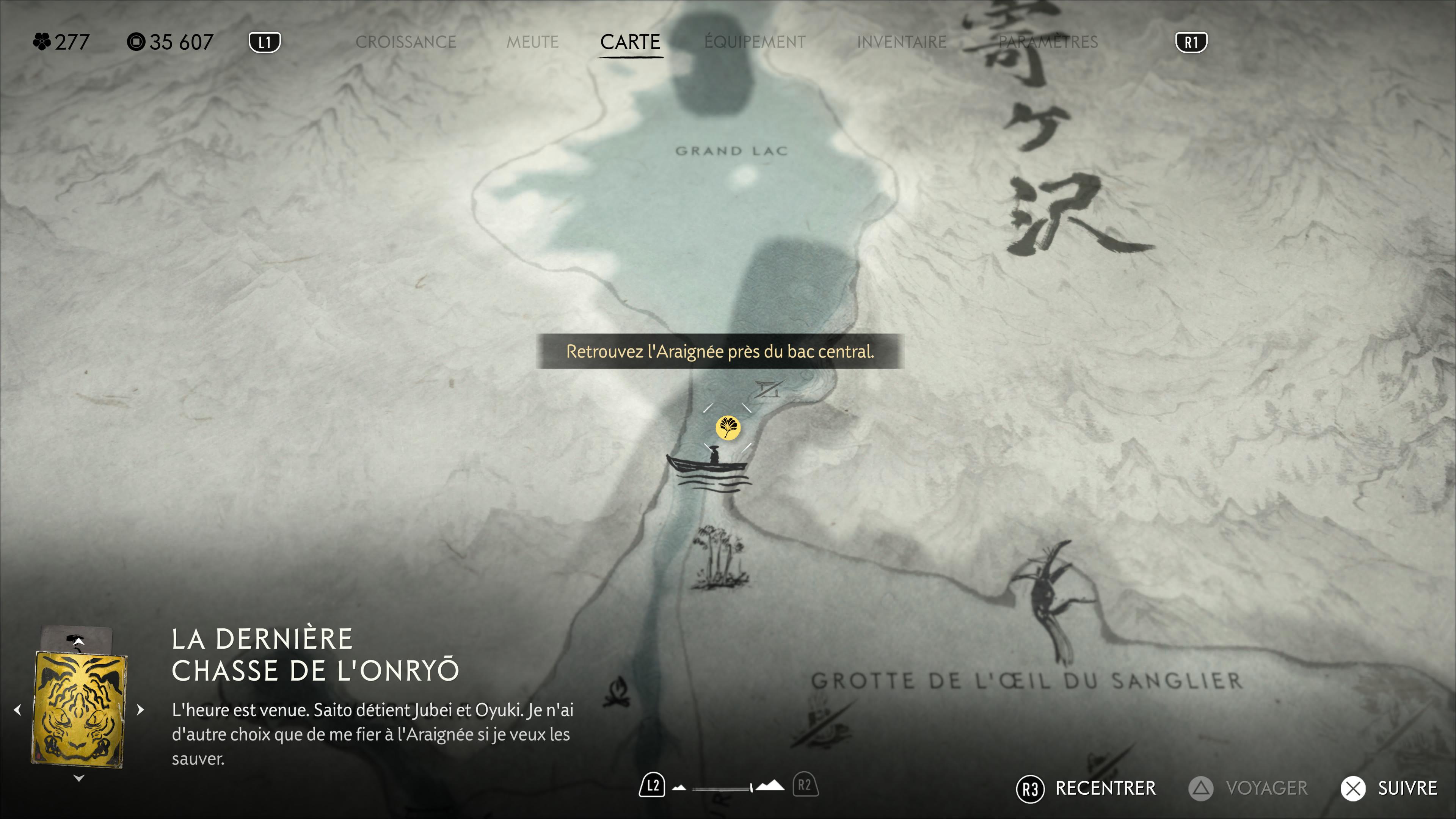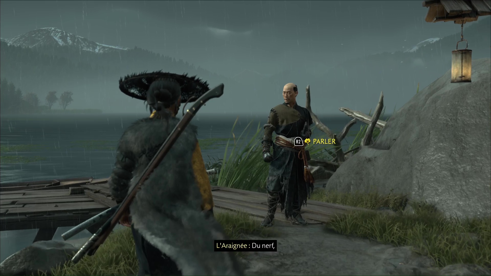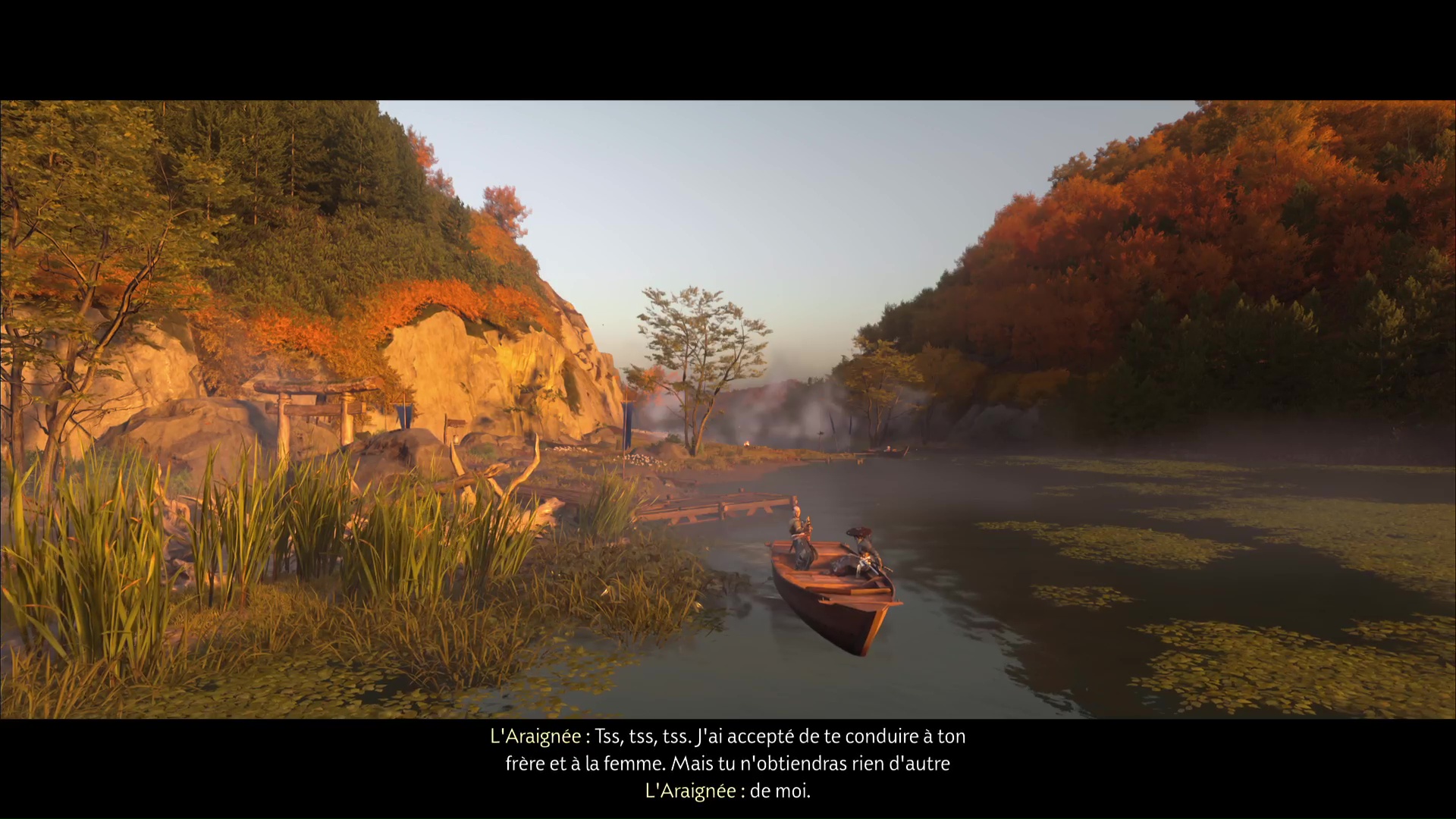 Vous voilà parti à traverser le grand lac pour rejoindre la forteresse de Saito. Atsu n’obtiendra rien de plus de l’Araignée, qui après vous avoir amené à destination, retournera dans le sud.