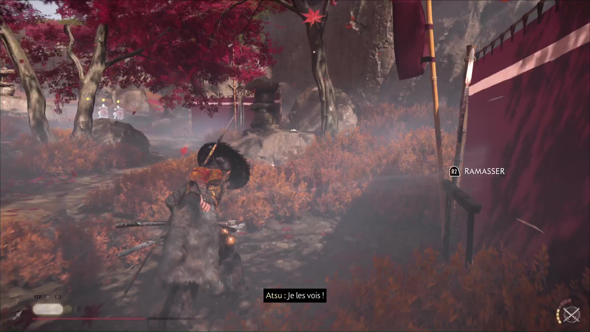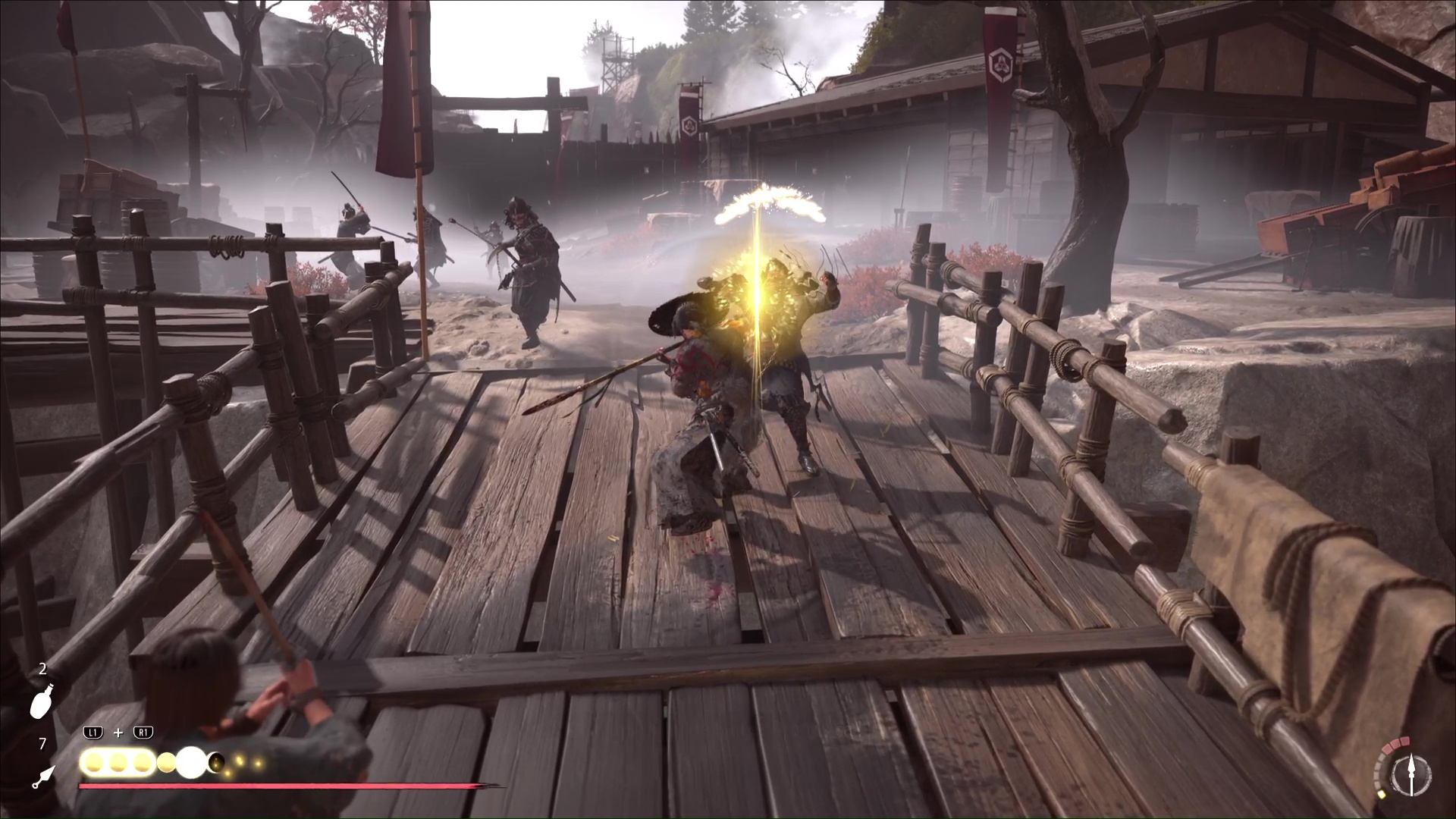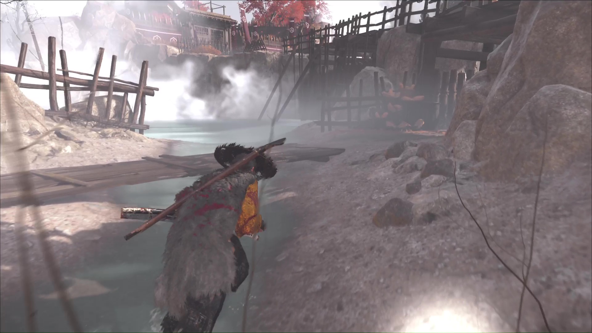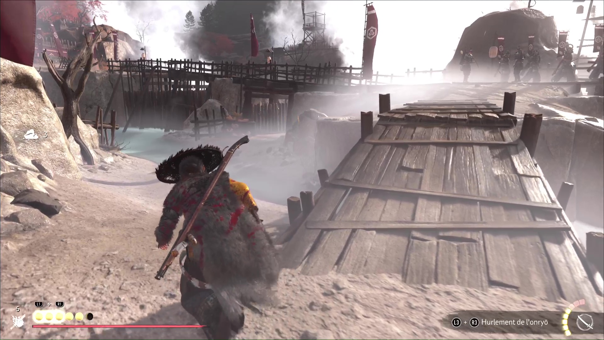 Montez ensuite un petit chemin qui mène à d’autres ennemis un peu plus haut, en gardant à l’œil la brute qui utilise justement un bō-hiya. Traversez le pont juste après.