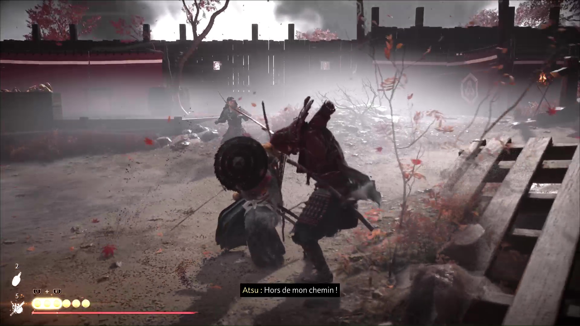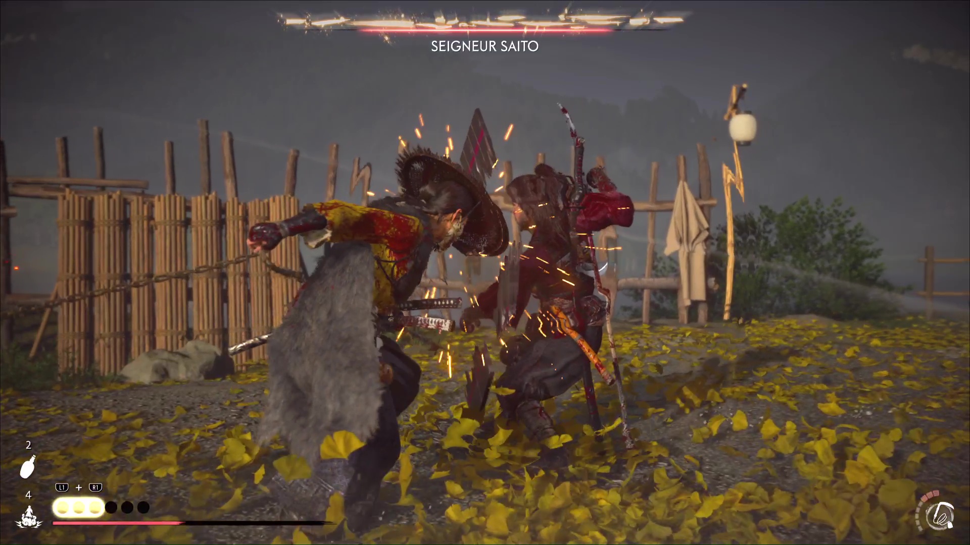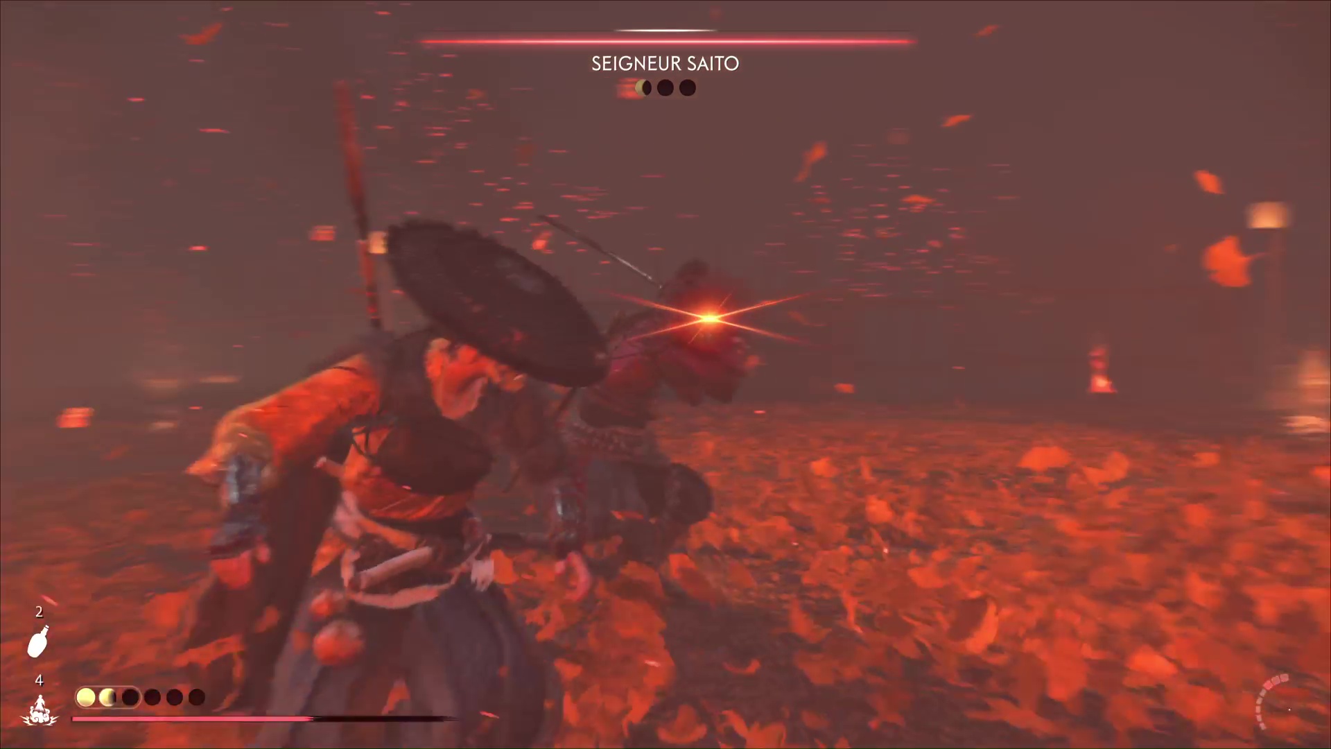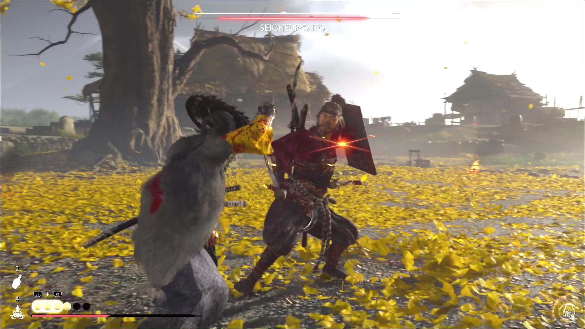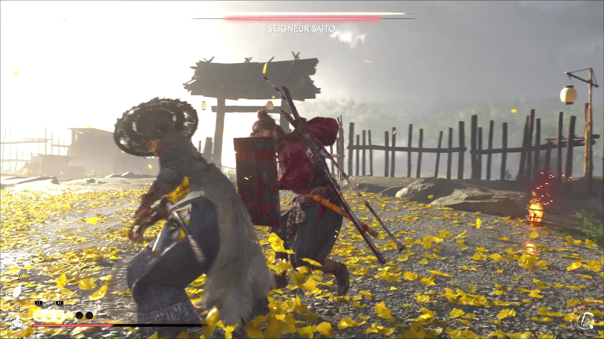 Vient ensuite le bouclier et la faucille. Équipez votre kusarigama et ne tardez pas à briser le bouclier grâce à des attaques lourdes ou via votre attaque d’esprit. Attention aux coups de boucliers symbolisés par une lumière rouge.