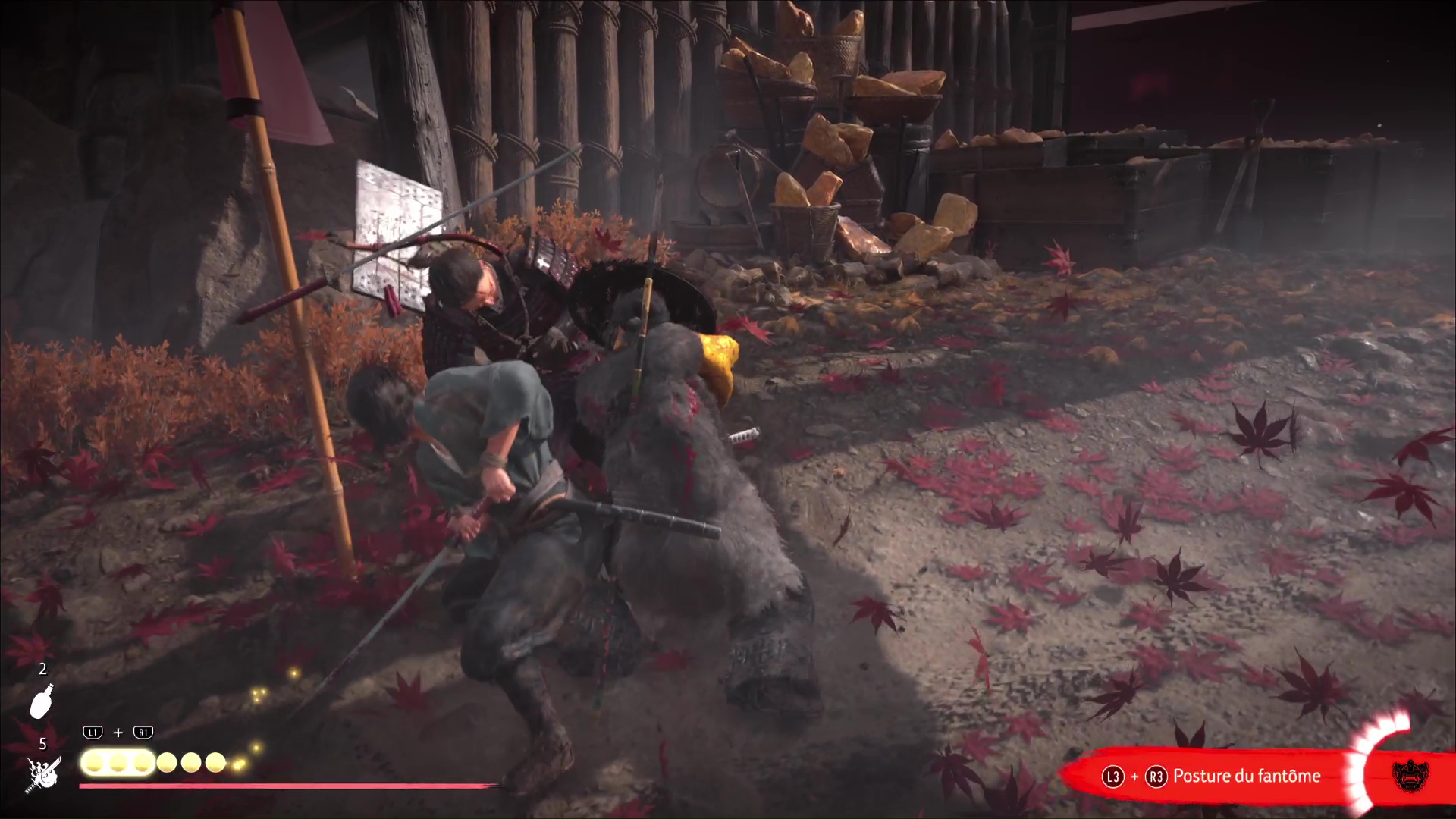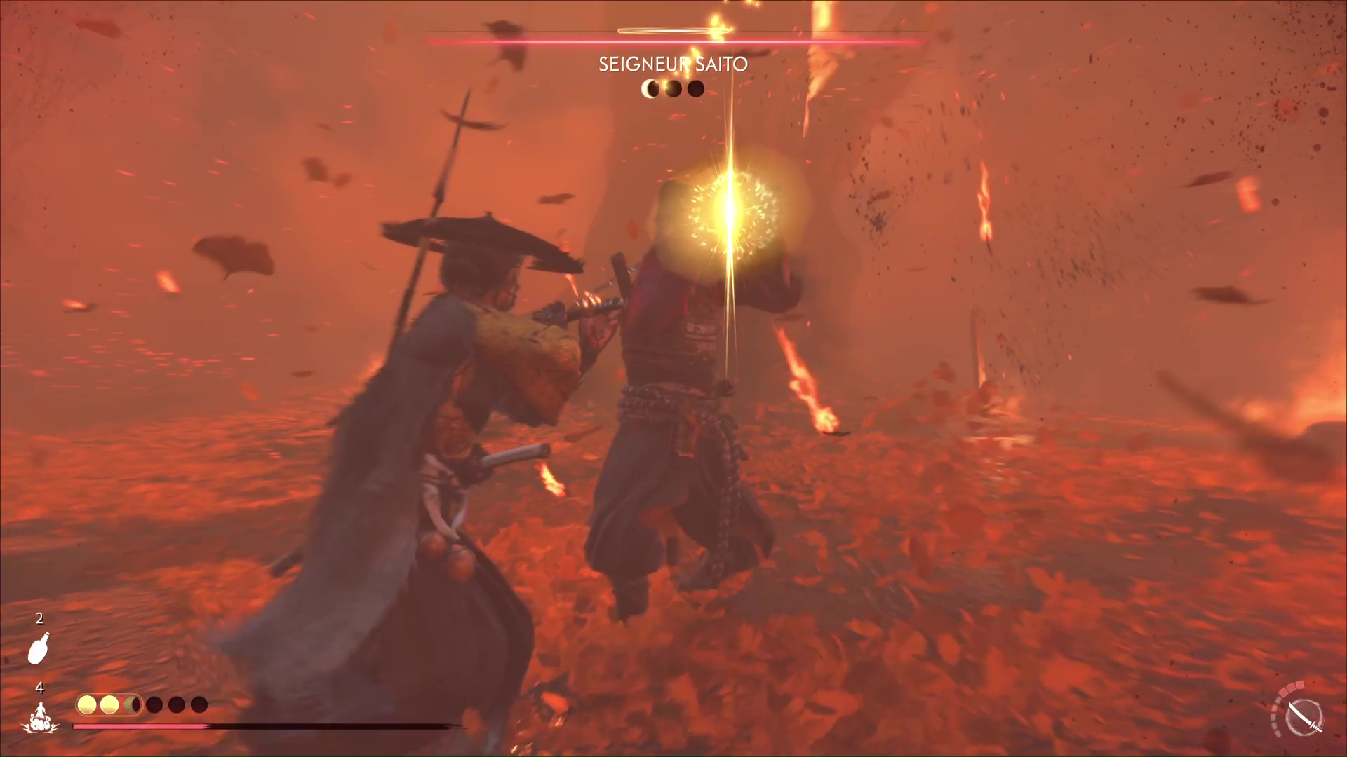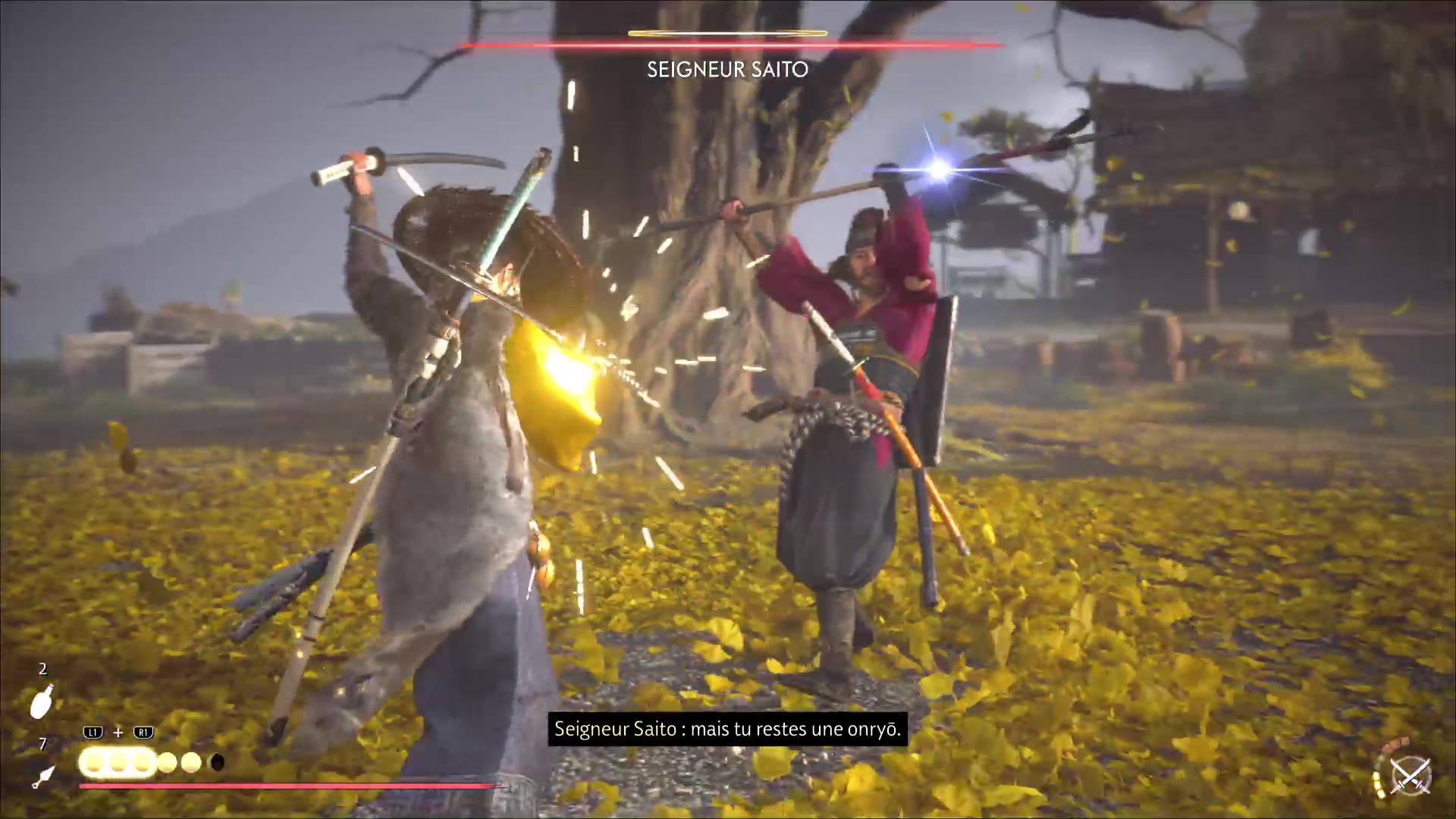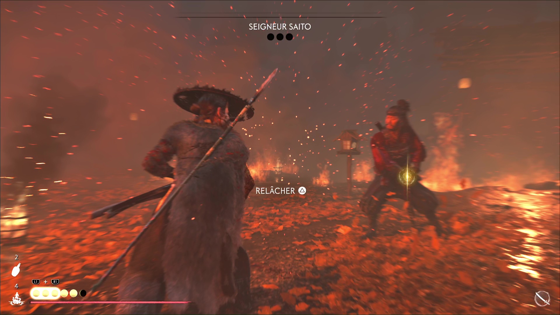 Vient ensuite le bouclier et la faucille. Équipez votre kusarigama et ne tardez pas à briser le bouclier grâce à des attaques lourdes ou via votre attaque d’esprit. Attention aux coups de boucliers symbolisés par une lumière rouge.