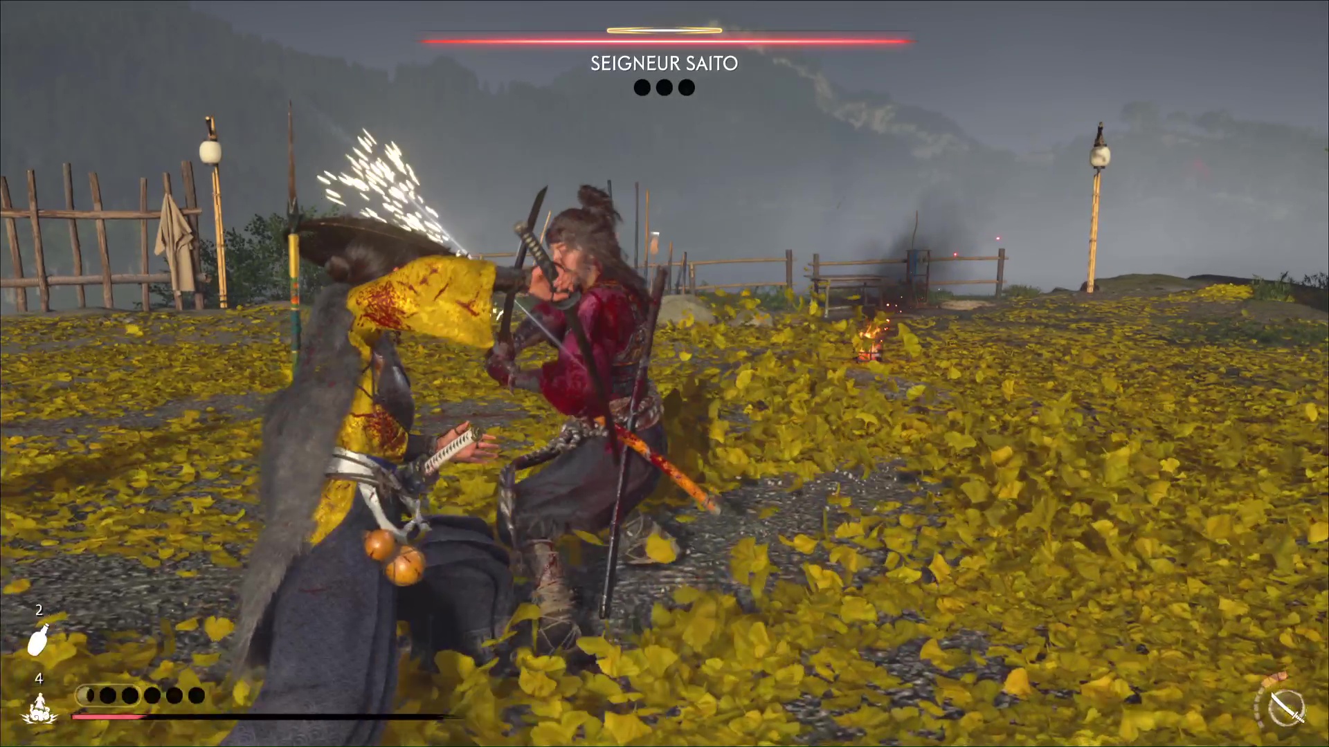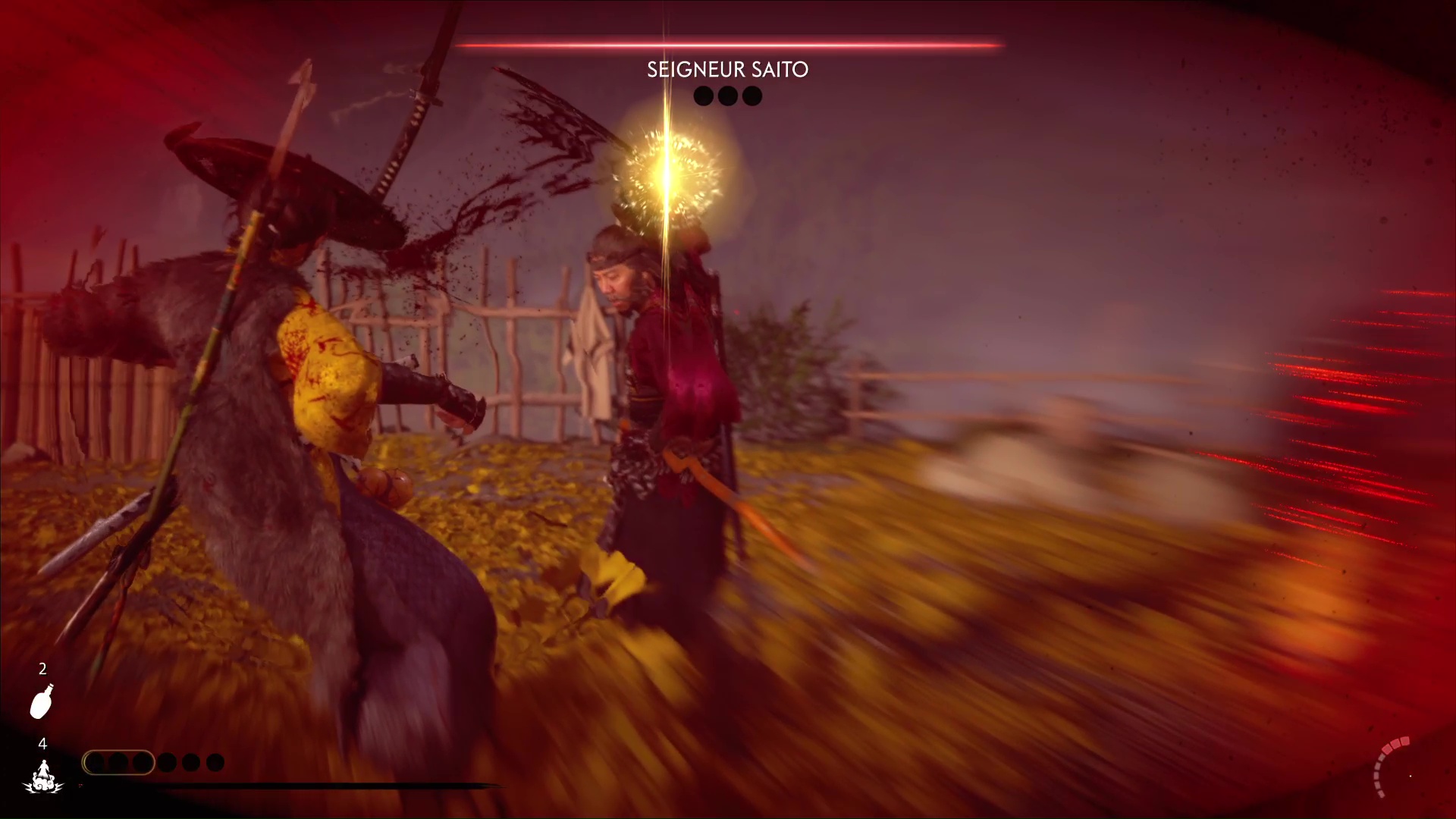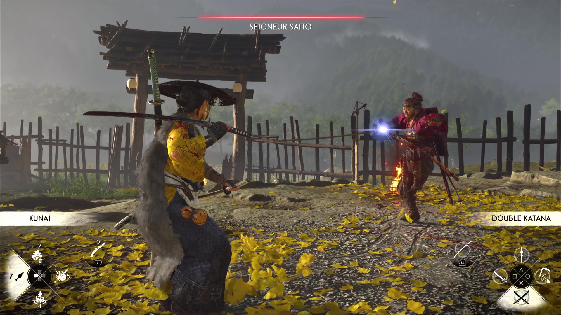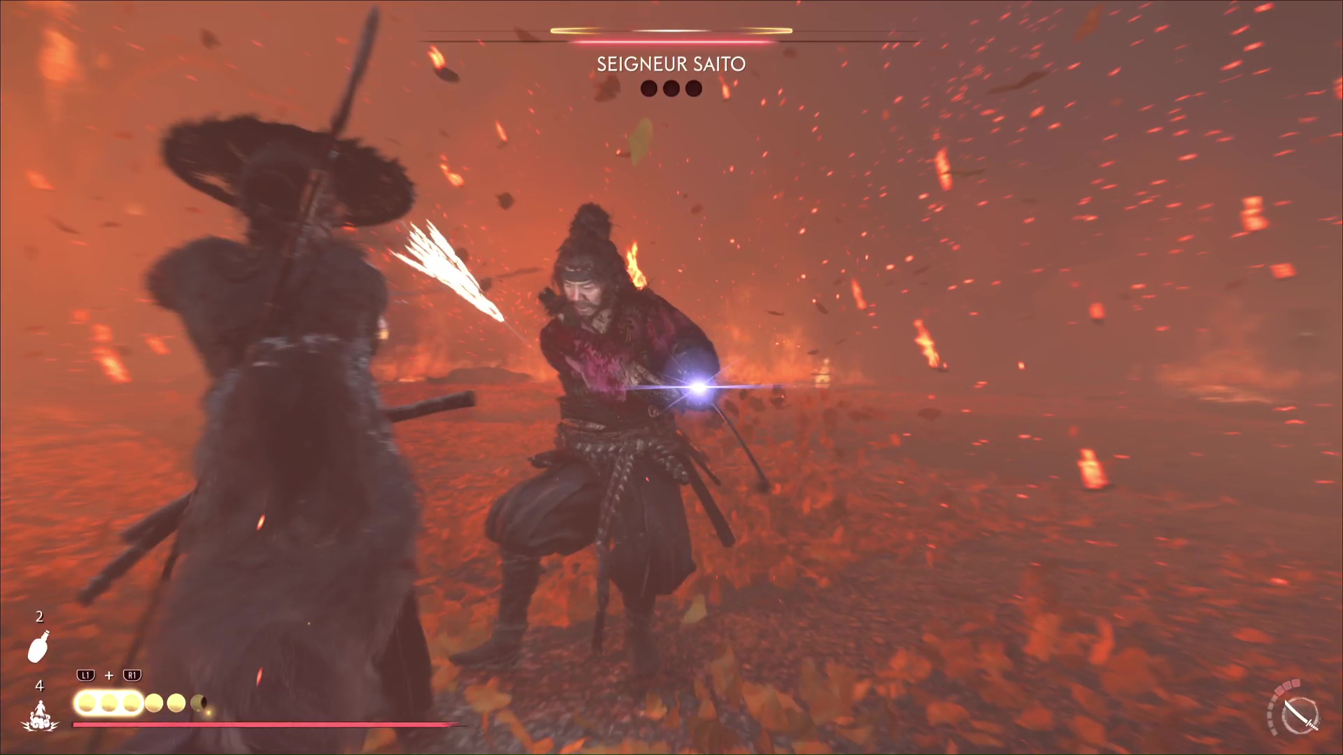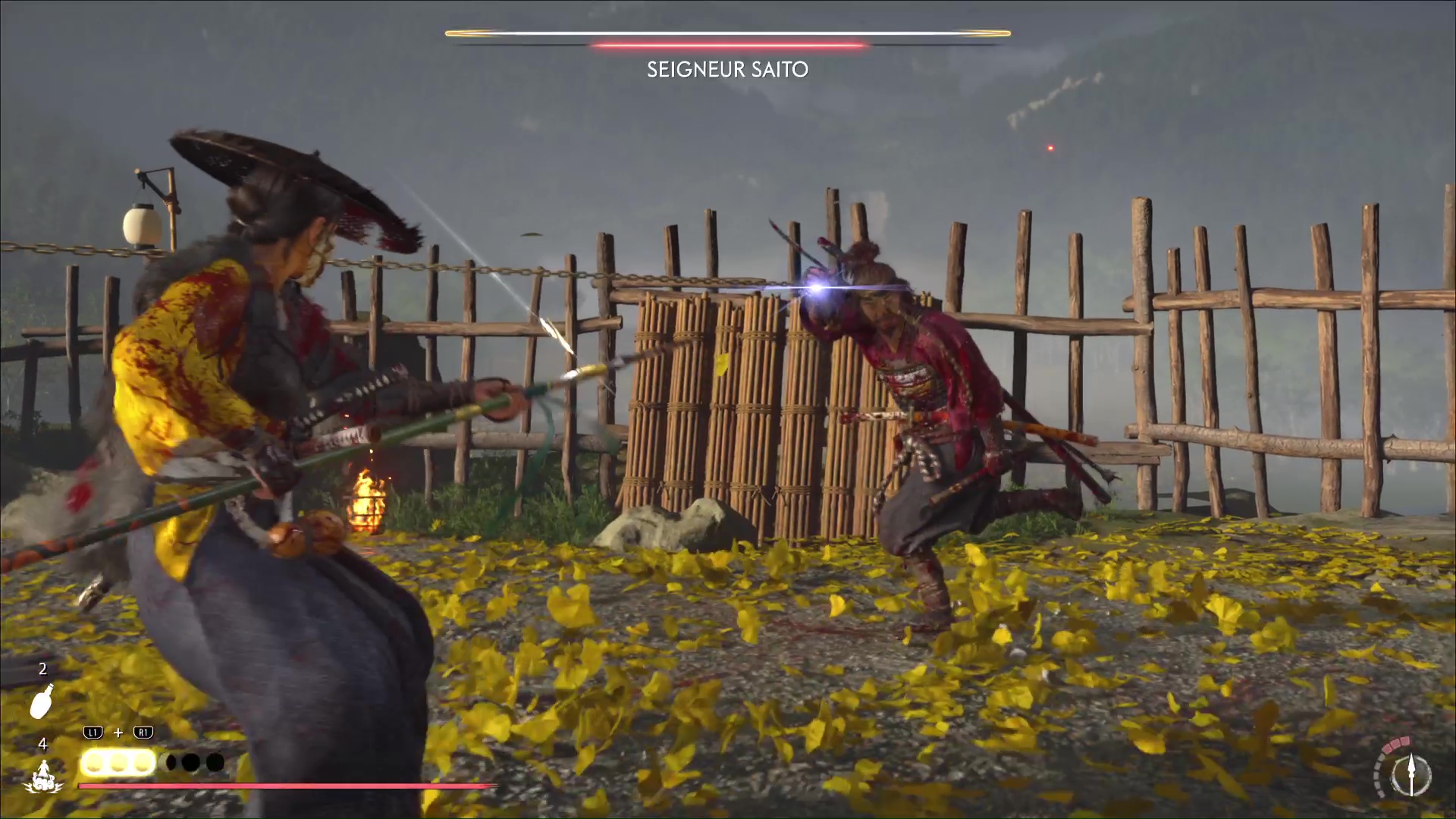 Vient ensuite le bouclier et la faucille. Équipez votre kusarigama et ne tardez pas à briser le bouclier grâce à des attaques lourdes ou via votre attaque d’esprit. Attention aux coups de boucliers symbolisés par une lumière rouge.