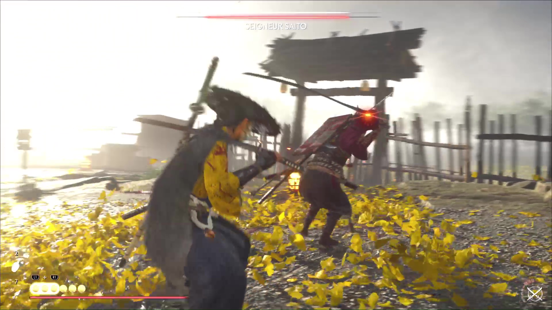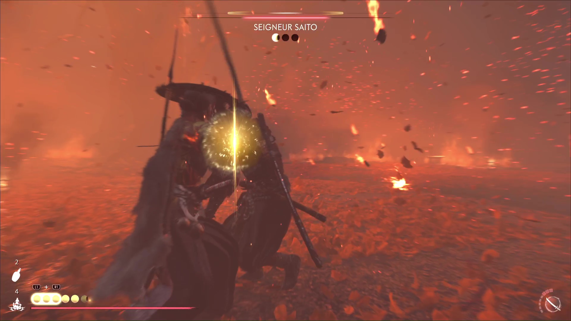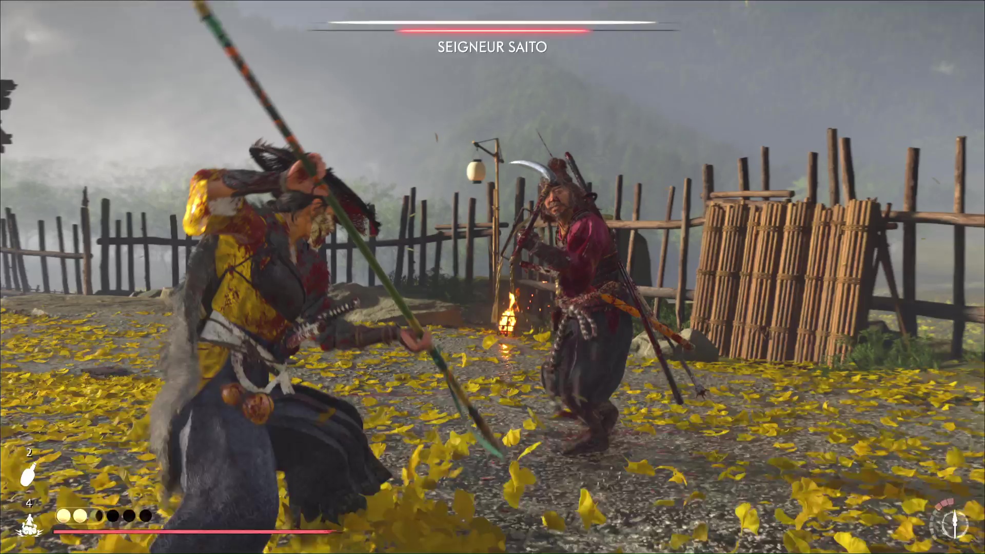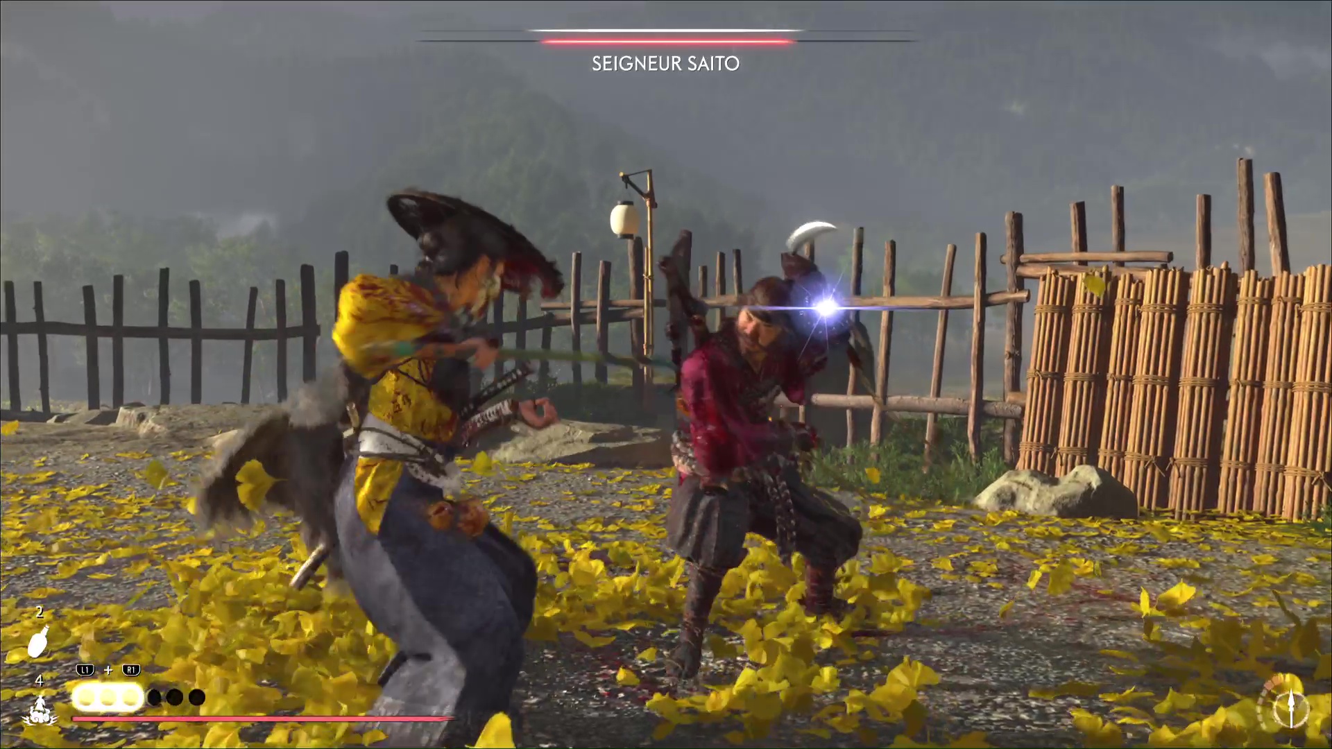 Vient ensuite le bouclier et la faucille. Équipez votre kusarigama et ne tardez pas à briser le bouclier grâce à des attaques lourdes ou via votre attaque d’esprit. Attention aux coups de boucliers symbolisés par une lumière rouge.