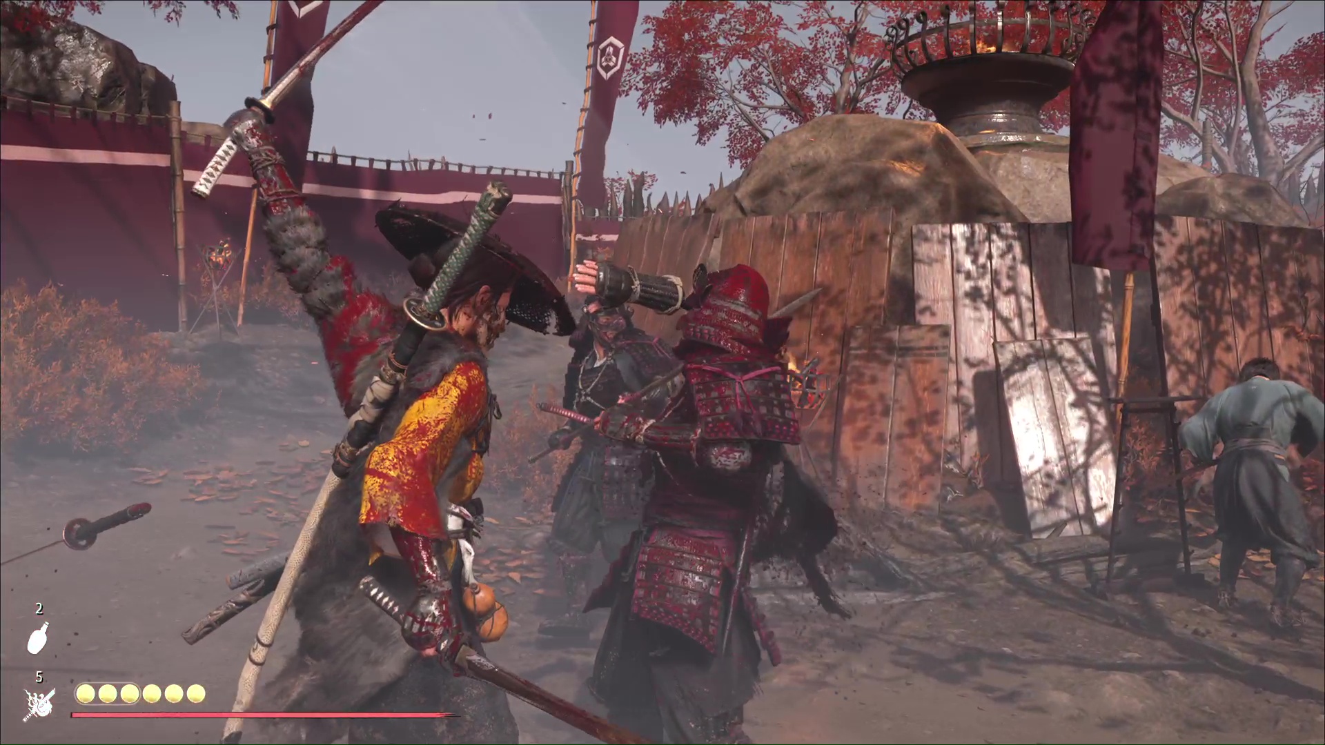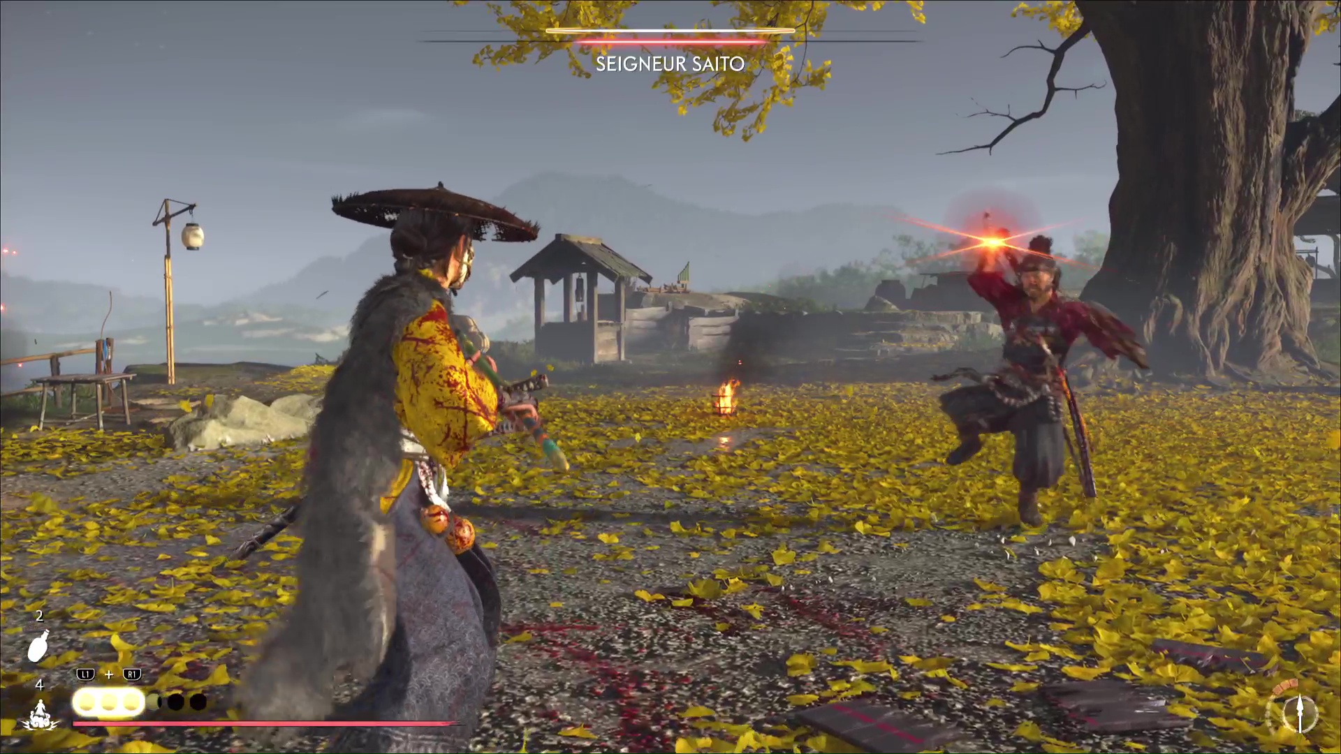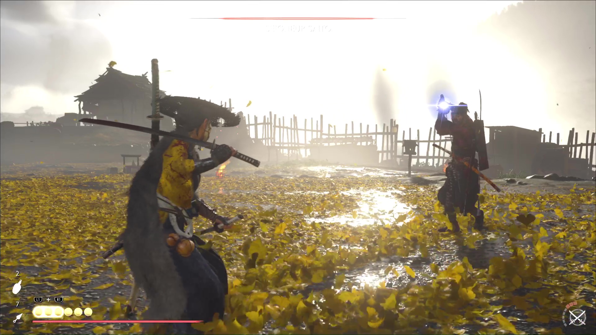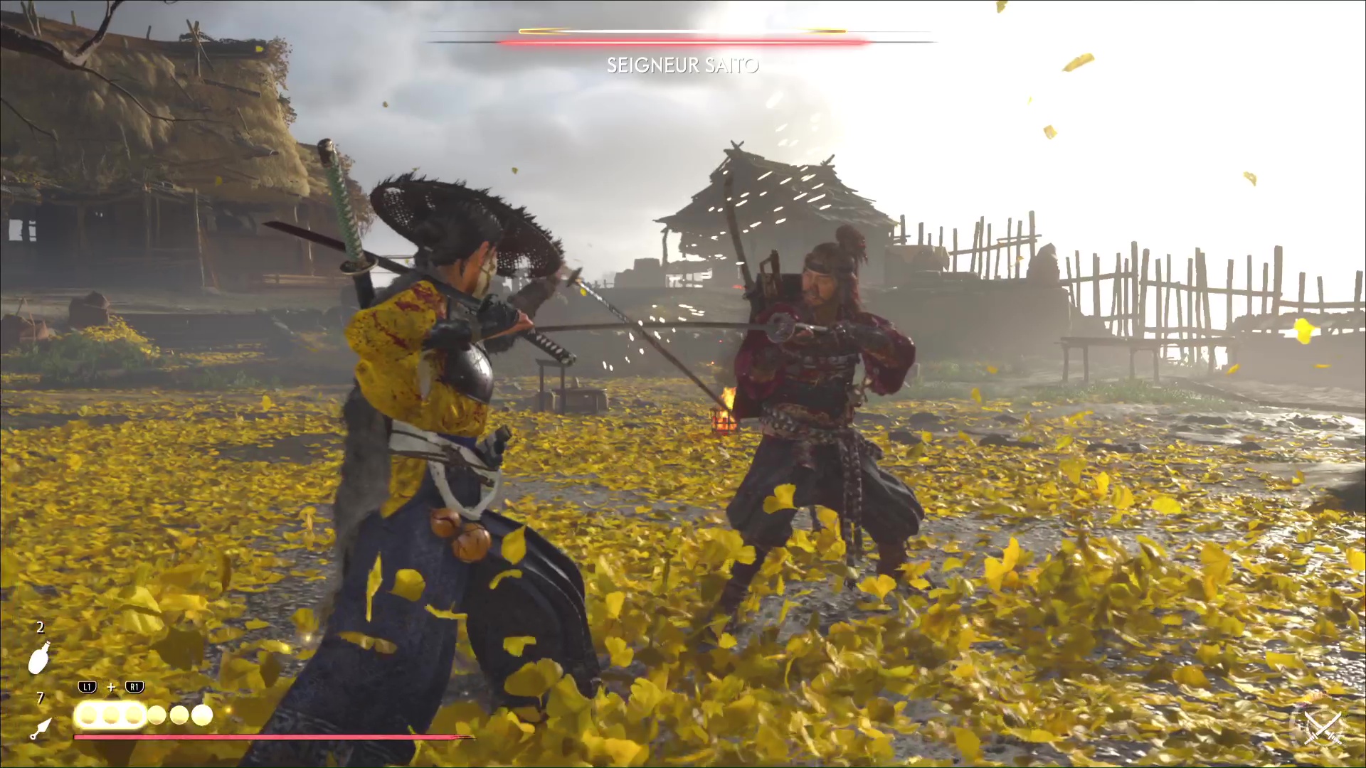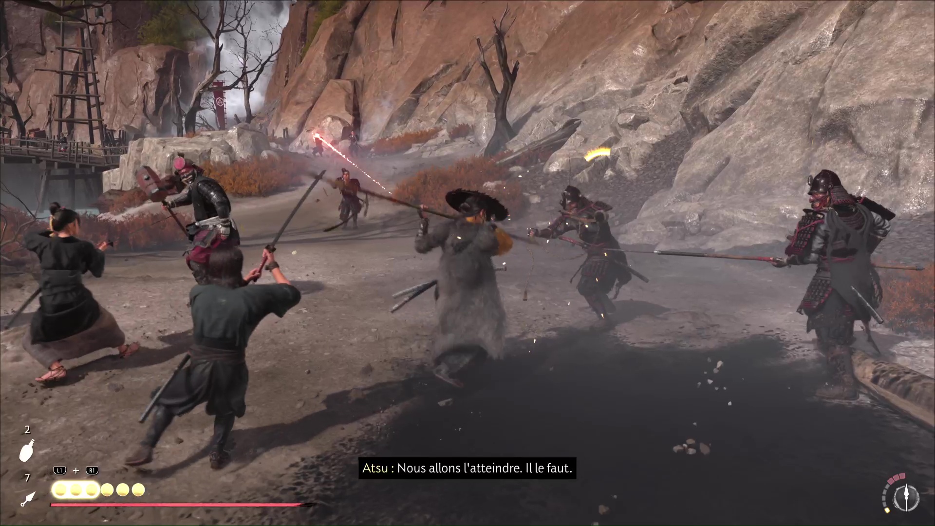 Vient ensuite le bouclier et la faucille. Équipez votre kusarigama et ne tardez pas à briser le bouclier grâce à des attaques lourdes ou via votre attaque d’esprit. Attention aux coups de boucliers symbolisés par une lumière rouge.