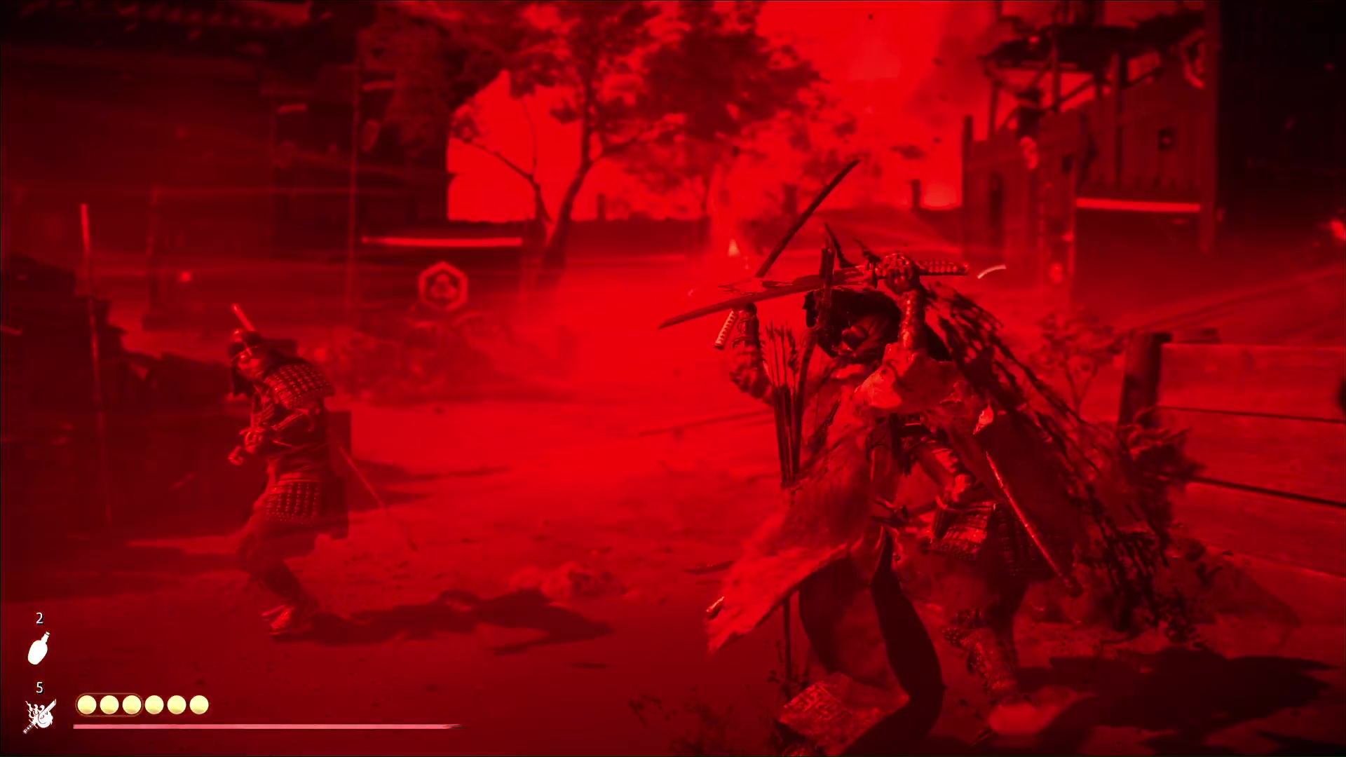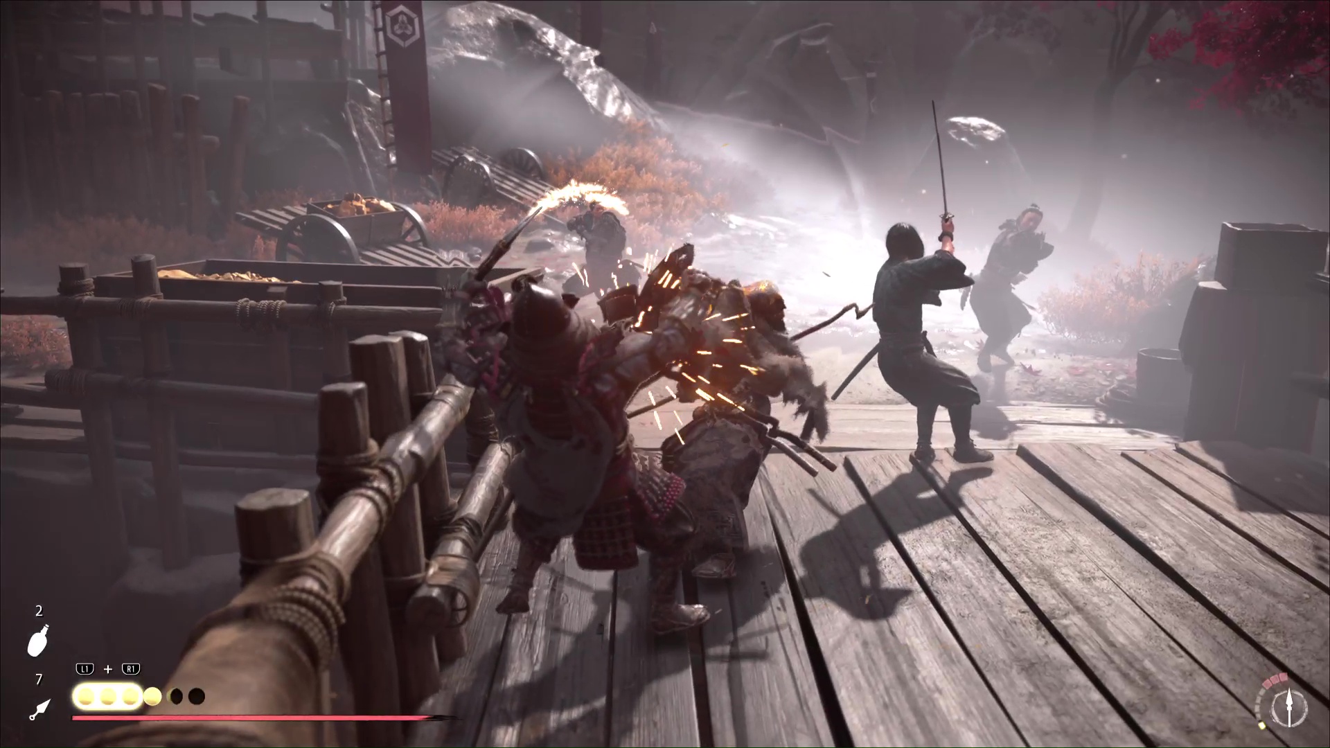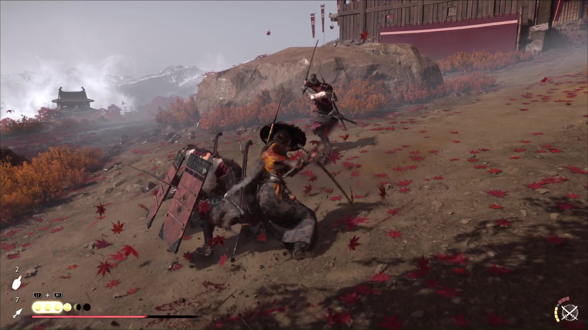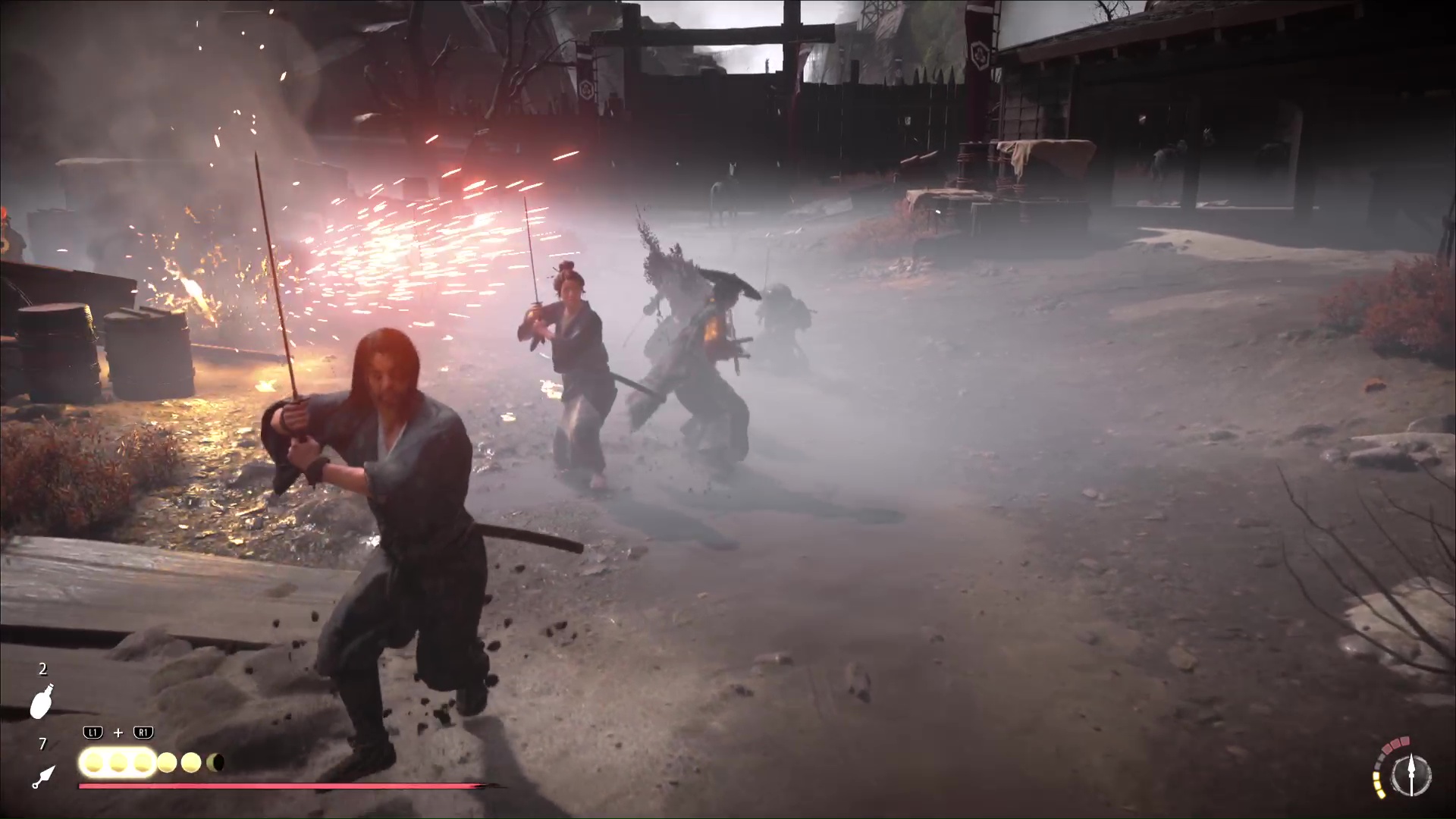 Vient ensuite le bouclier et la faucille. Équipez votre kusarigama et ne tardez pas à briser le bouclier grâce à des attaques lourdes ou via votre attaque d’esprit. Attention aux coups de boucliers symbolisés par une lumière rouge.