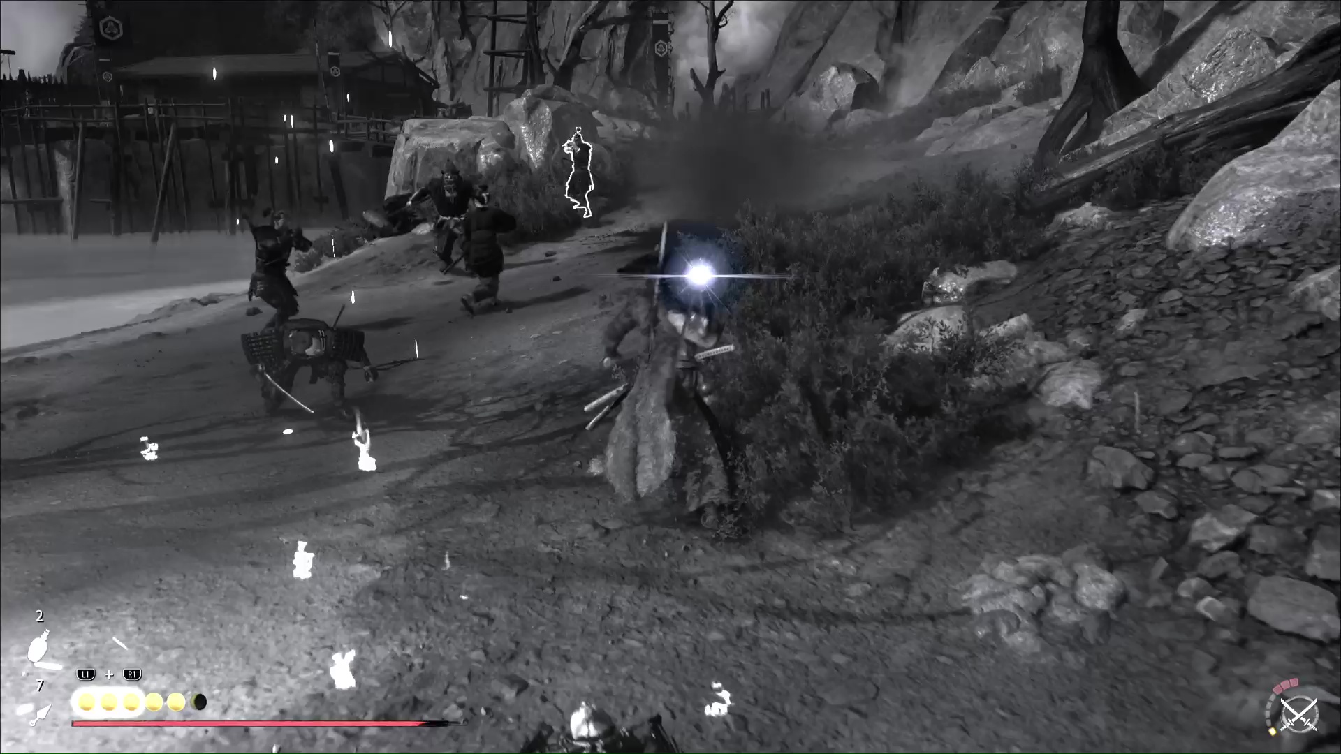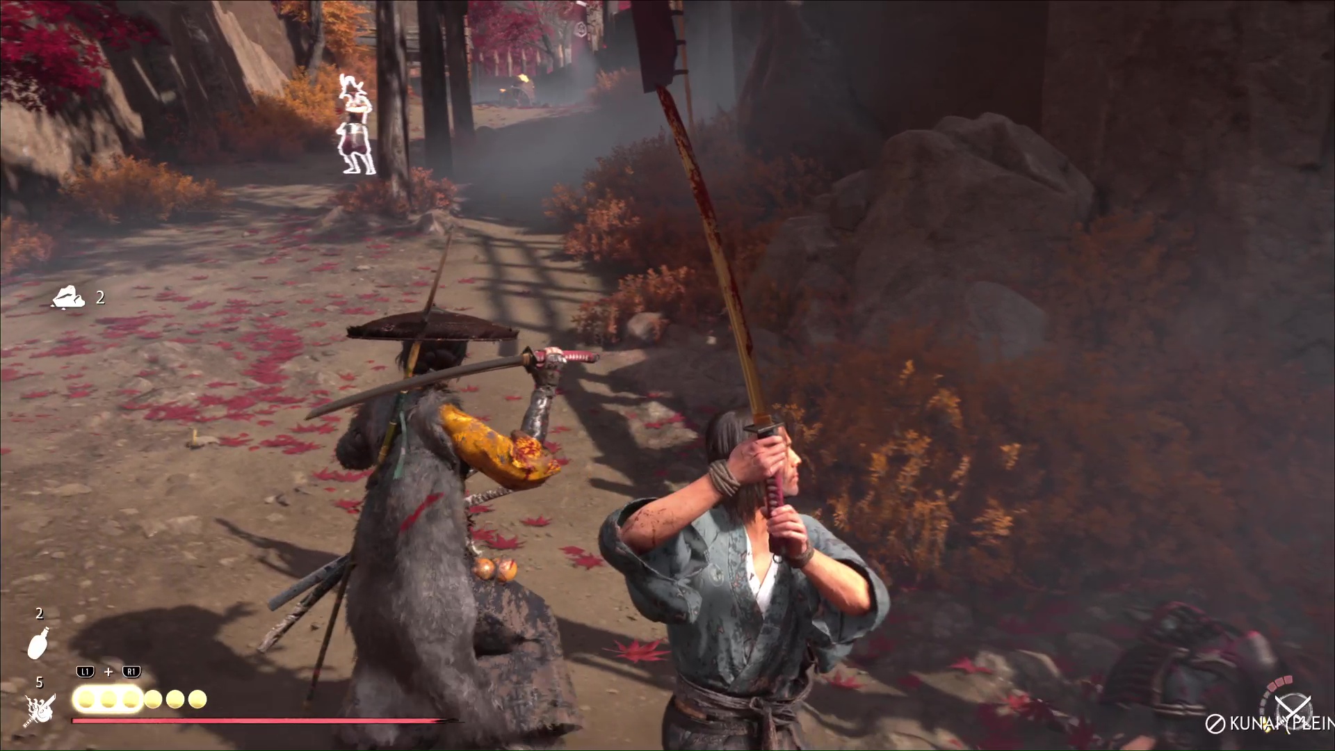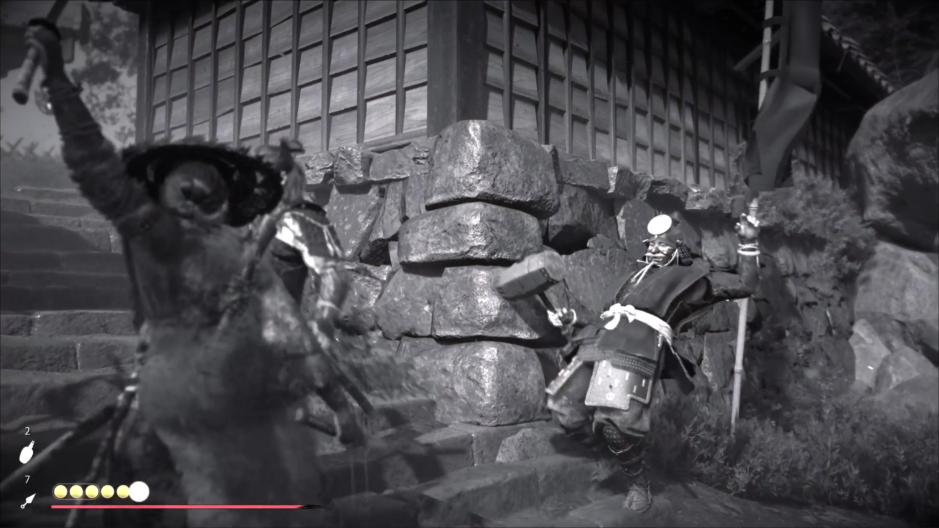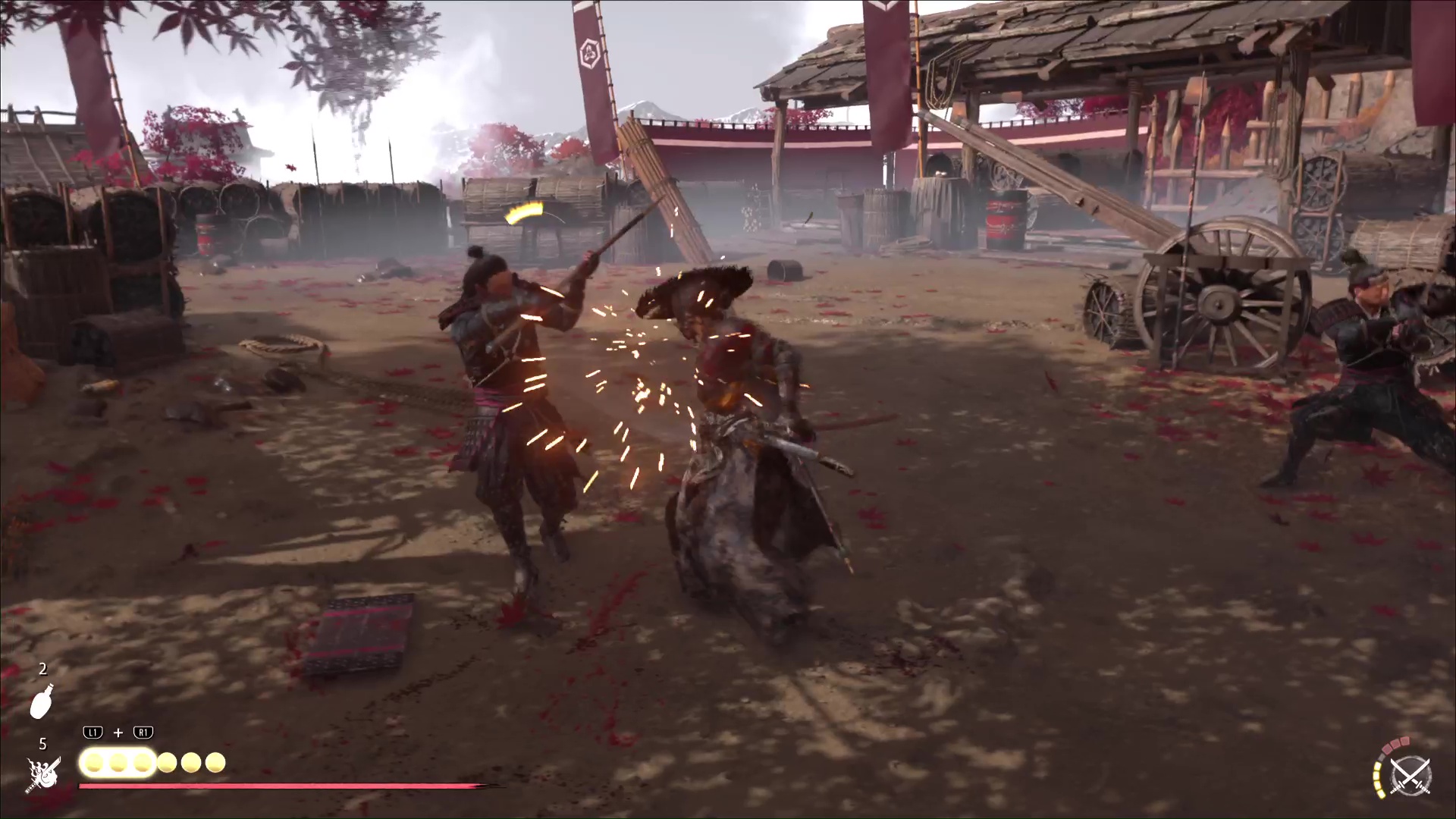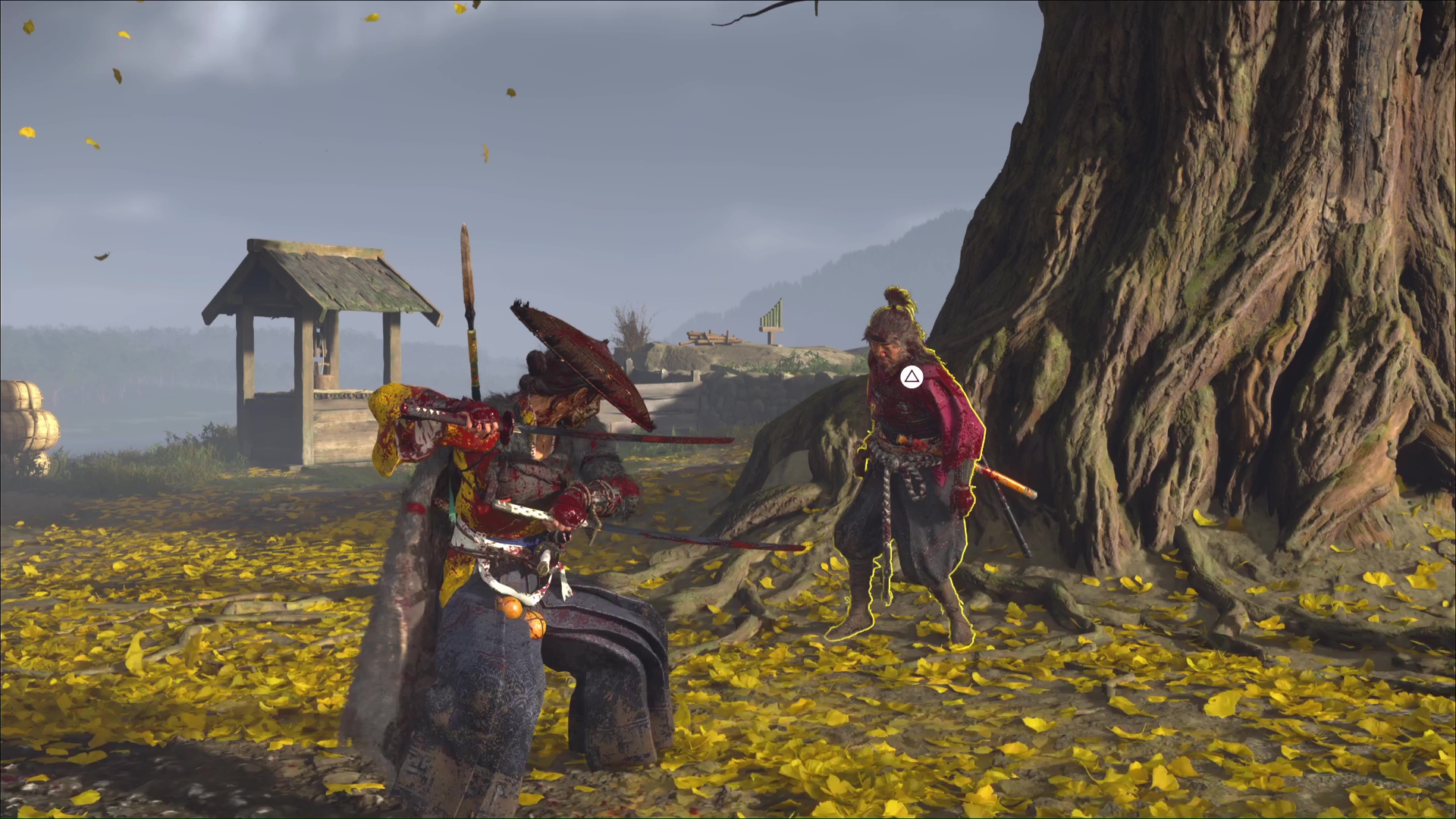 Vient ensuite le bouclier et la faucille. Équipez votre kusarigama et ne tardez pas à briser le bouclier grâce à des attaques lourdes ou via votre attaque d’esprit. Attention aux coups de boucliers symbolisés par une lumière rouge.