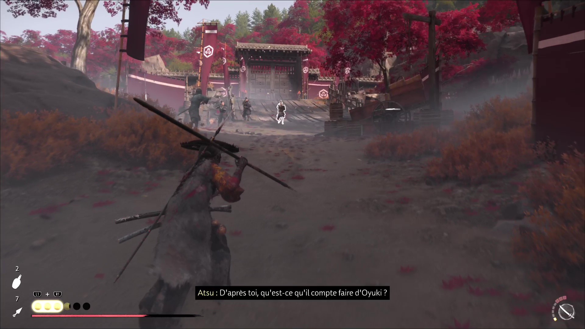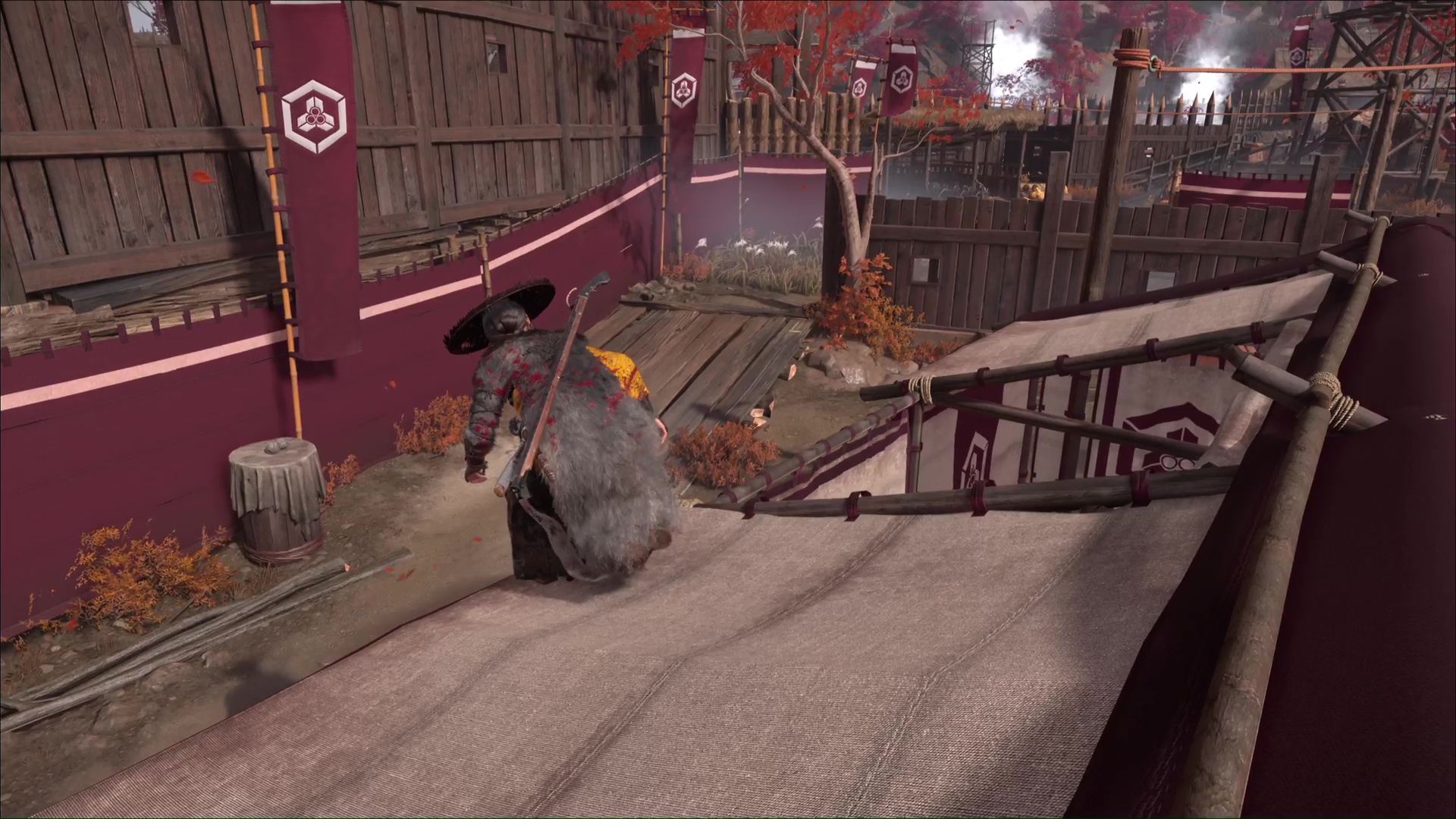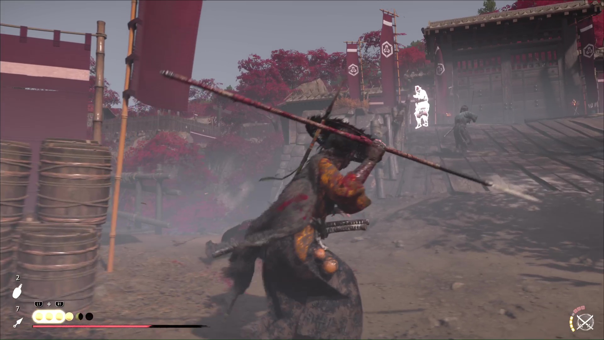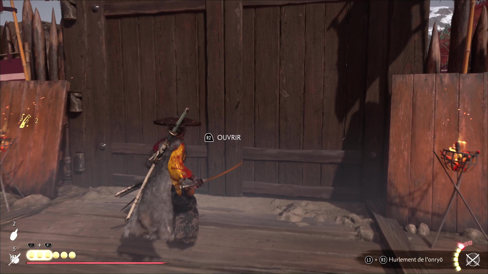 Allez cueillir d’autres ennemis, dont un porteur de kusarigama. Une autre brute au bō-hiya est également dans les parages. Un dernier chemin montant vous sépare de la dernière grande porte à ouvrir du camp.