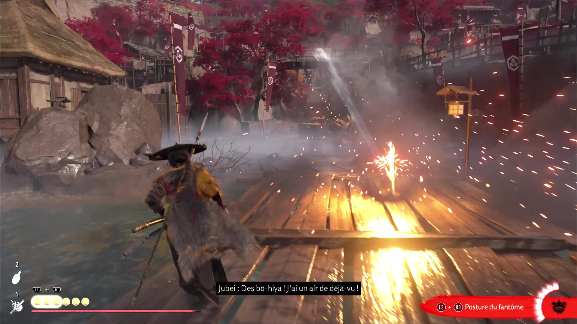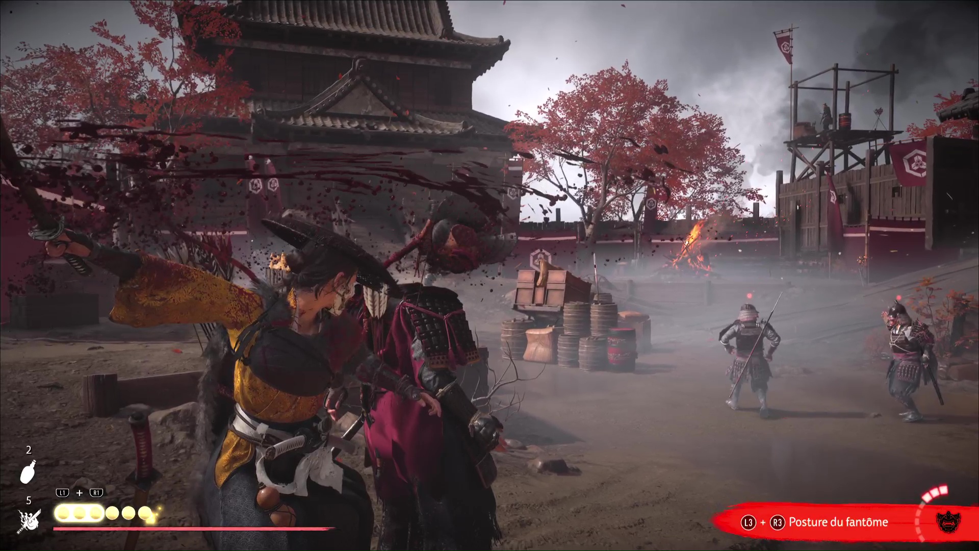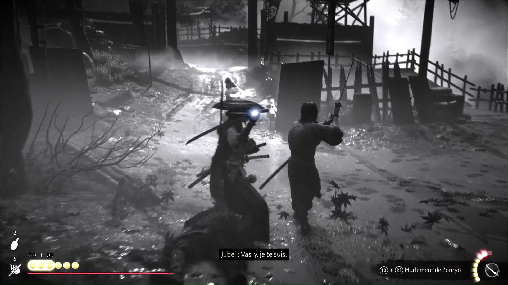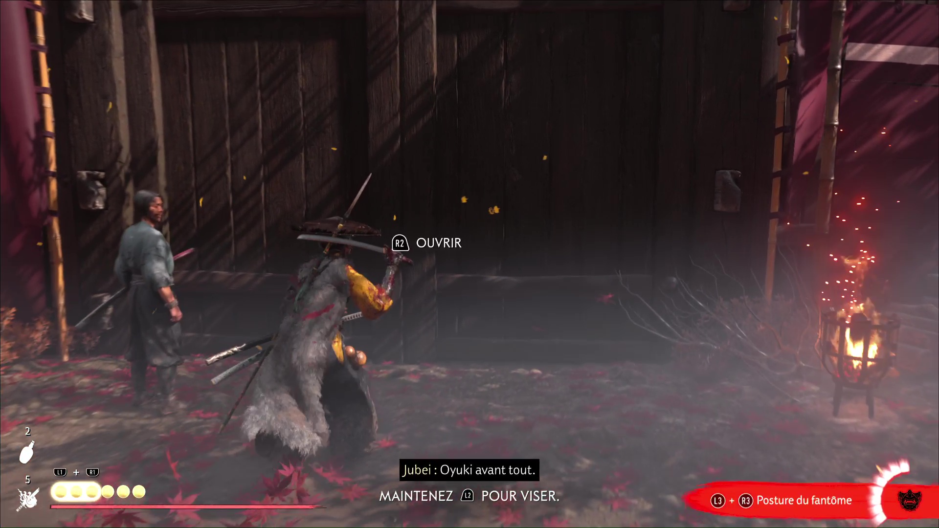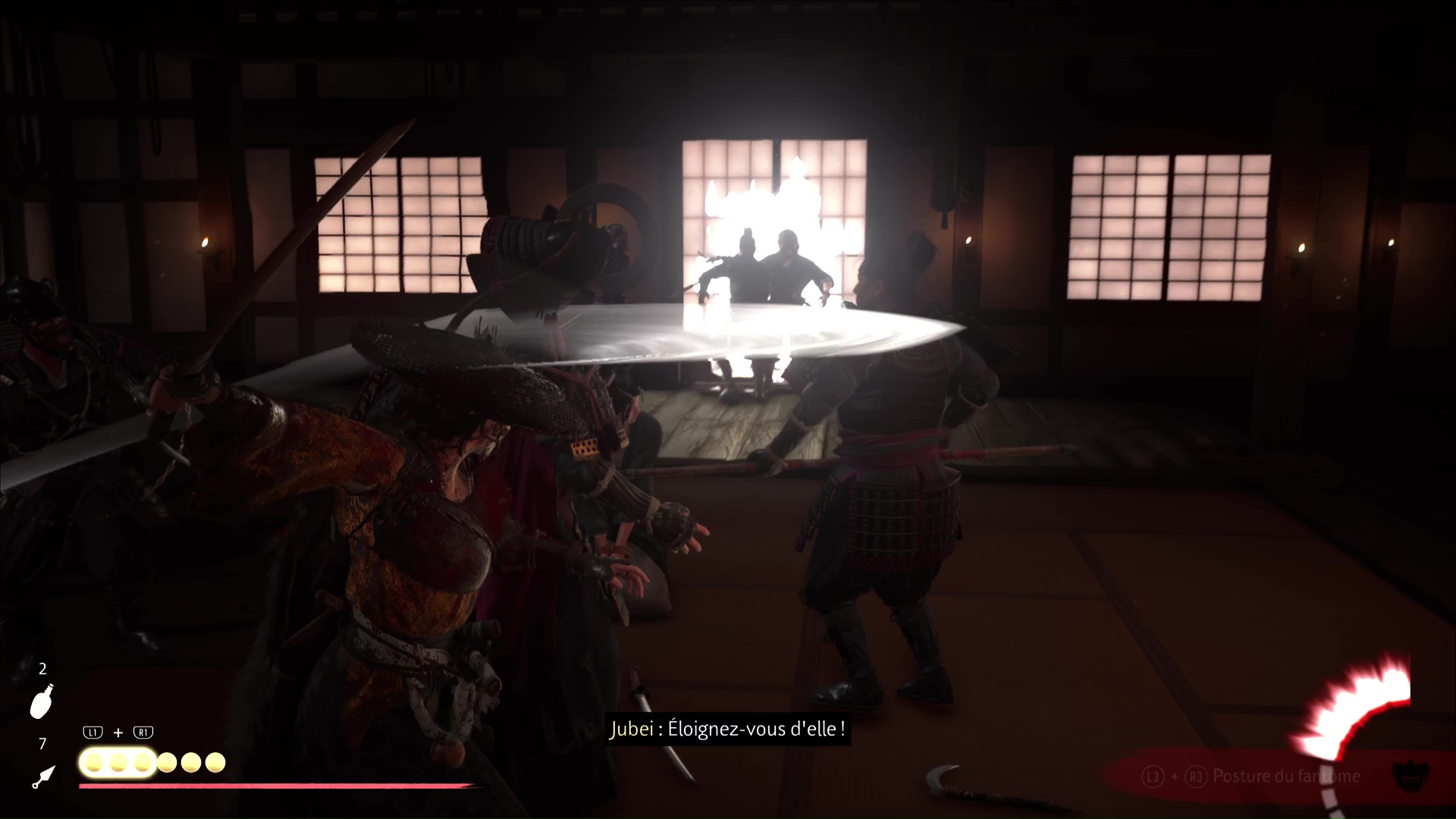 Ouvrez ensuite la prochaine grande porte pour tomber nez à nez avec Jubei et ses ravisseurs. Activez une nouvelle fois la posture du fantôme et tuez trois ennemis pour commencer un nouveau combat.
