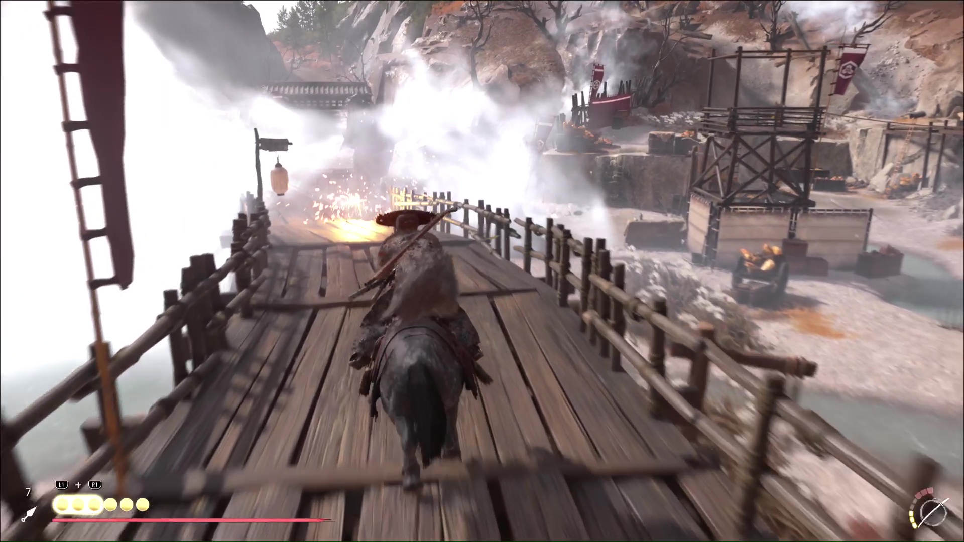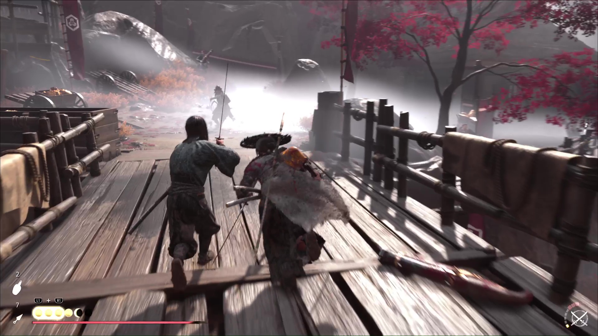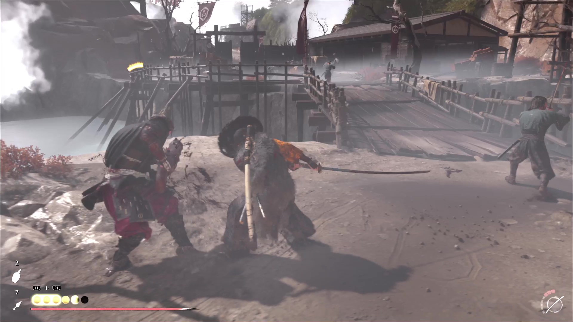 Traversez ensuite le pont et battez les ennemis restants tout en surveillant les tirs de bō-hiya qui pourraient tomber près de votre position.