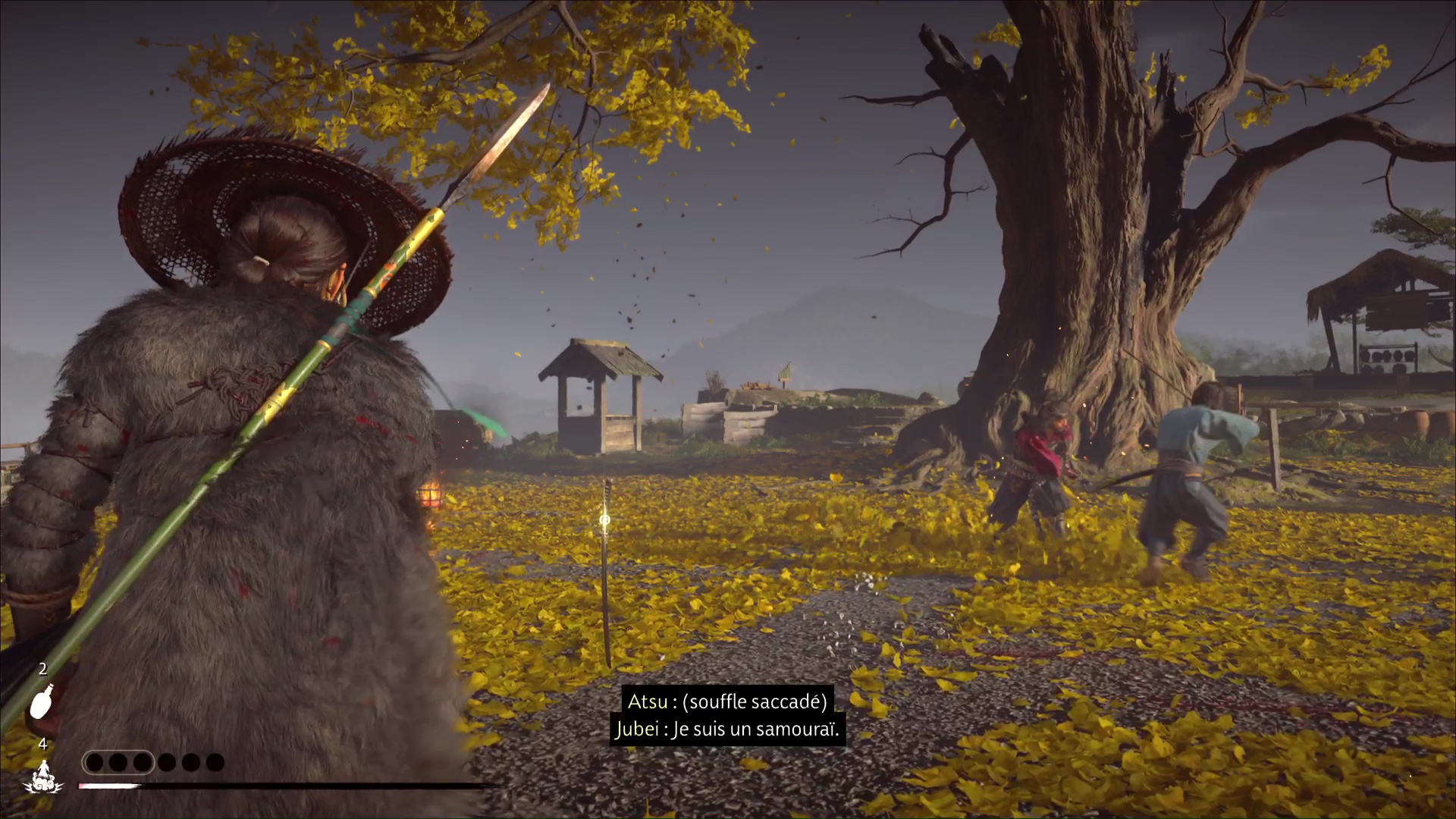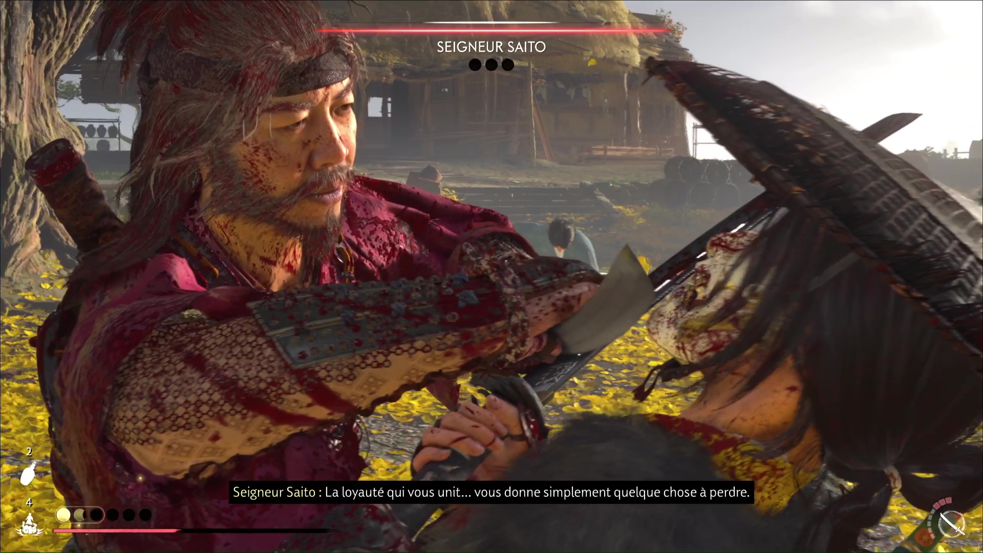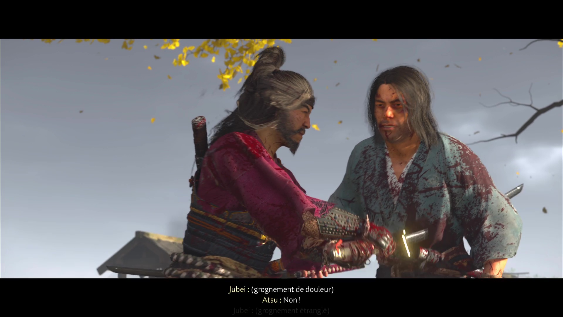 Atsu ramasse le sabre de Saito, et vous n’aurez plus qu’à l’embrocher contre l’arbre, tout comme Atsu avait été laissée pour morte il y a 16 ans. Et alors que le seigneur rend son dernier souffle, c’est hélas aussi le cas de Jubei.