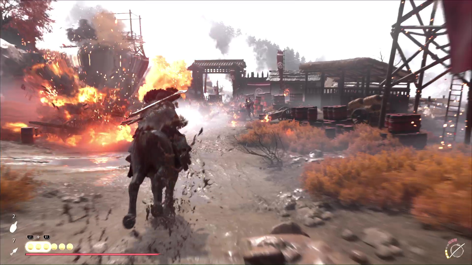 Quelques foulées plus tard, un autre barrage vous attend. Cette fois, sortez votre fusil et visez les tonneaux à côté d’eux pour créer une gigantesque explosion. La voie désormais libre, foncez et slalomez entre les tirs de bō-hiya tout en rejoignant la sortie de la forteresse.