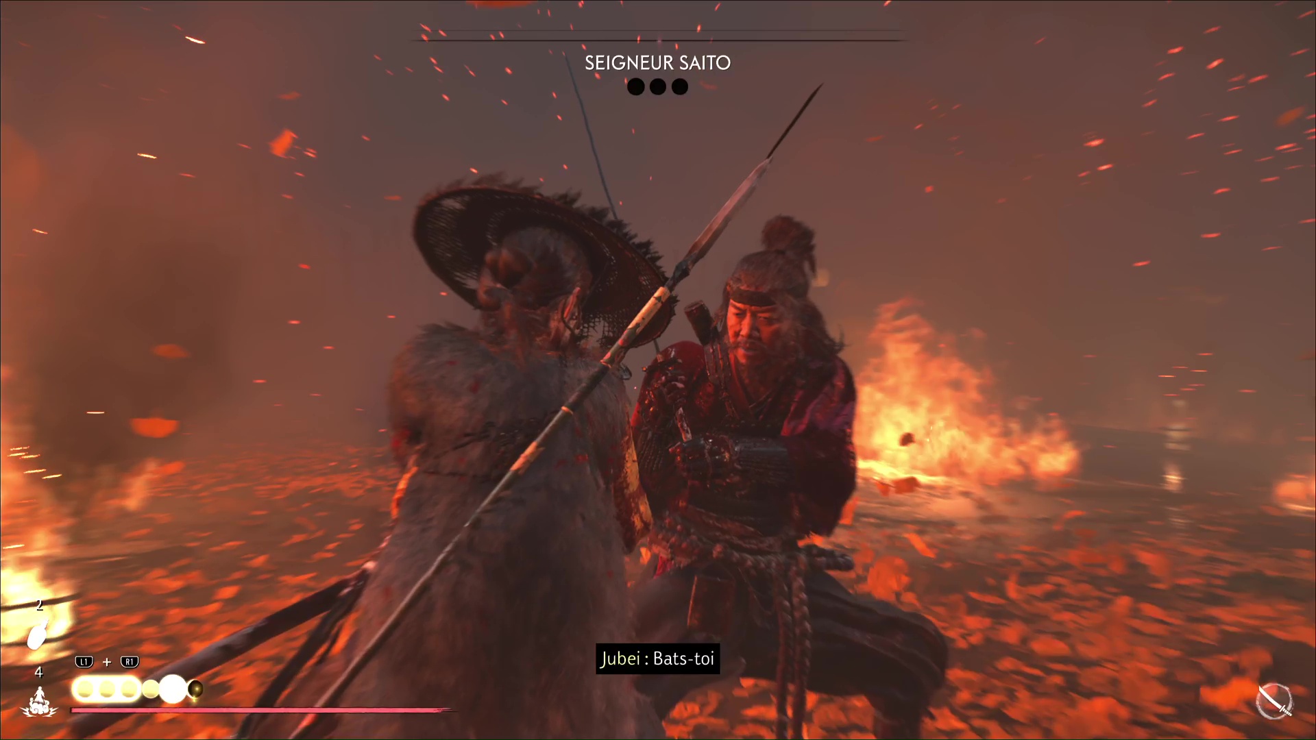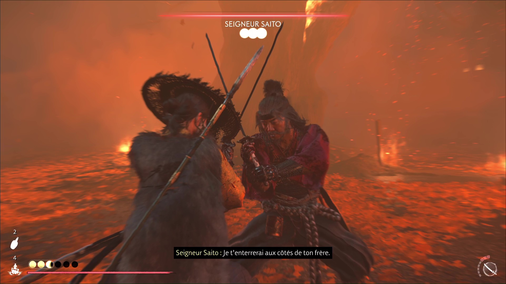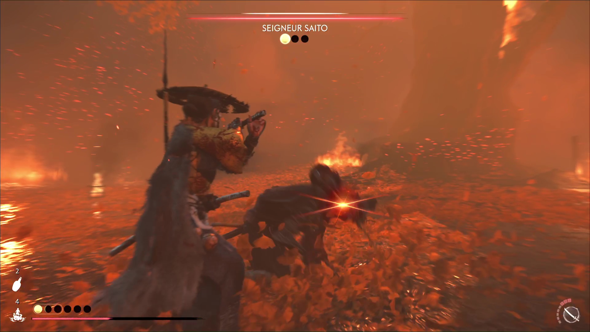 Vous le savez grâce à Hanbei, Saito maîtrise toutes les armes. Et si vous avez récupérez les différentes armes et suivi les enseignements des différents sensei du jeu, vous disposerez à chaque fois de la bonne arme à utiliser contre lui.