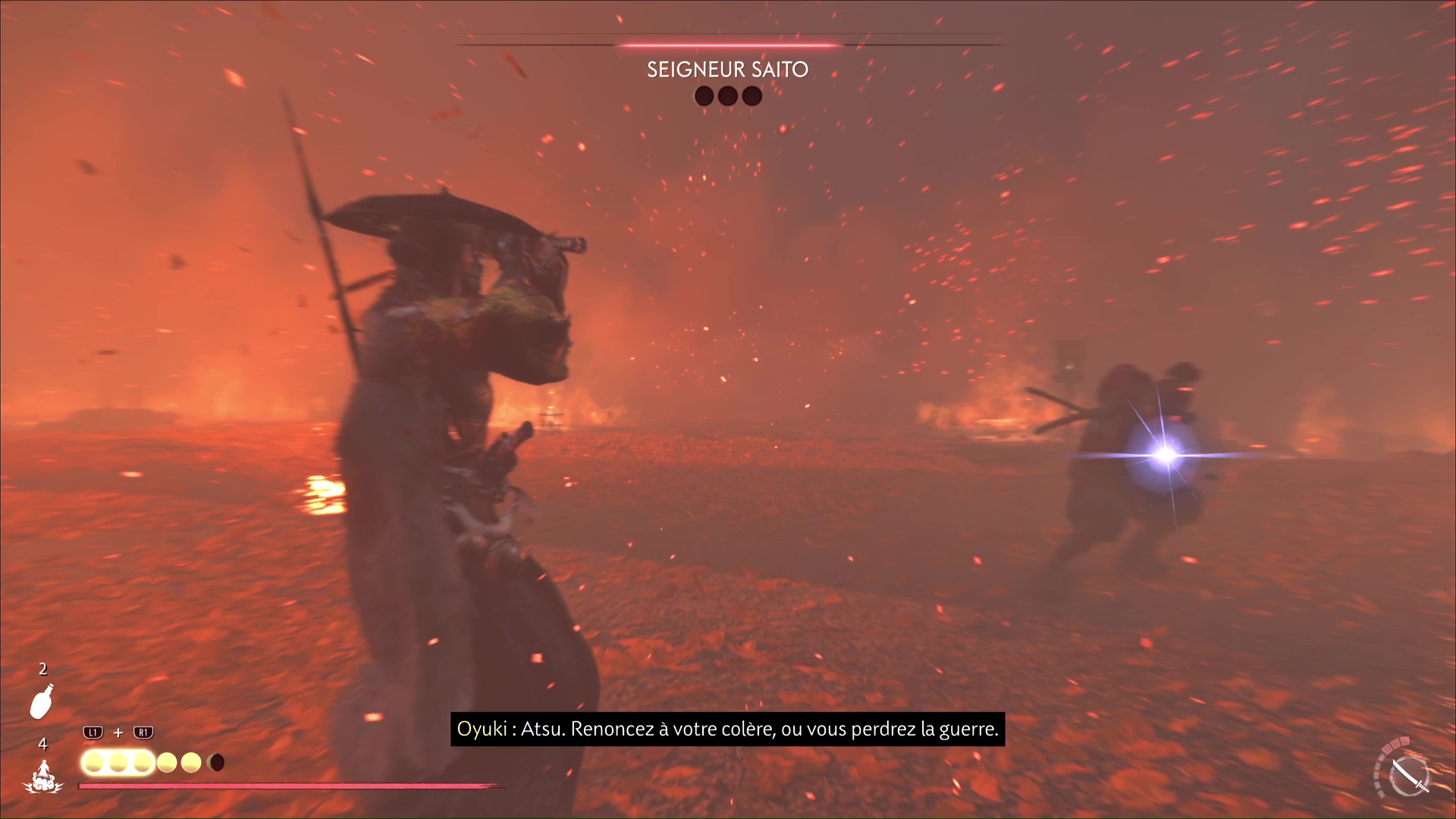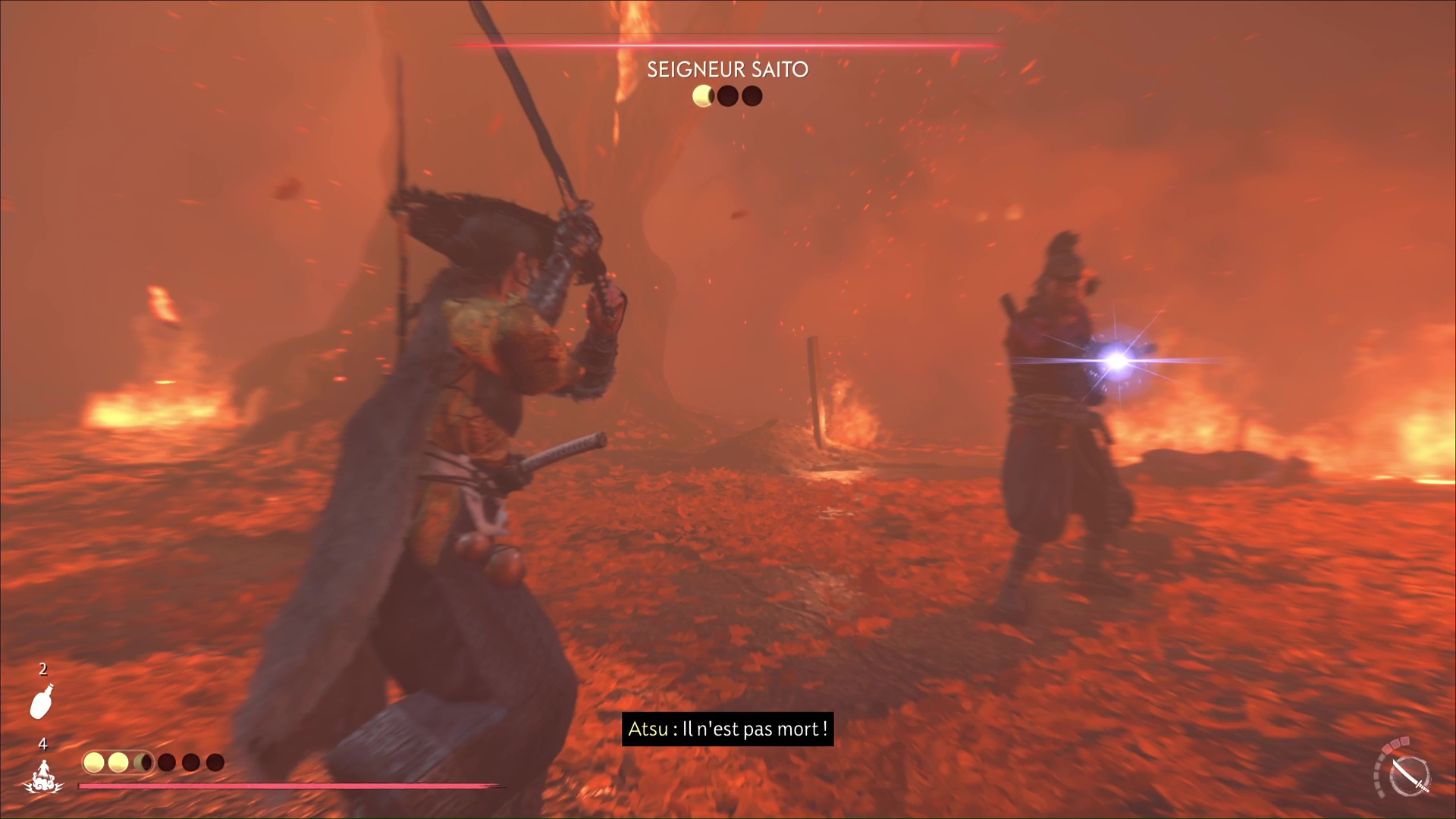 De retour aux commandes d’Atsu, tentez de récupérer votre sabre. Dès qu’il est à nouveau en votre possesion, repartez à l’attaque. Au bout de quelques échanges de coups d’épée, Atsu sera de nouveau en difficulté.