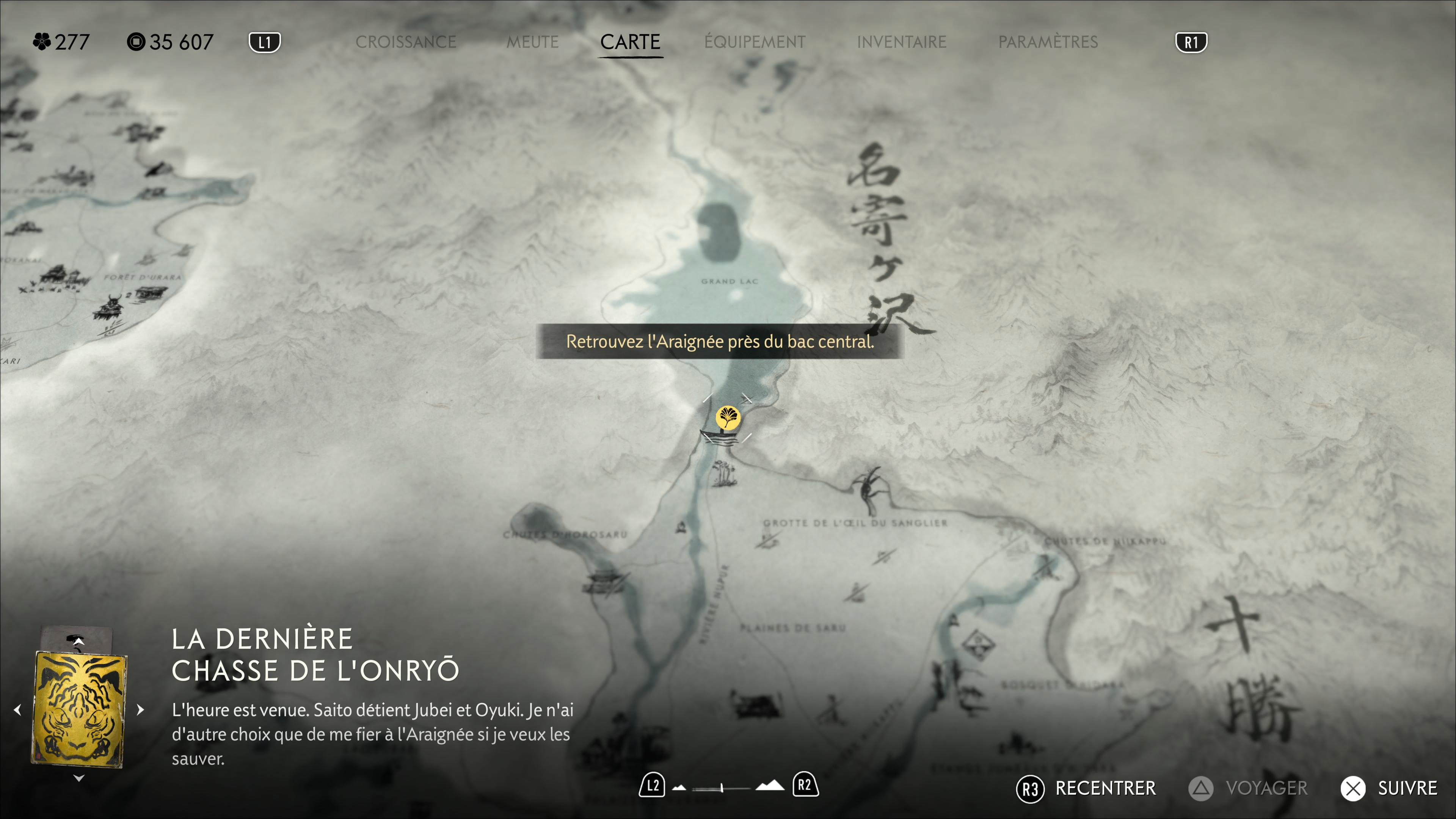 Au terme d’un « Appel de la chasse » auquel Atsu a évidemment répondu, la piste menant à Saito s’est réchauffée. Le moment est venu de se rendre au Bac central des Monts Tokachi pour prendre le bateau. Grâce à l’Araignée, elle va enfin pouvoir atteindre Saito et ainsi libérer Oyuki et Jubei. Vous le trouverez juste à côté de l’entrée du Sanctuaire du brouillard levant.