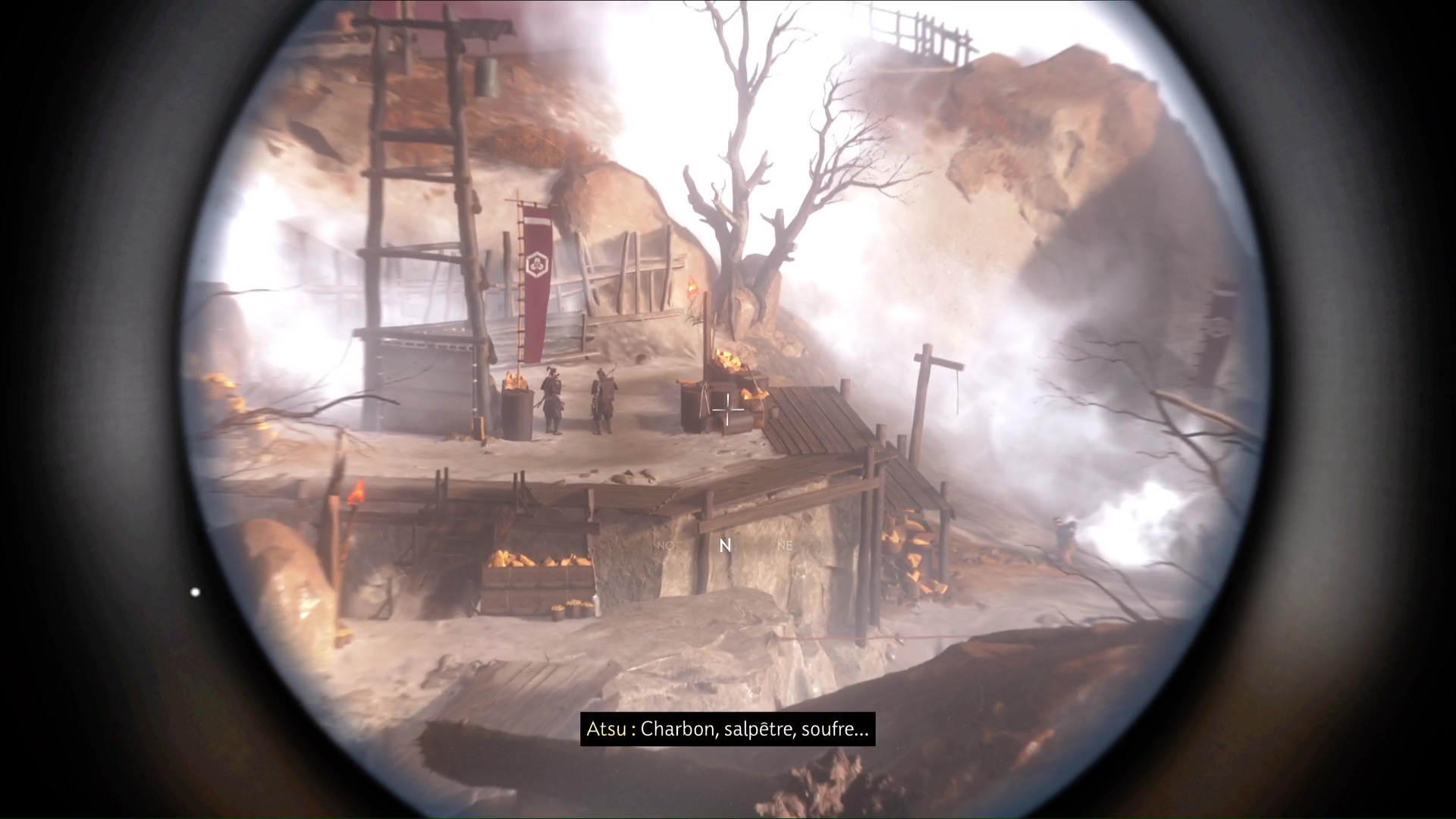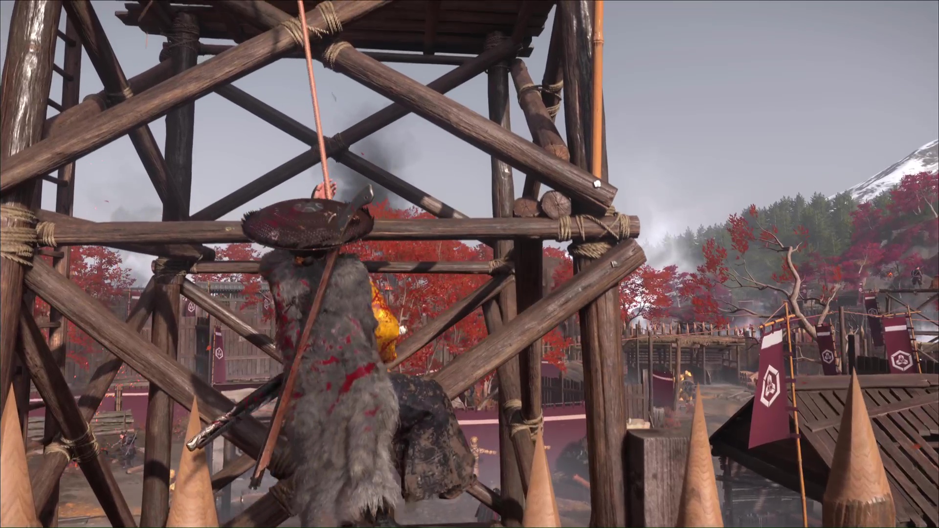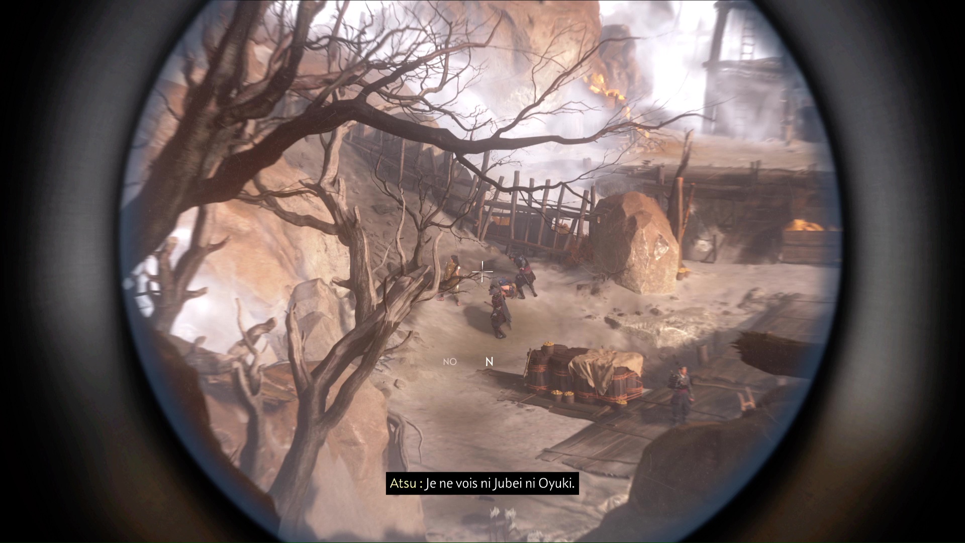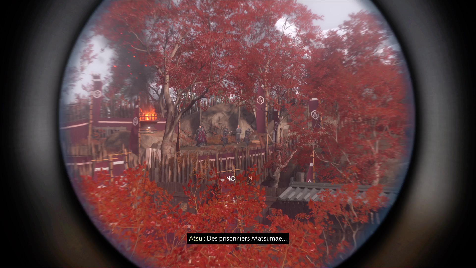 Vous pourrez ensuite marcher sur un arbre mort qui vous mènera à une tour de guet. Sautez et accrochez-vous-y pour la rejoindre. Vous voici en mesure d’observer le camp. Sortez la longue-vue et examinez les prisonniers Matsumae en train de se faire exécuter.