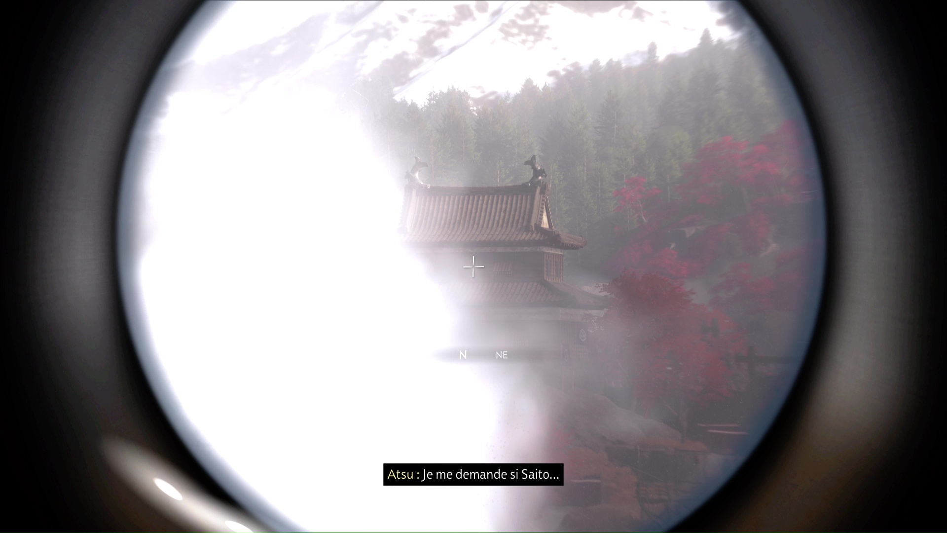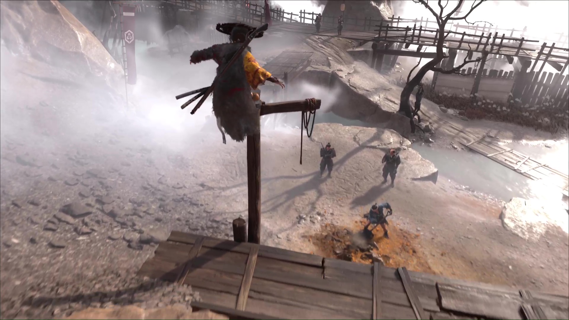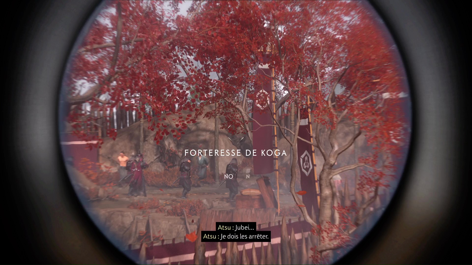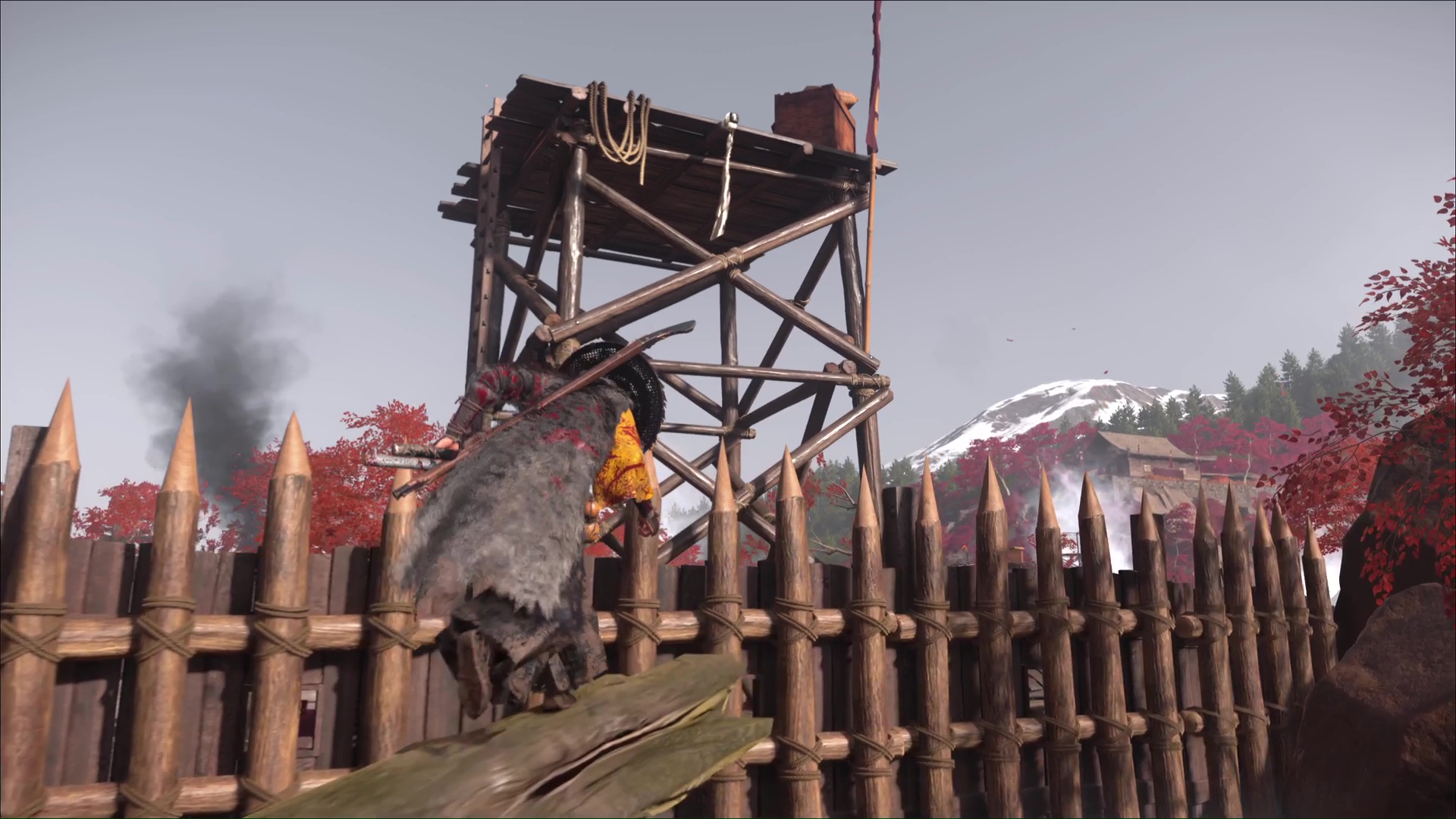 Vous pourrez ensuite marcher sur un arbre mort qui vous mènera à une tour de guet. Sautez et accrochez-vous-y pour la rejoindre. Vous voici en mesure d’observer le camp. Sortez la longue-vue et examinez les prisonniers Matsumae en train de se faire exécuter.
