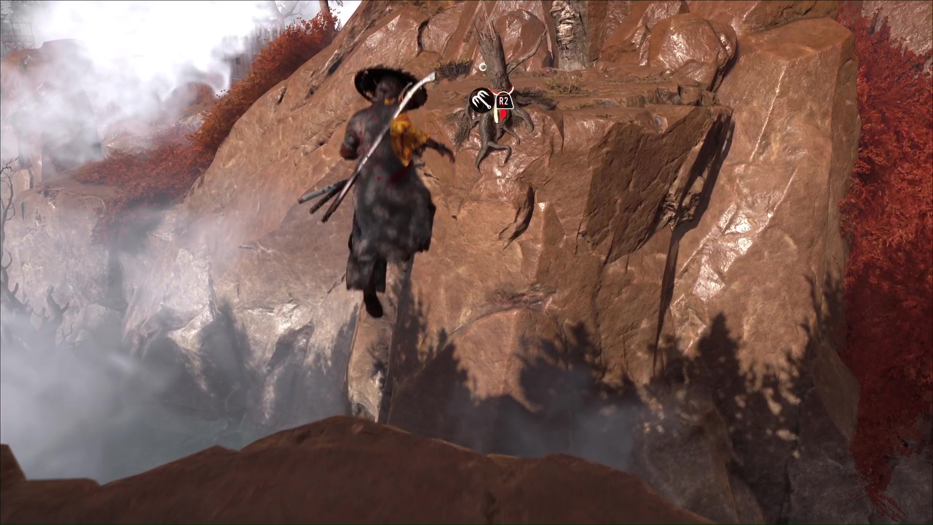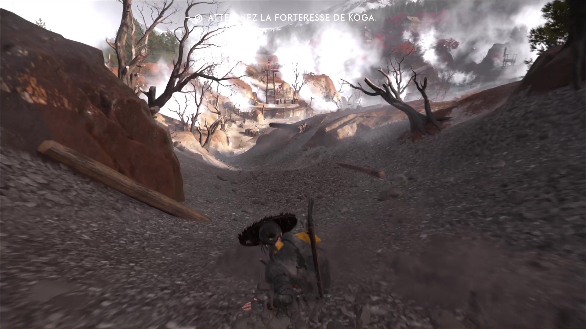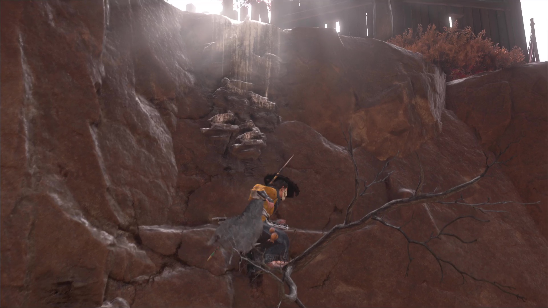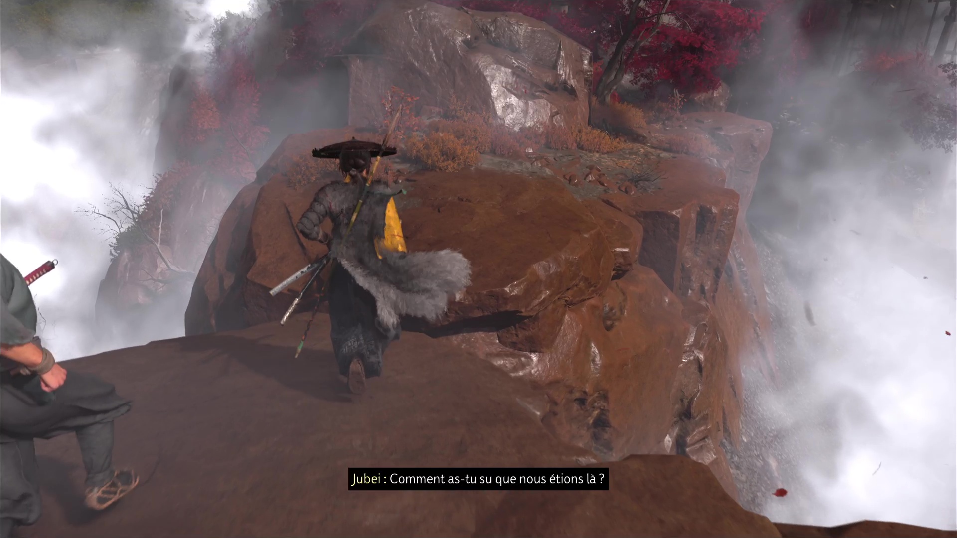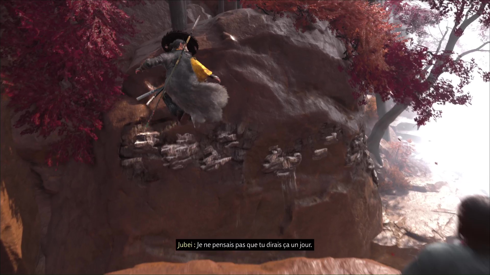 Au bout de ce chemin, sautez au grappin vers des prises rocheuses. Hissez-vous puis, sur la gauche, accrochez-vous à un tronc à grappin. Continuez avec un peu de grimpette.