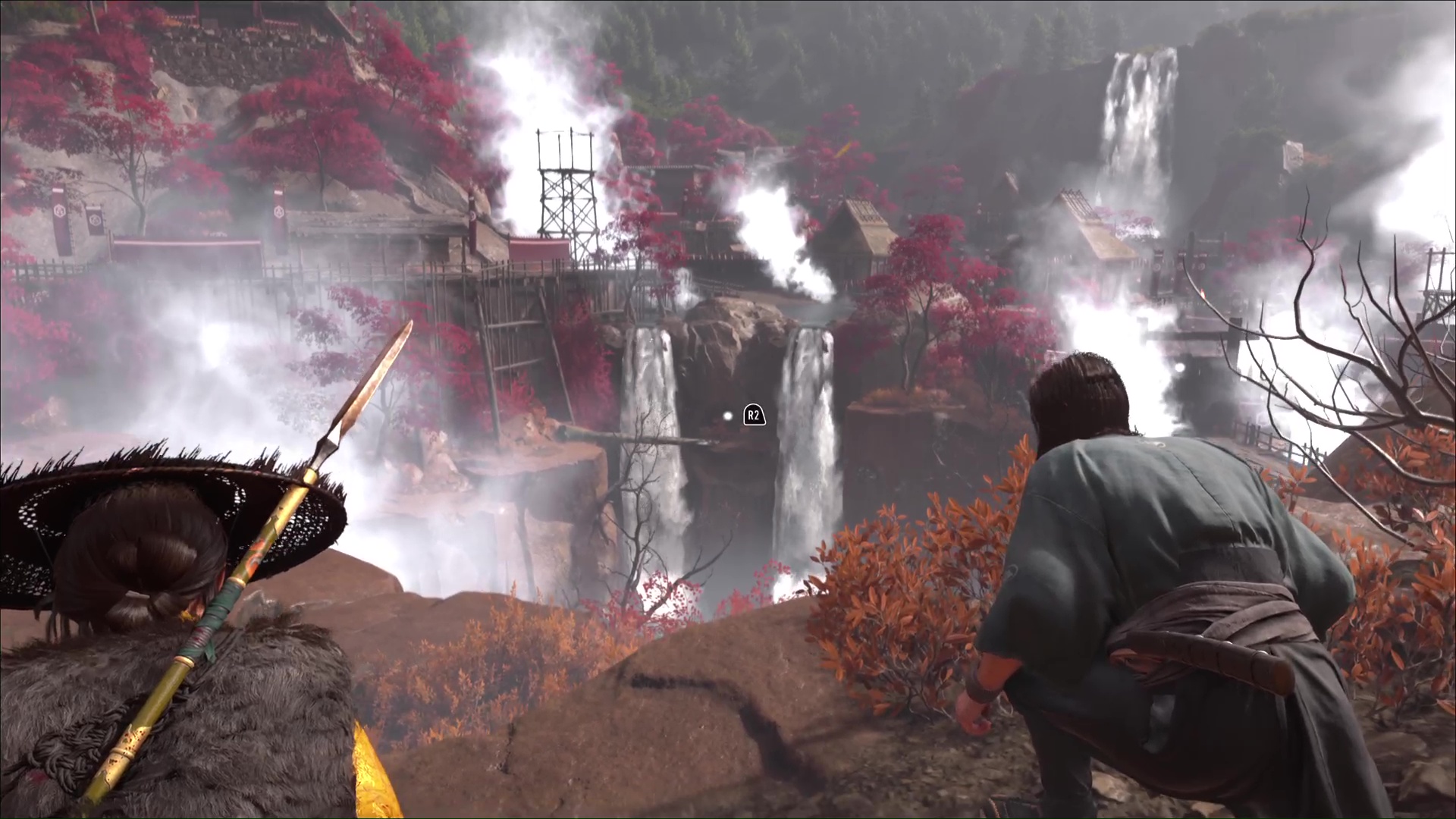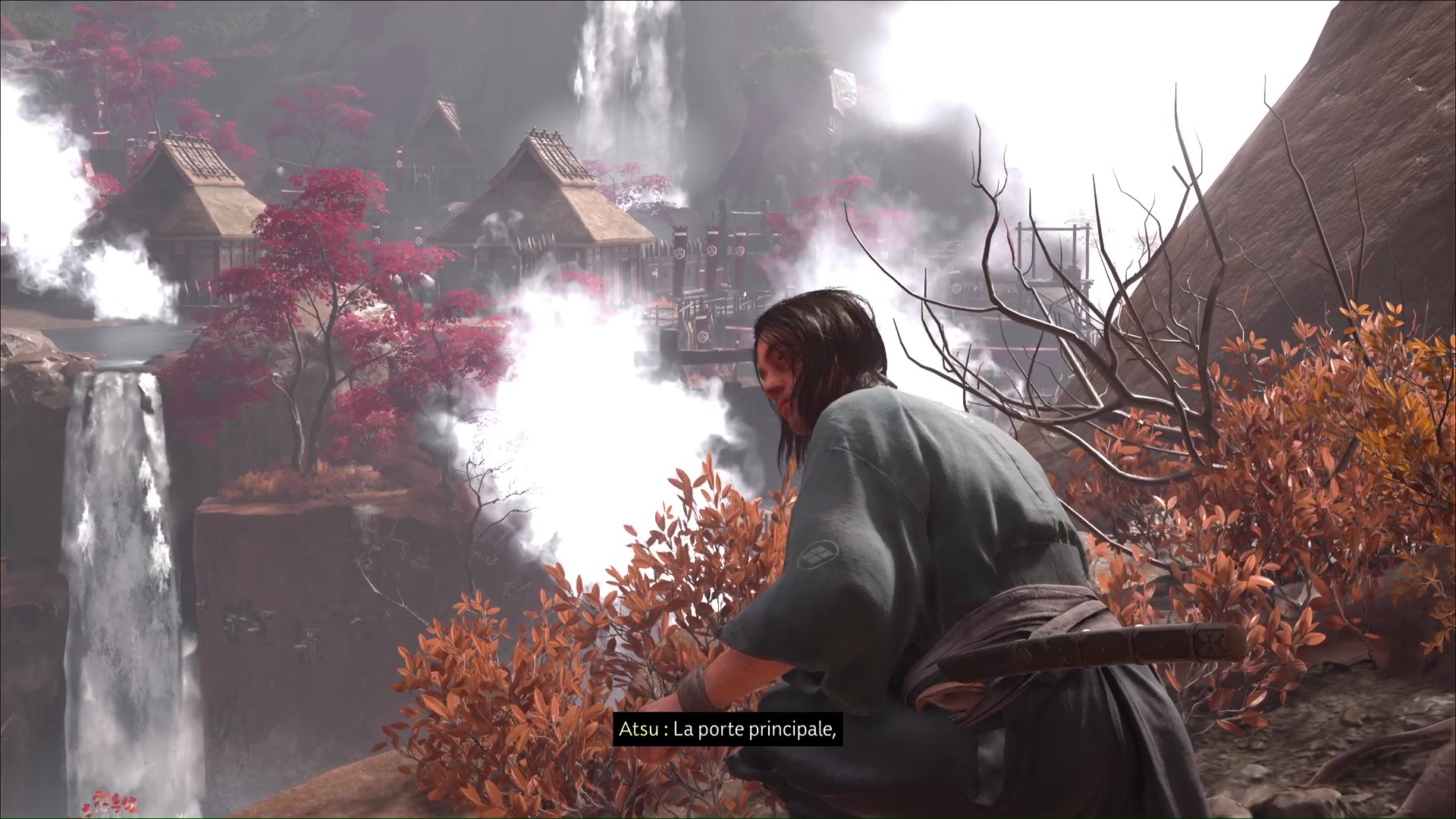 Suivez ensuite Jubei en passant à travers la brèche dans la barrière. De l’autre côté, regardez le donjon, droit devant vous. Pour trouver un moyen d’y accéder, tournez la tête sur la droite, vers les cascades, pour repérer un itinéraire. Enfin, encore plus à droite, vous apercevez la porte principale.