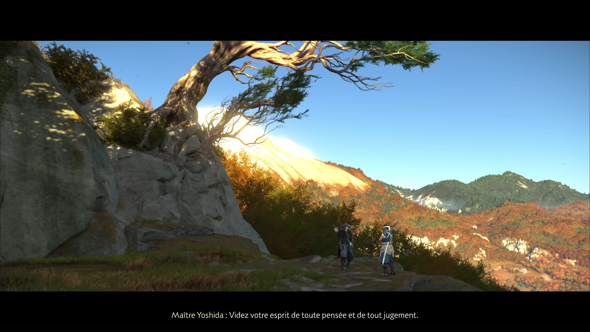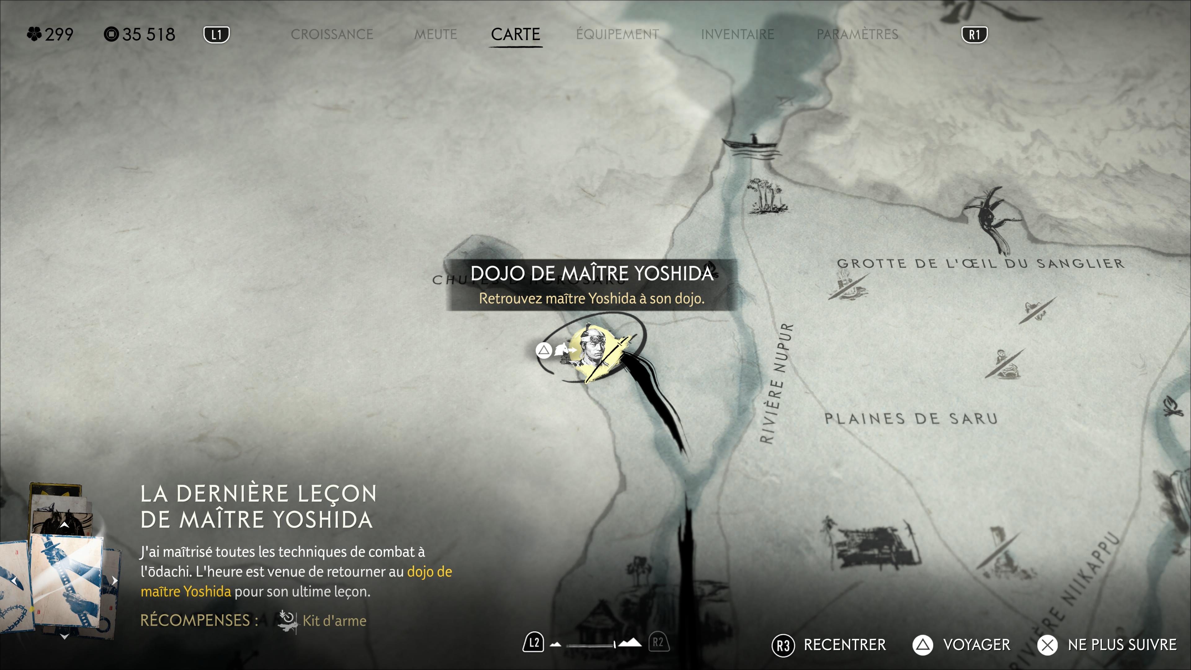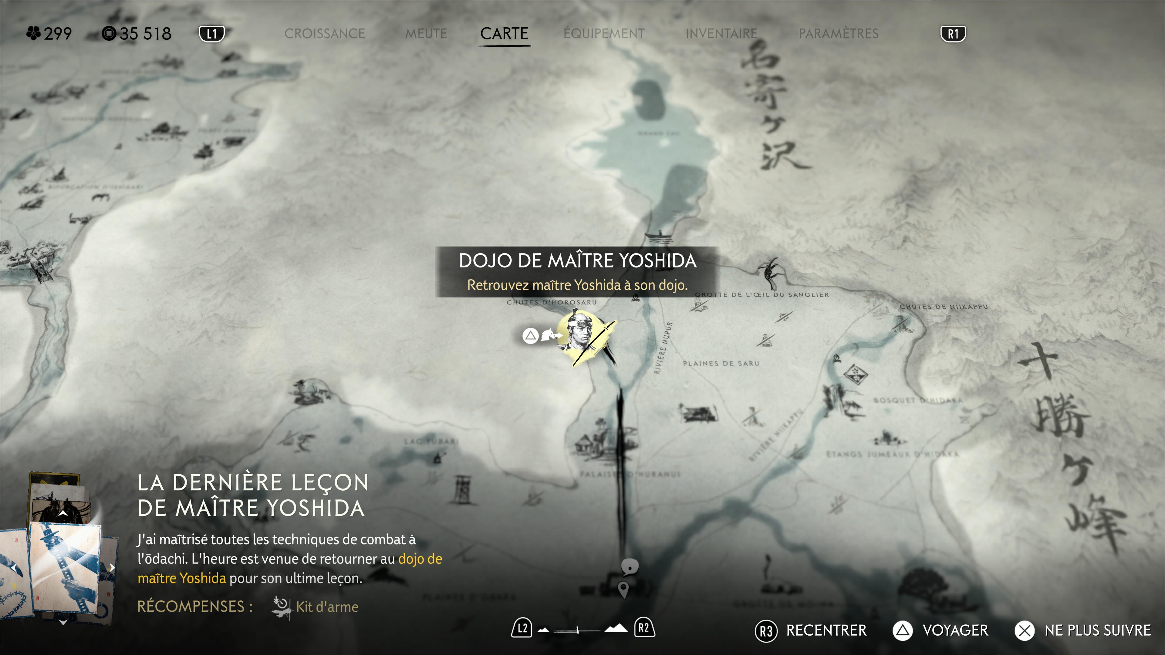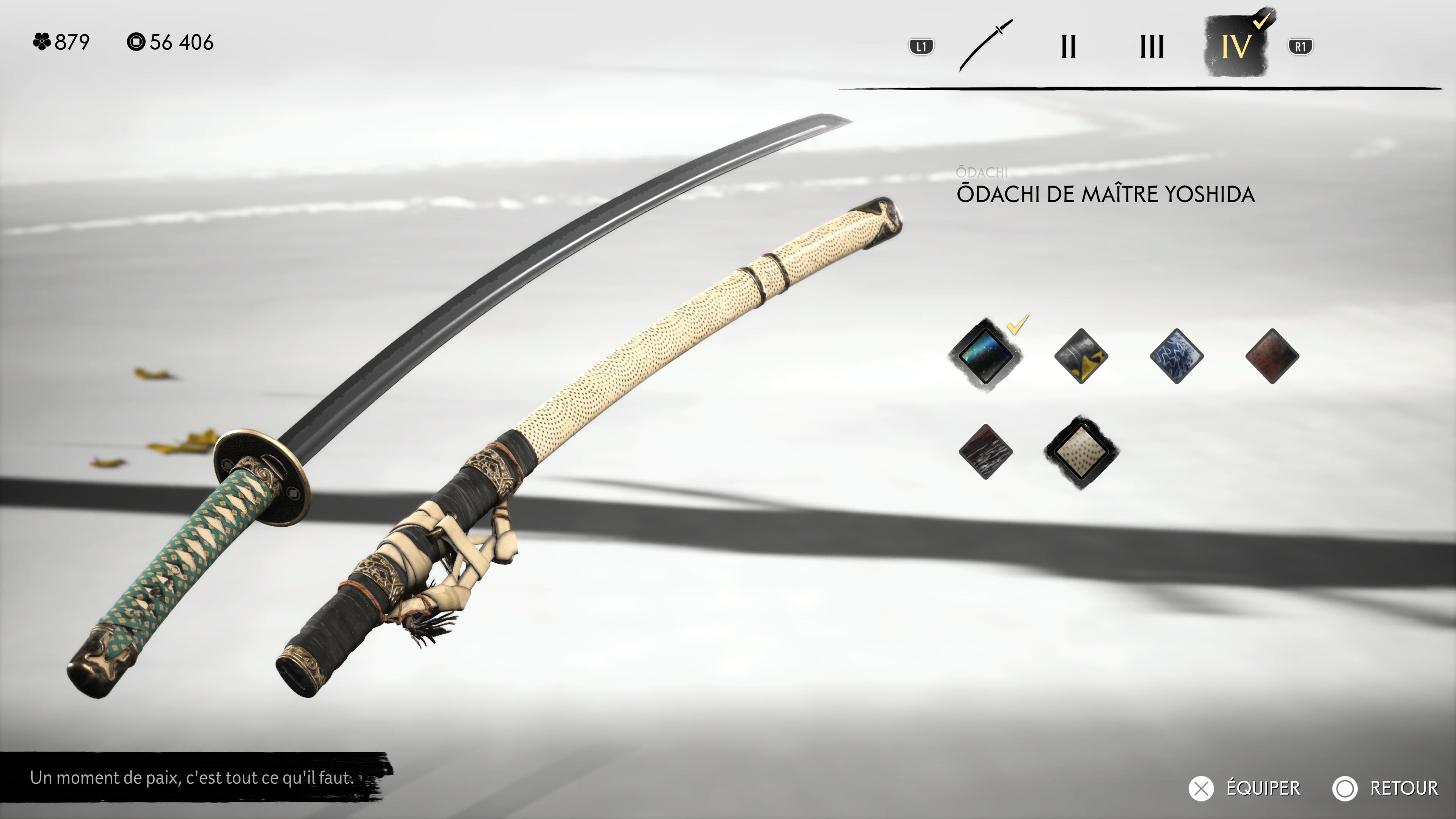 Vous allez donc vous assoir et méditer. Ce sera à vous de choisir quand prendra fin la méditation. Une fois celle-ci achevée, Yoshida vous fera don de l’Ōdachi de maître Yoshida, un skin supplémentaire pour votre sabre géant. Enfin, les adieux seront faits au dojo, clôturant l’arc narratif avec Yoshida.