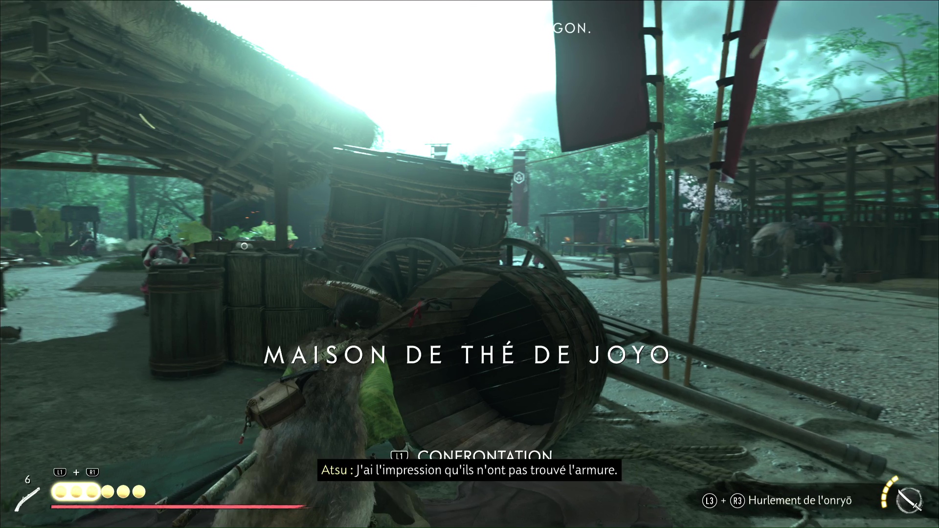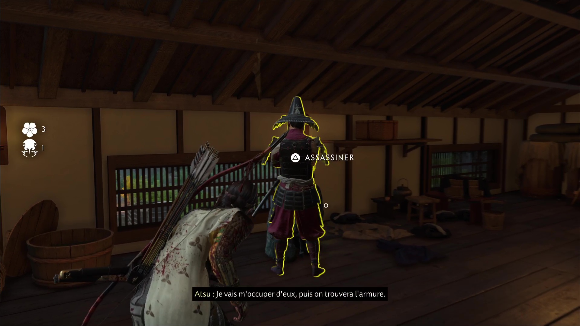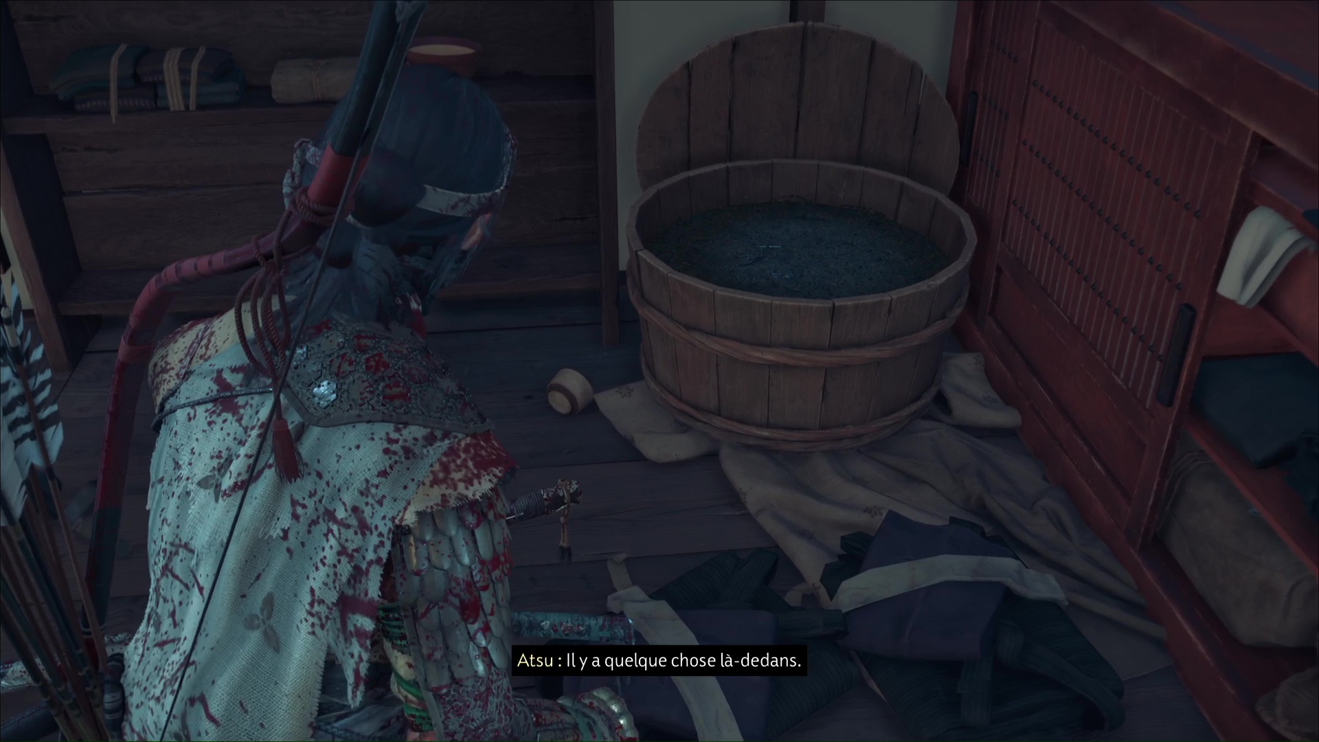 Le plan est simple : monter dans un tonneau pour être amené incognito jusqu’à destination et ainsi éliminer les soldats. En échange, Atsu veut l’armure. Après quelques minutes passées dans le tonneau, Atsu revient à l’air libre, comme prévu, à la maison de thé.