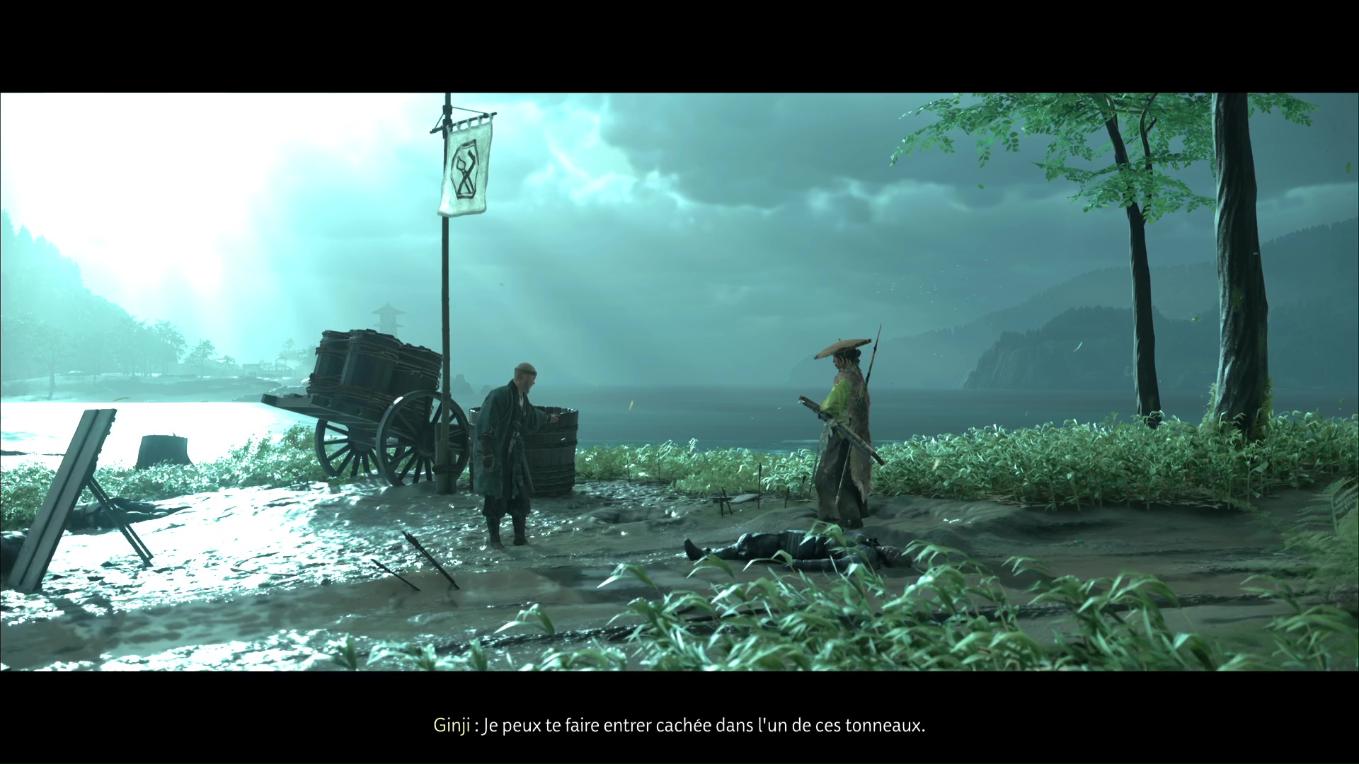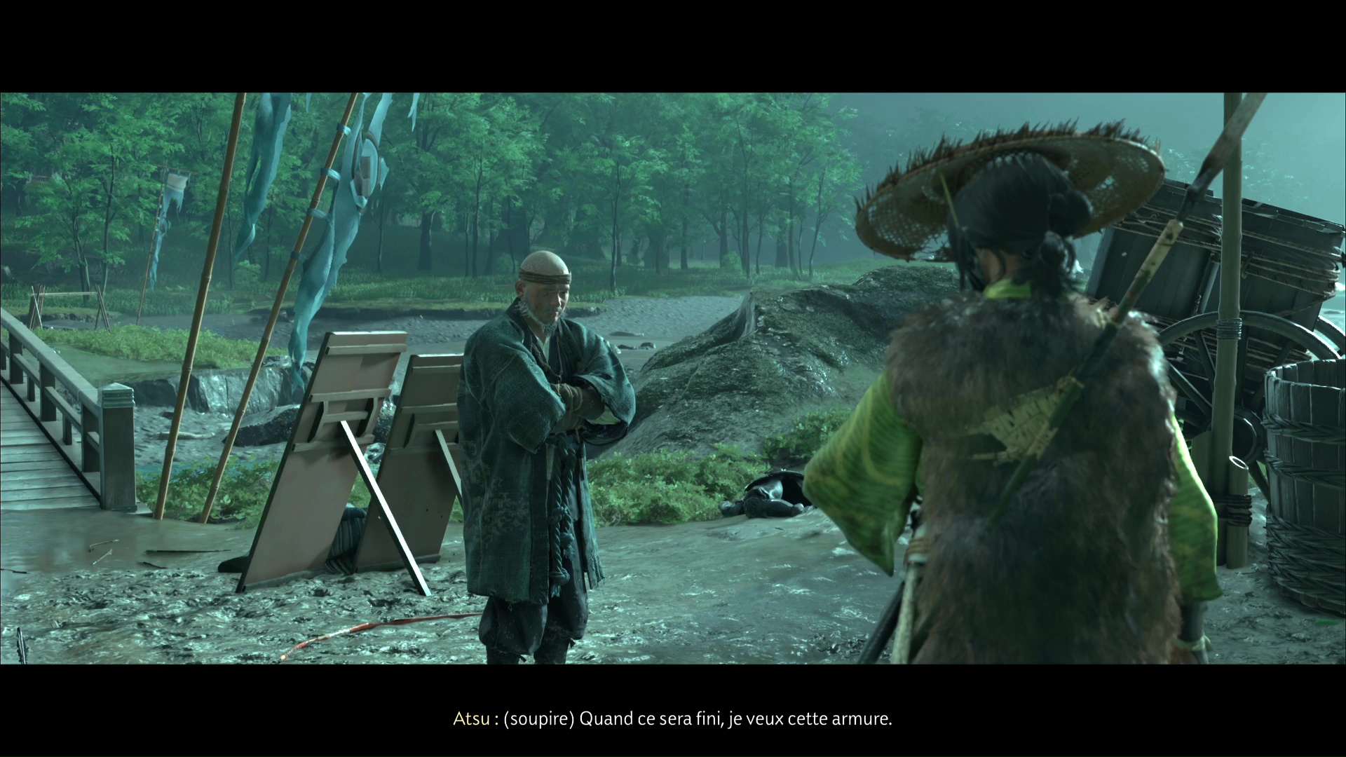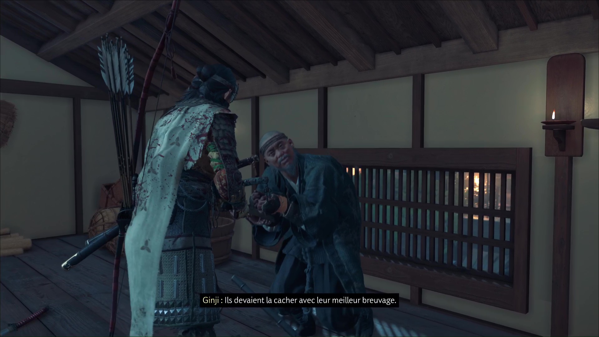 Le plan est simple : monter dans un tonneau pour être amené incognito jusqu’à destination et ainsi éliminer les soldats. En échange, Atsu veut l’armure. Après quelques minutes passées dans le tonneau, Atsu revient à l’air libre, comme prévu, à la maison de thé.