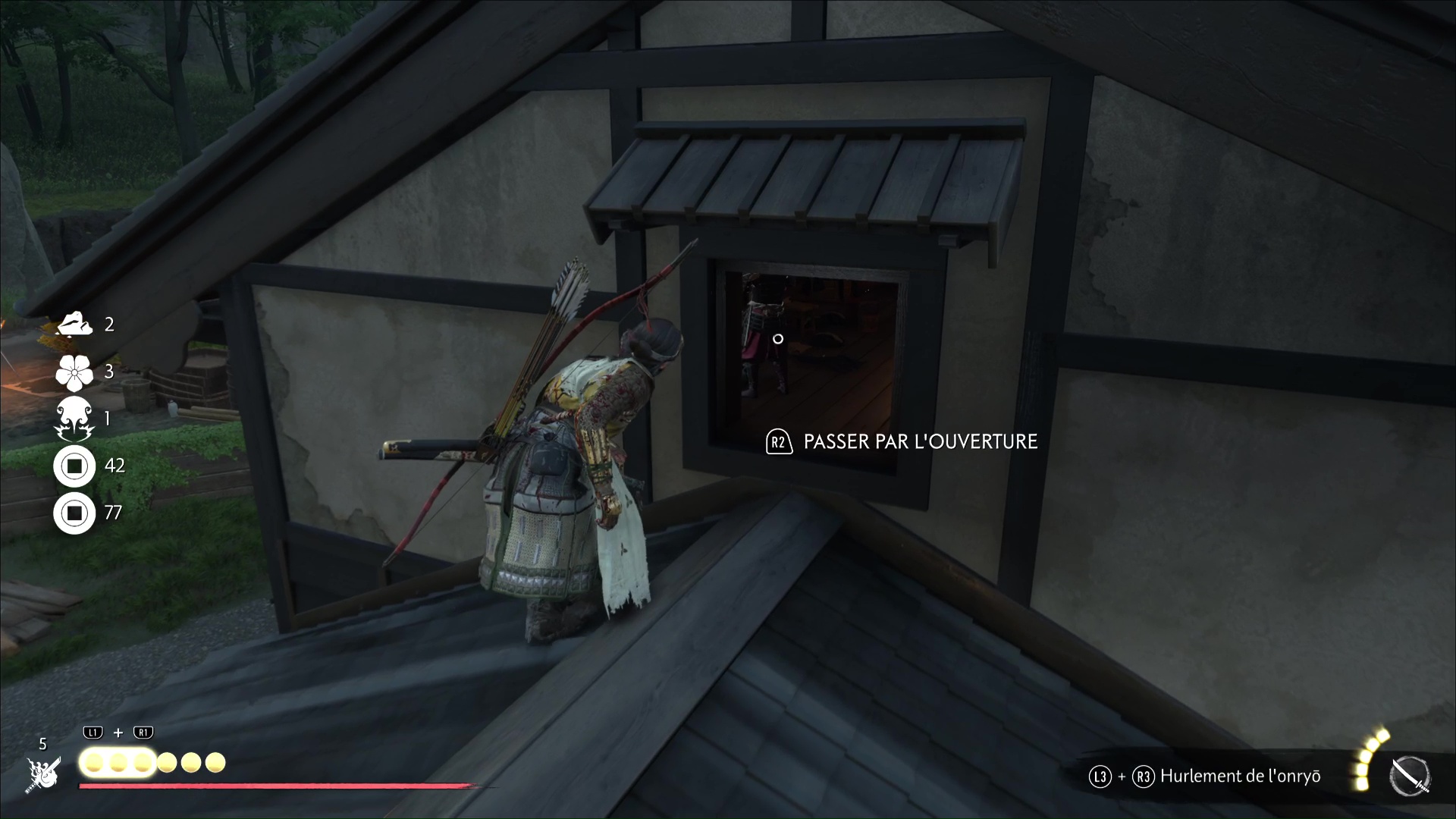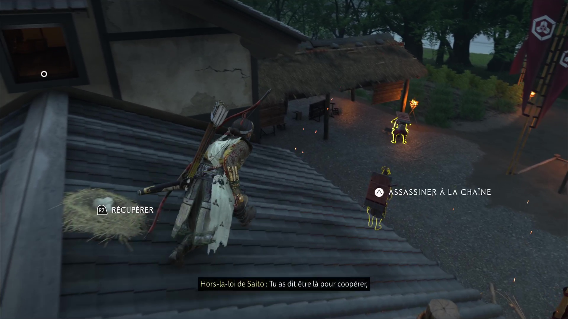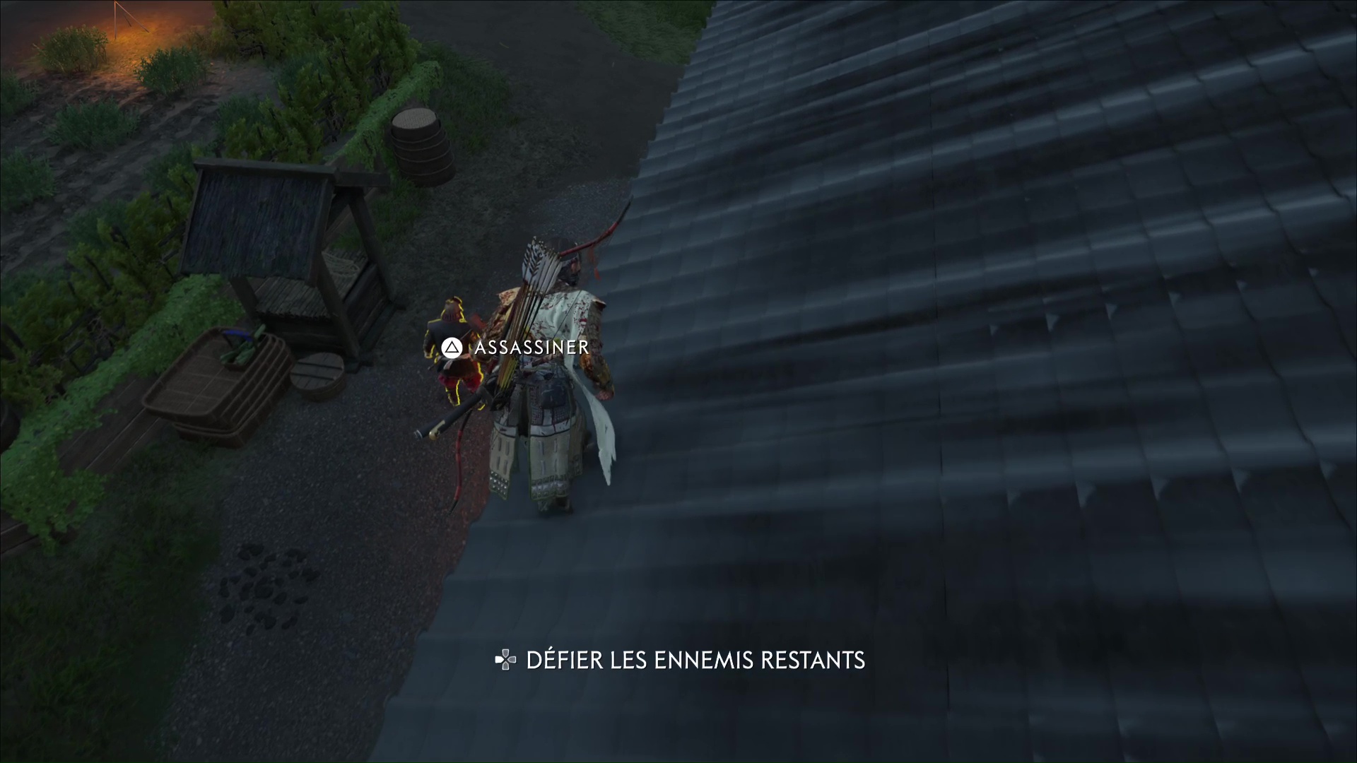 Grimpez à présent sur le toit de la maison principale et allez légèrement sur la droite pour commettre un double assassinat sur les gardes en contrebas. Remontez sur le toit de la maison principale et passez à travers la fenêtre pour vous retrouver dans le dos d’un autre ennemi, que vous pouvez tuer.