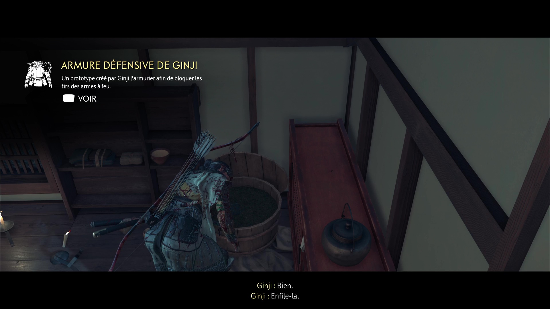 La zone est désormais hors de danger, et vous pouvez libérer Ginji à l’étage. Il vous confiera que l’armure est tout près, cachée dans du thé. Allez examiner le petit tonneau à l’opposé, dans un coin, pour qu’Atsu mette la main dessus.