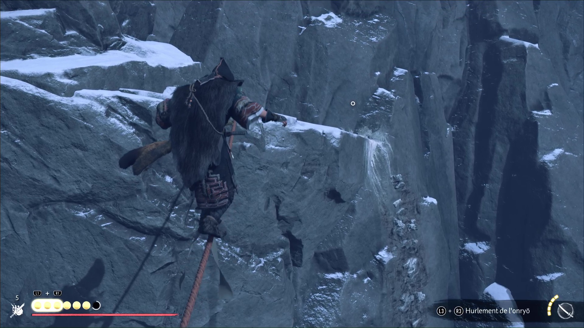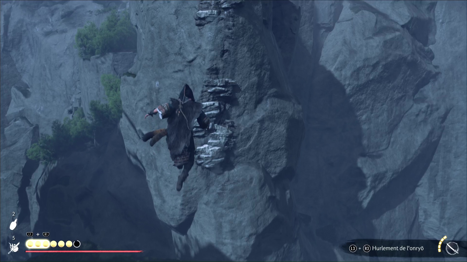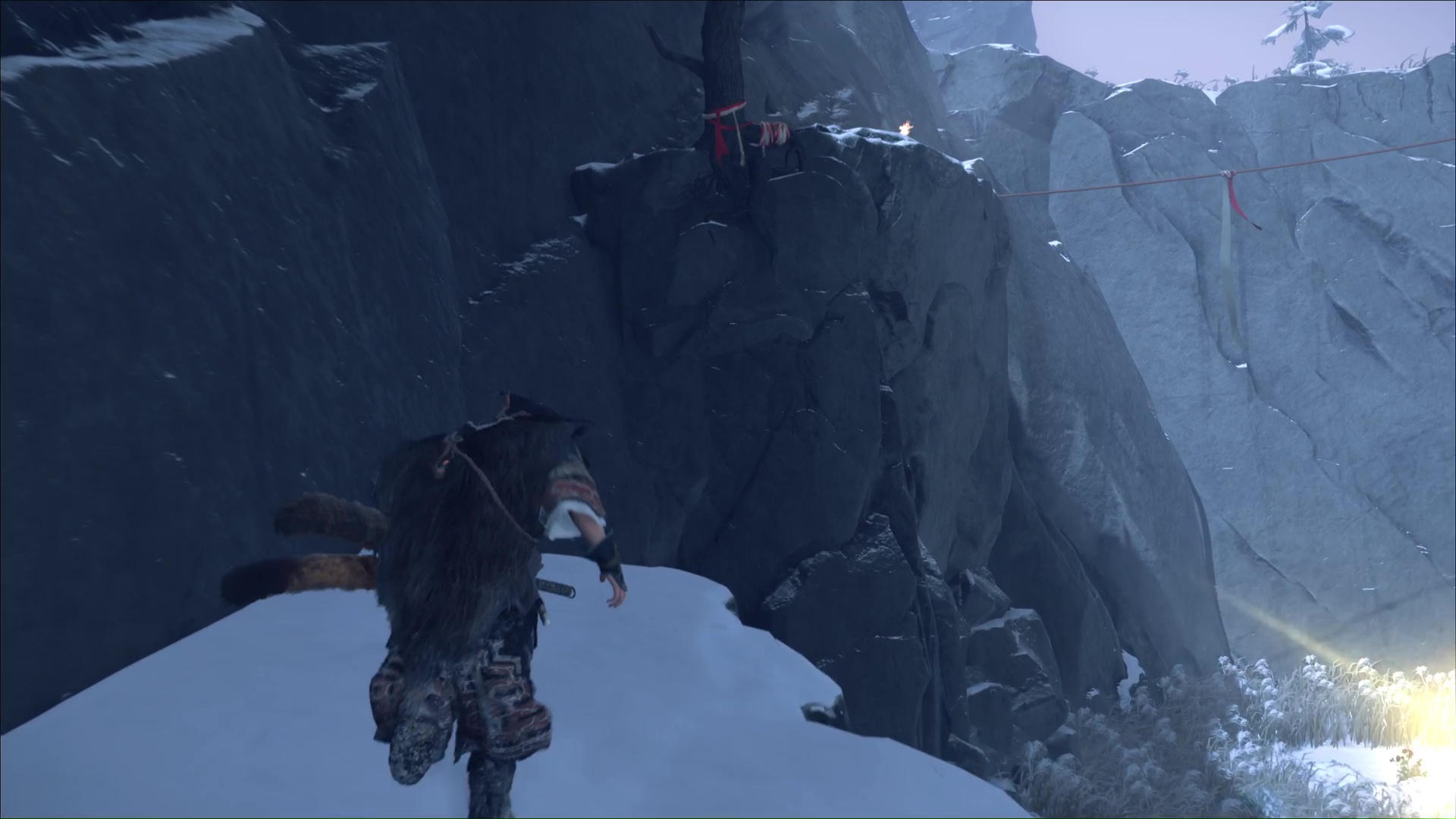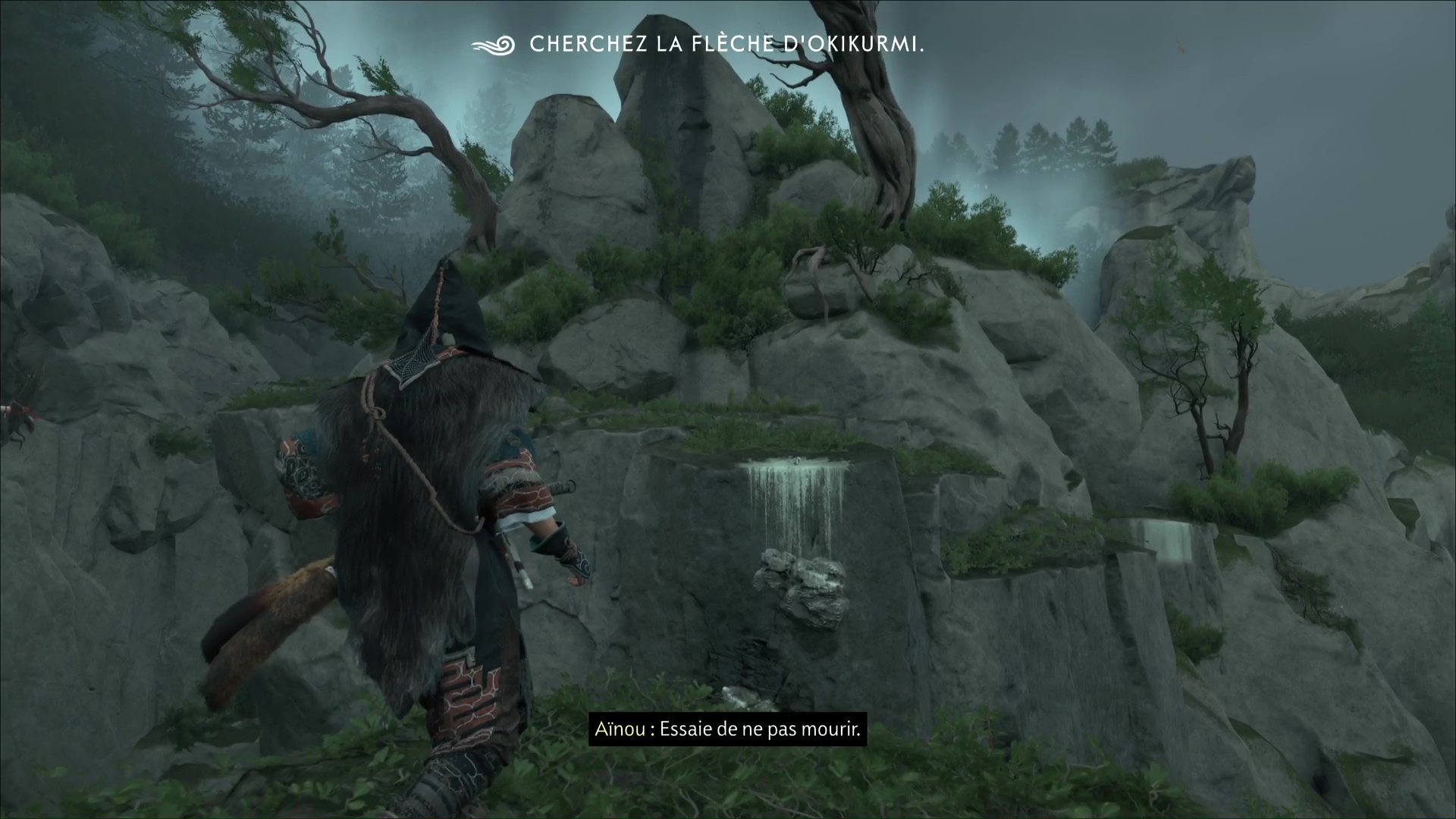 Ô surprise, d’autres prises rocheuses vous attendent pour continuer à prendre de la hauteur. Et une fois en haut, retournez-vous puis sautez sur la plateforme en face. Continuez et vous retrouverez l’aïnou du début de l’ascension. Il vous apprend que seule la flèche d’okikurmi peut vaincre l’ours, et qu’elle se trouve au milieu d’armoises.
