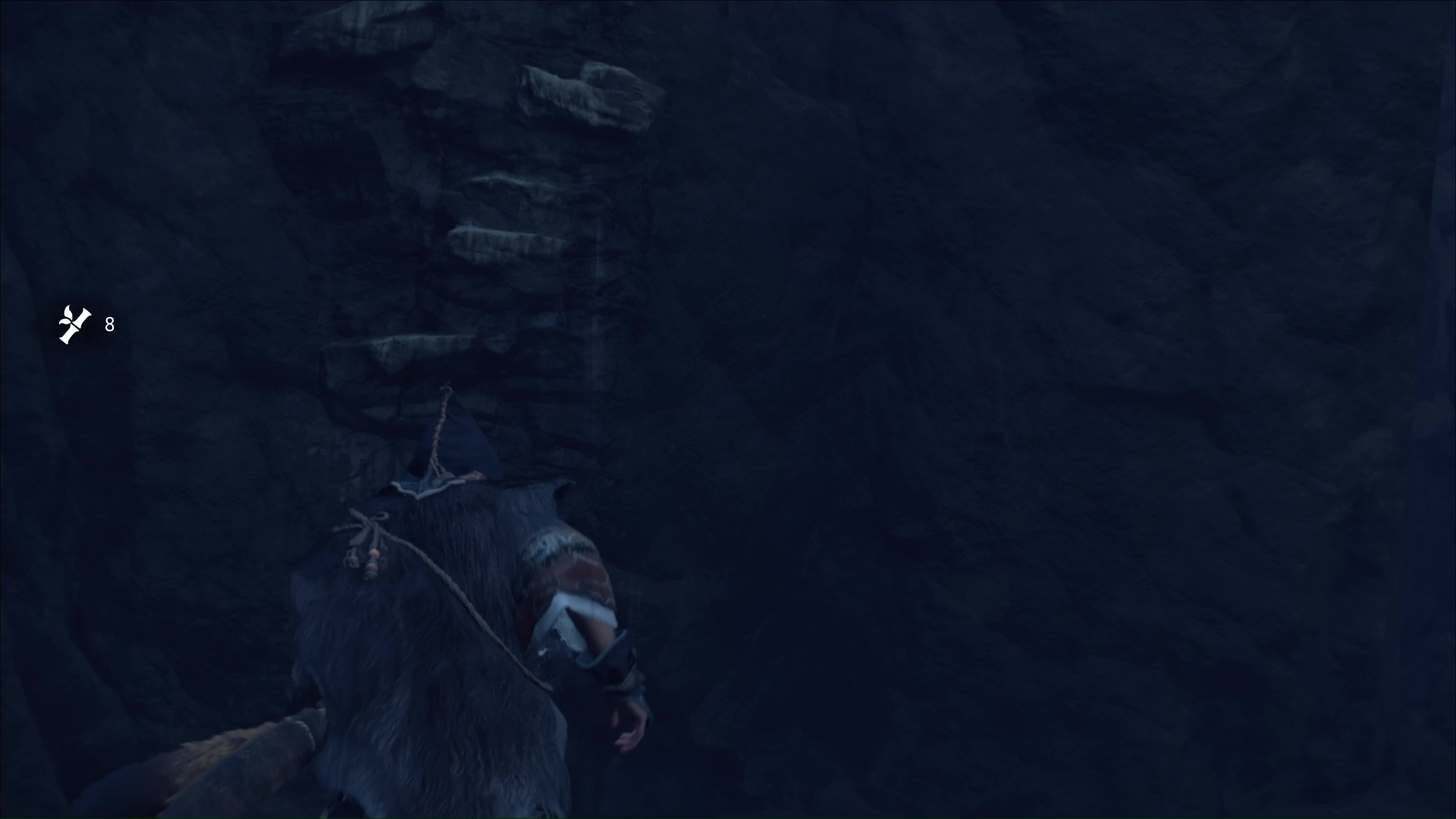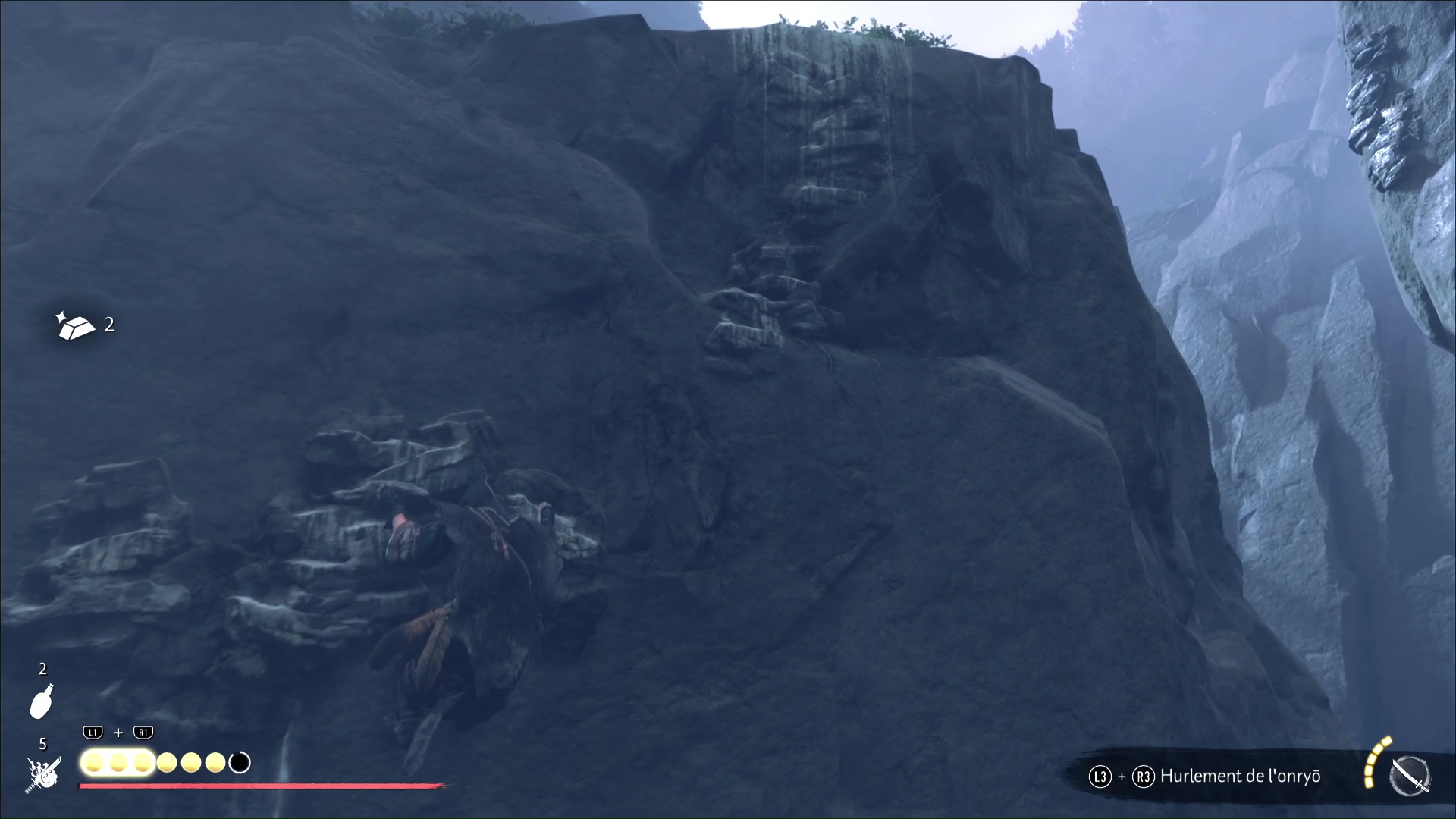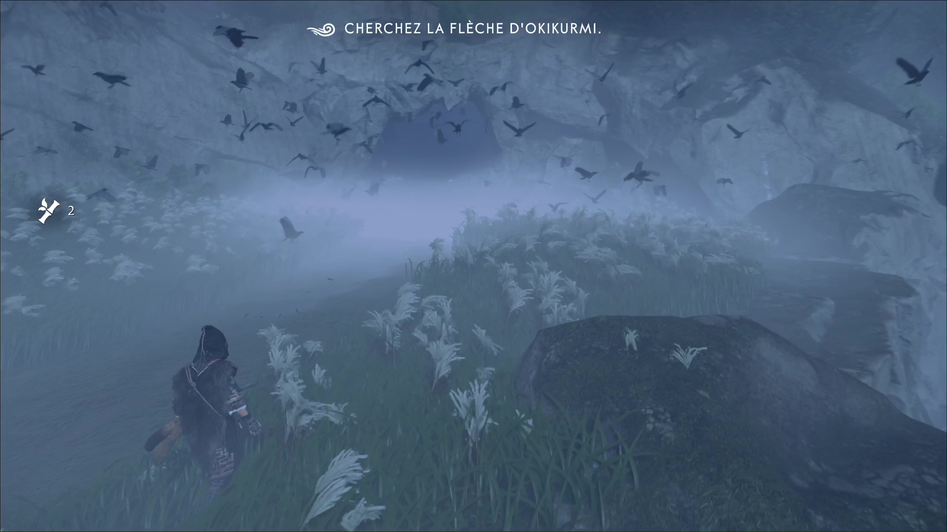 Ô surprise, d’autres prises rocheuses vous attendent pour continuer à prendre de la hauteur. Et une fois en haut, retournez-vous puis sautez sur la plateforme en face. Continuez et vous retrouverez l’aïnou du début de l’ascension. Il vous apprend que seule la flèche d’okikurmi peut vaincre l’ours, et qu’elle se trouve au milieu d’armoises.