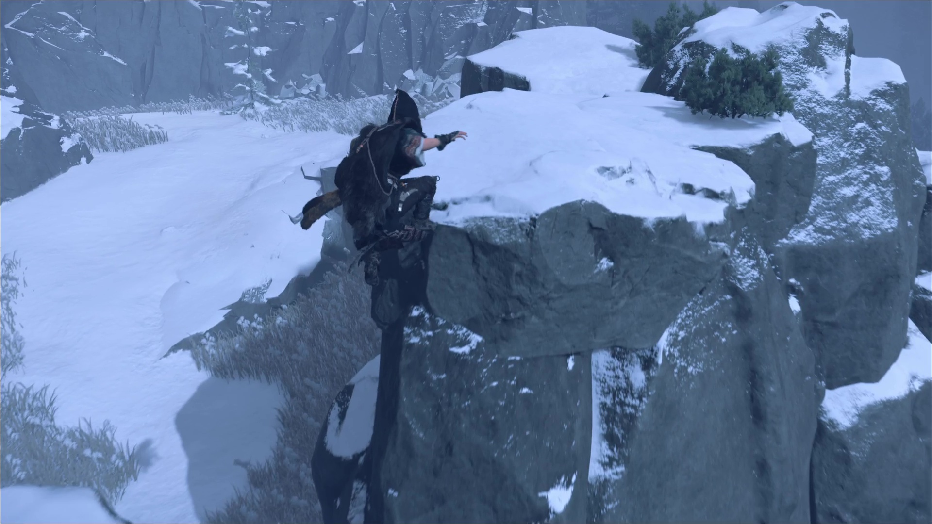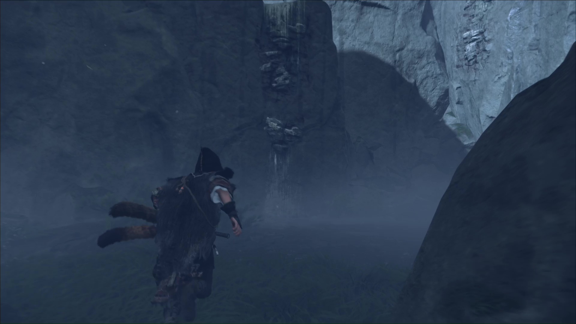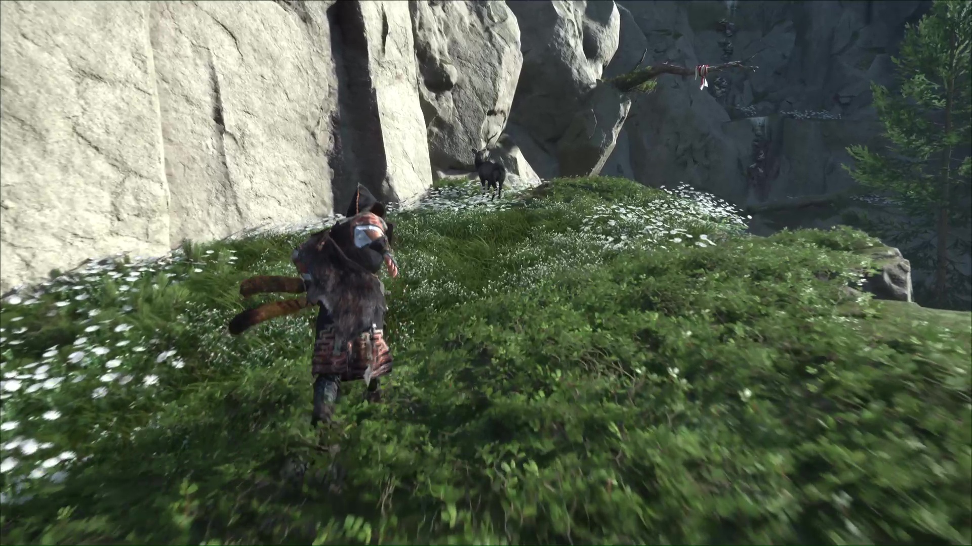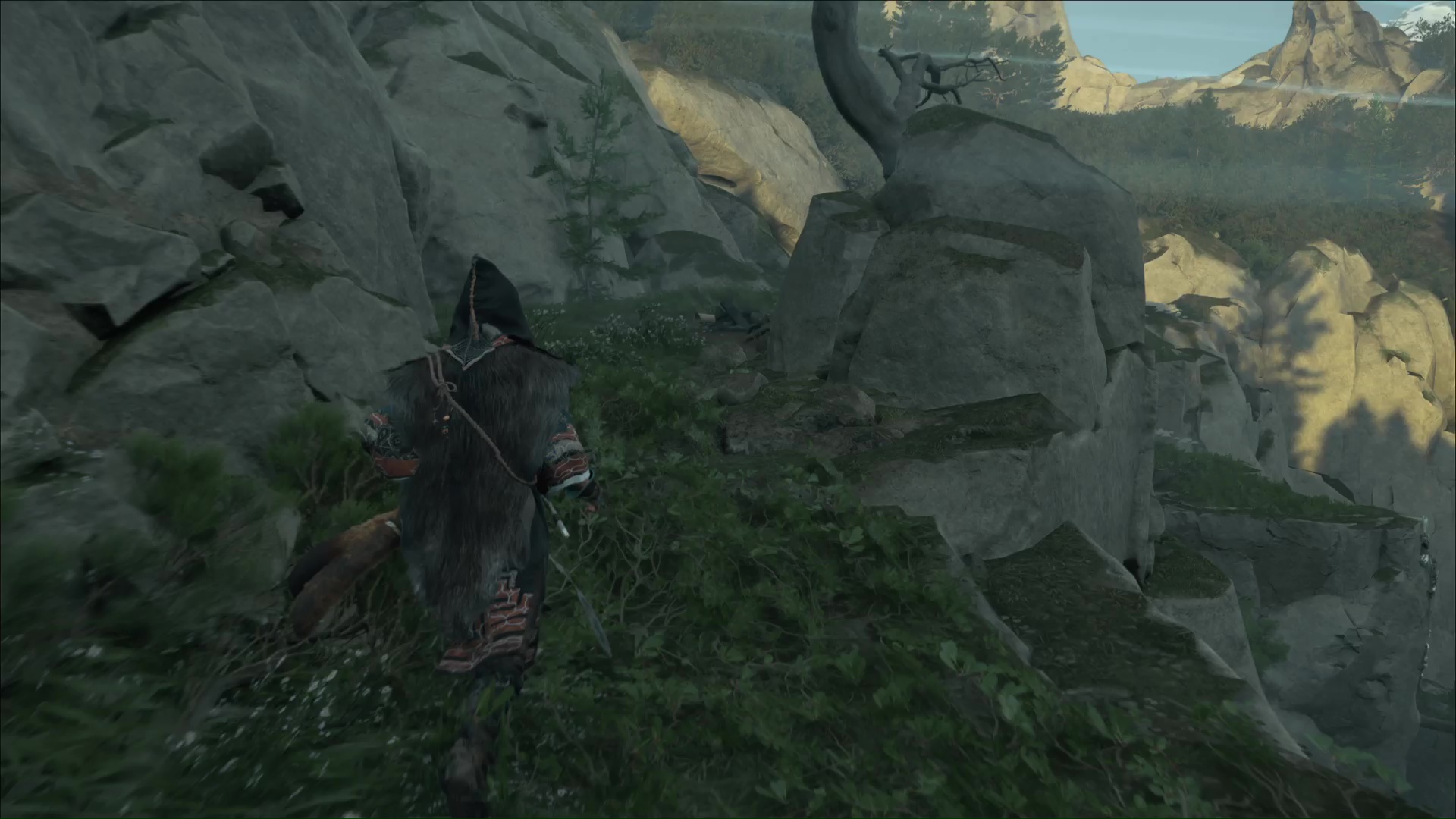 Ô surprise, d’autres prises rocheuses vous attendent pour continuer à prendre de la hauteur. Et une fois en haut, retournez-vous puis sautez sur la plateforme en face. Continuez et vous retrouverez l’aïnou du début de l’ascension. Il vous apprend que seule la flèche d’okikurmi peut vaincre l’ours, et qu’elle se trouve au milieu d’armoises.