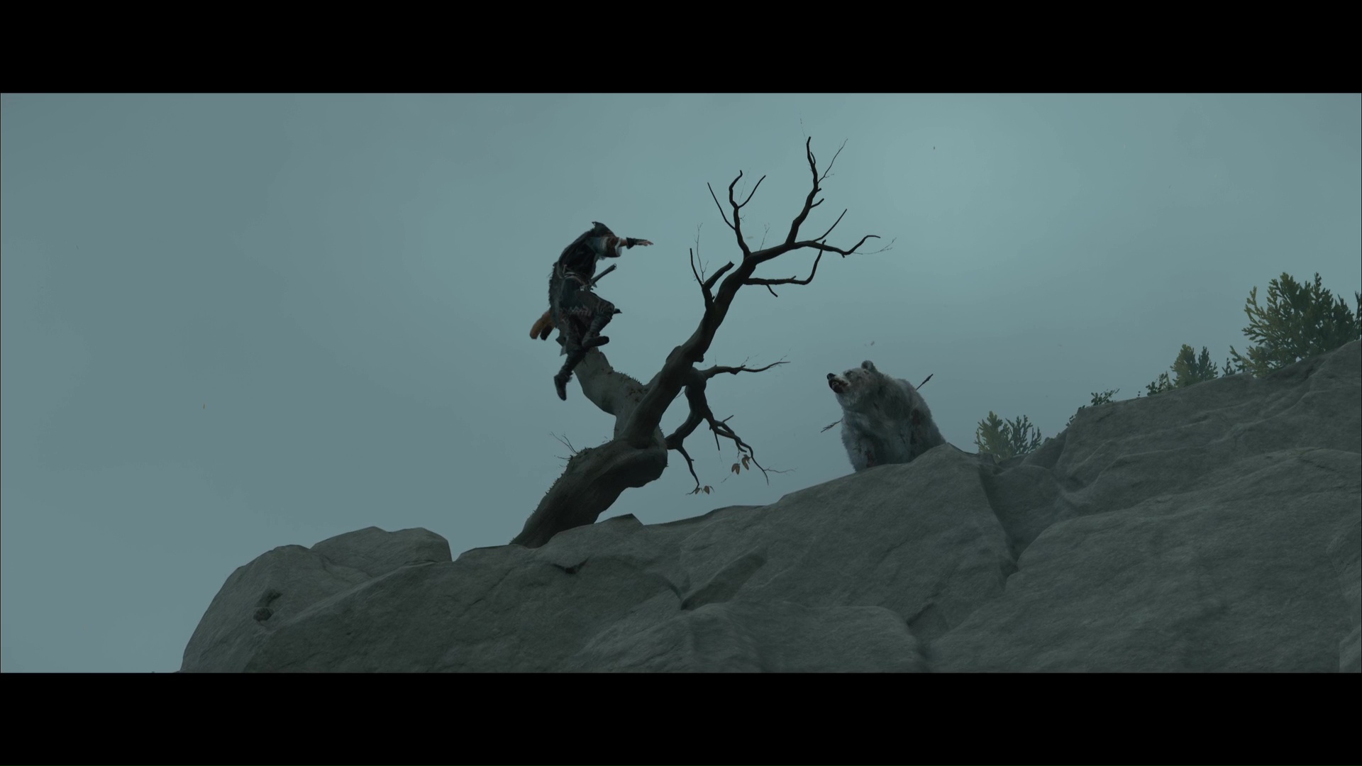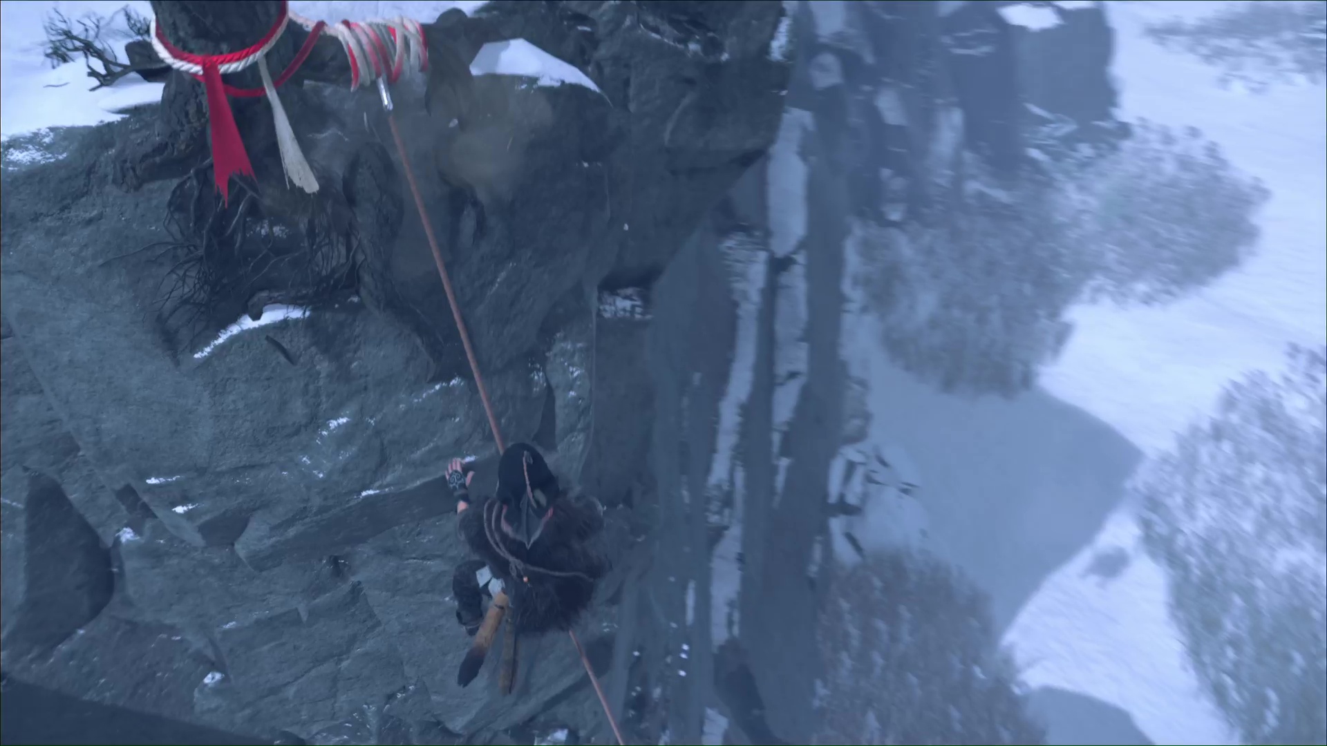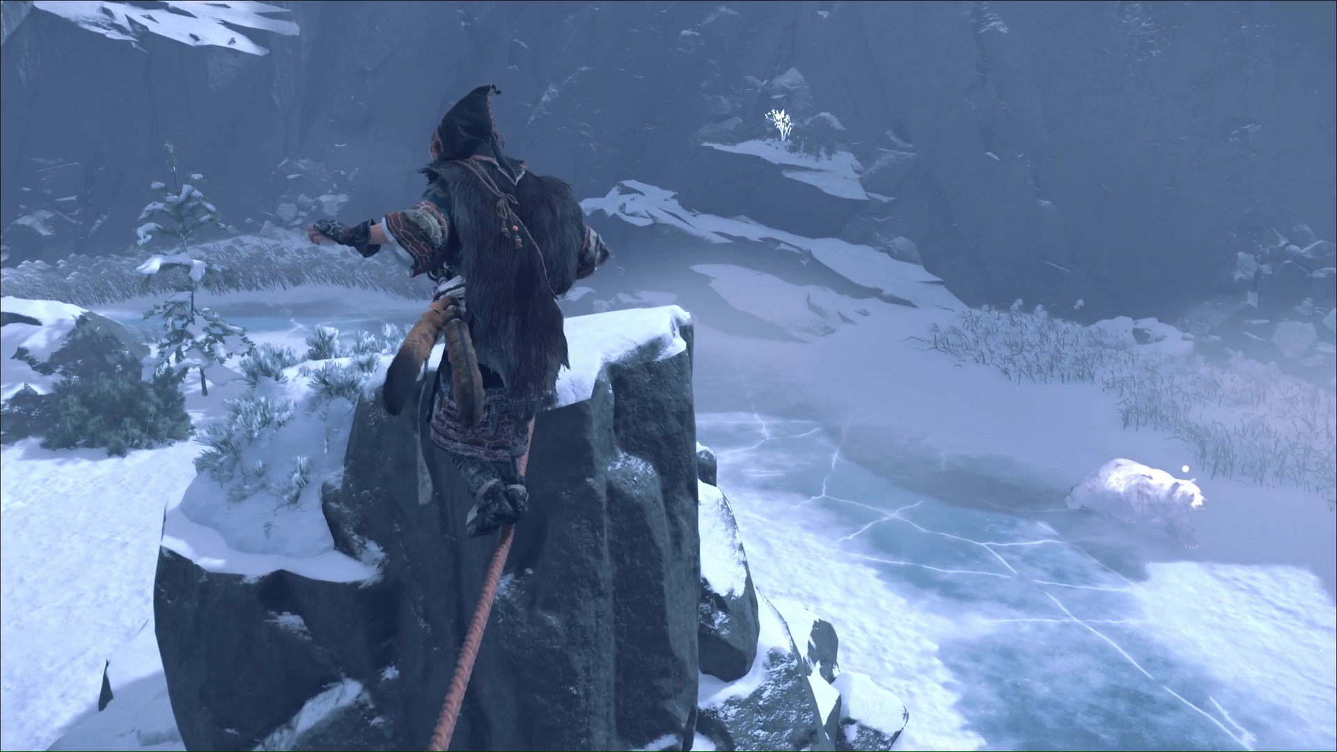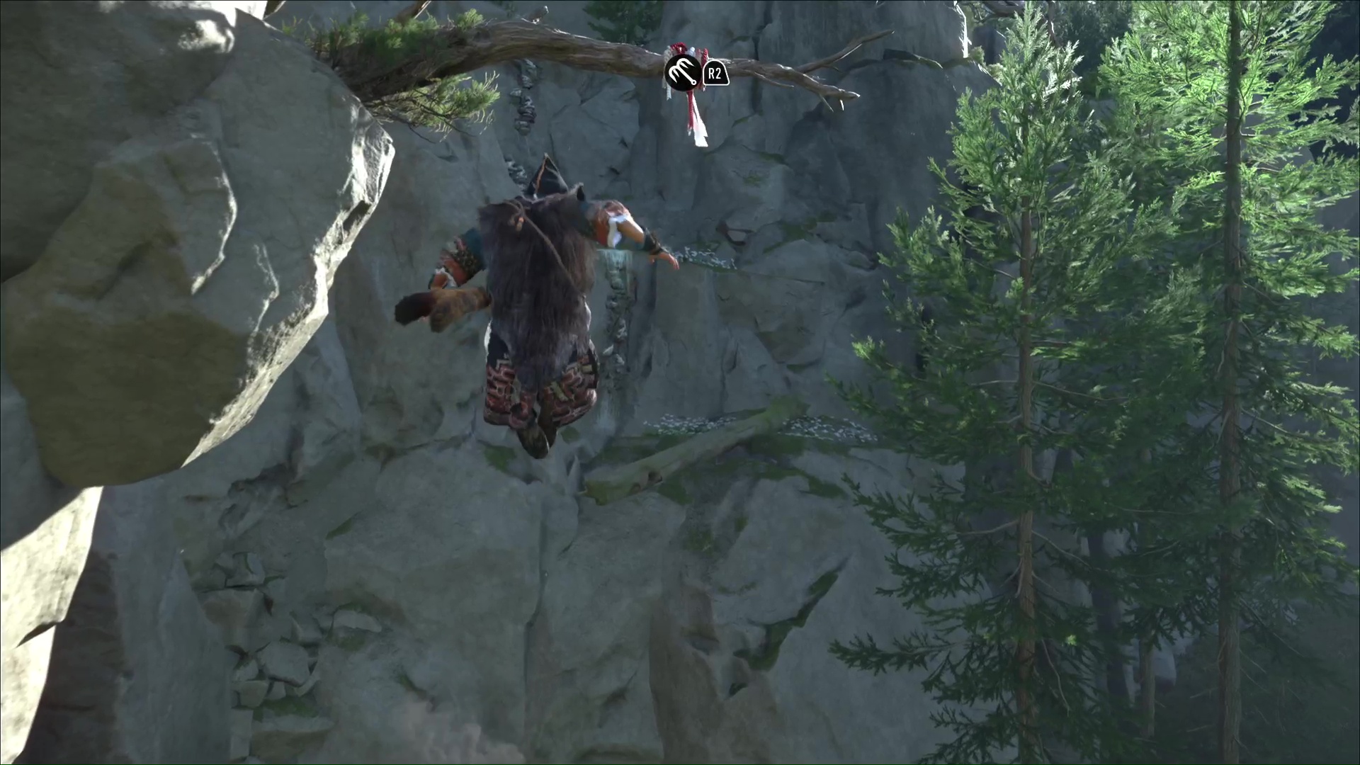 L’ours est de retour et, une fois encore, il faut traverser la zone pour trouver, à l’opposé, un tronc à grappin au bord de la falaise. Descendez au niveau inférieur grâce à lui. D’ici, vous pouvez faire un peu de repérage sur la zone suivante, en contrebas.