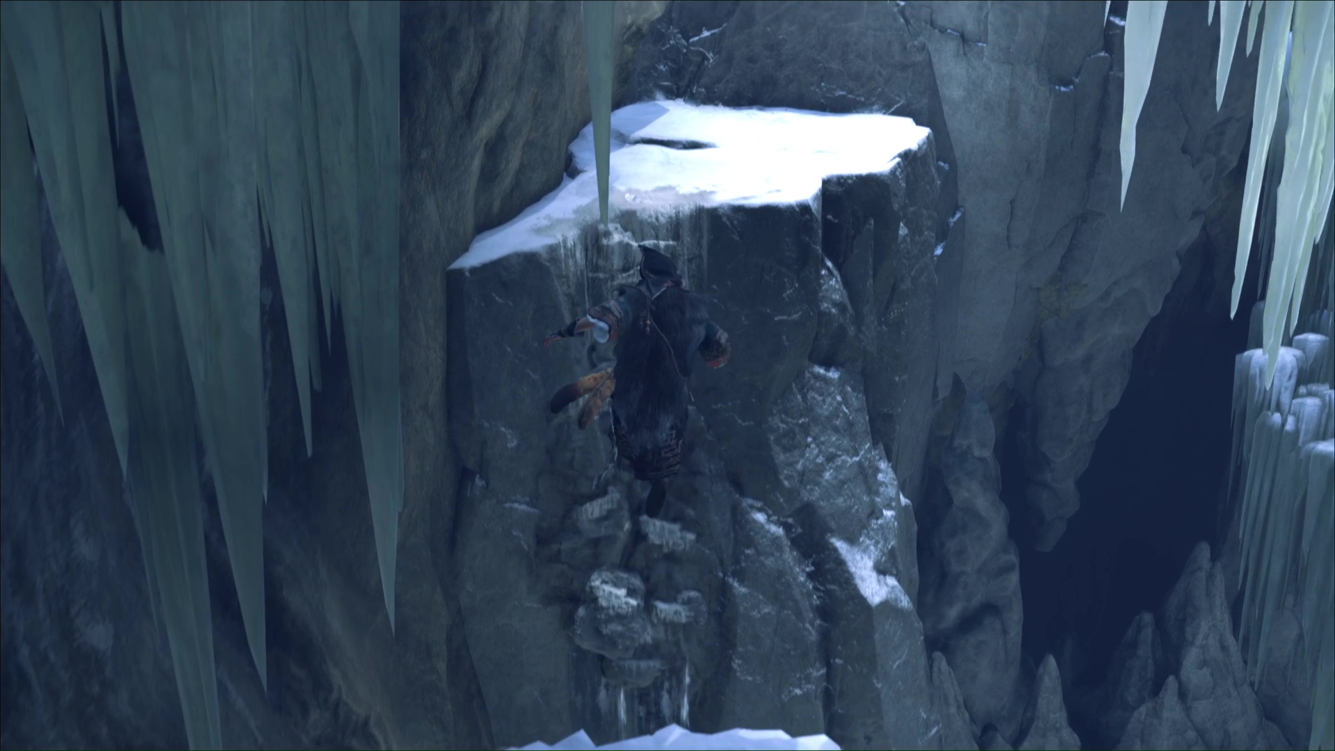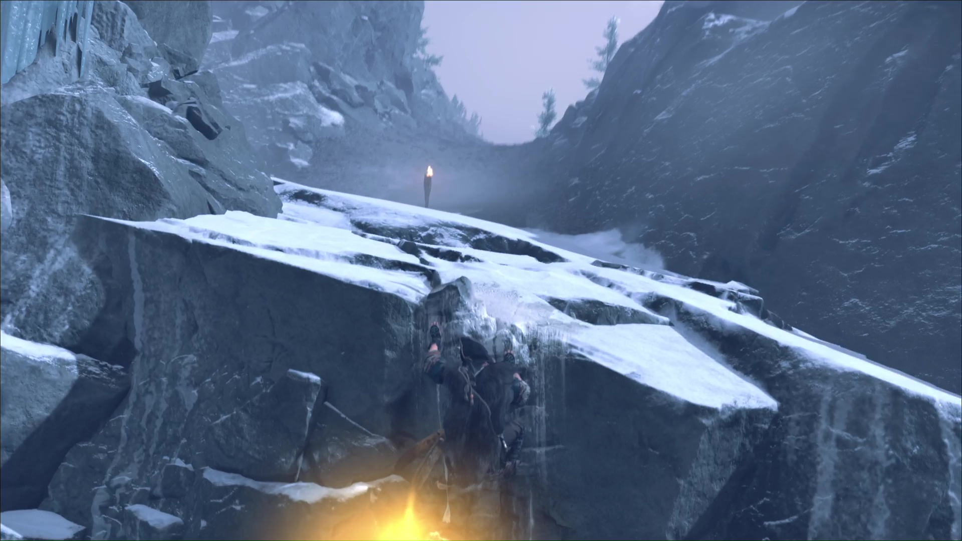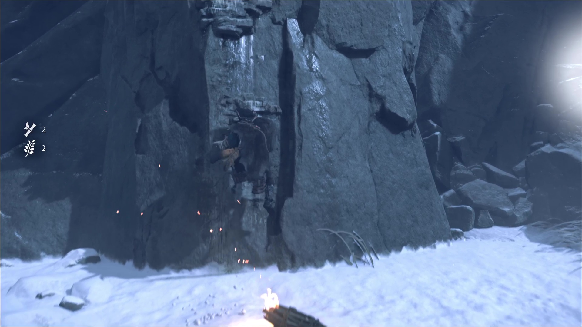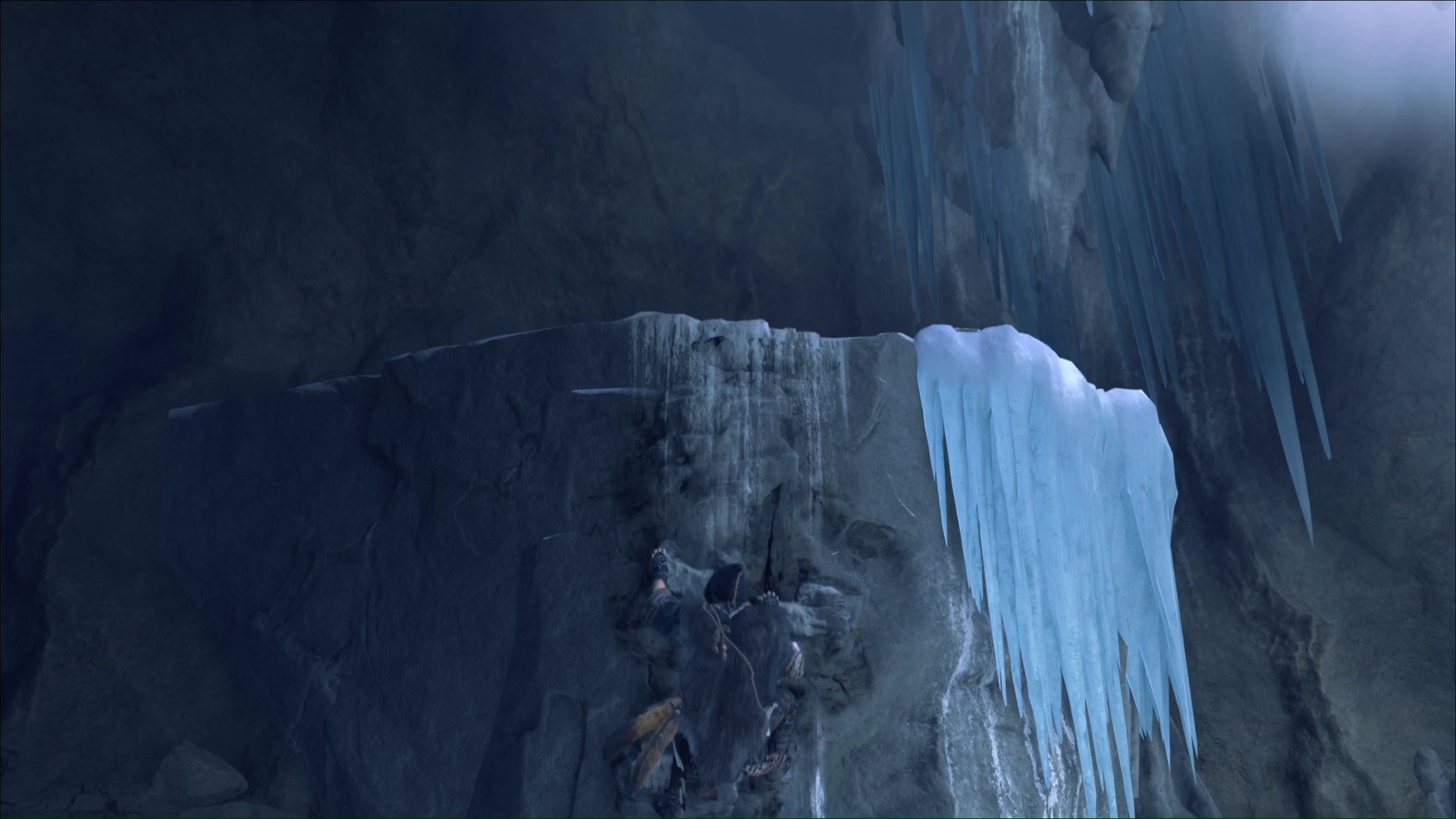 Une fois hissé, montez le chemin qui mène à une grotte. Un peu plus loin, vous verrez des prises rocheuses. Grimpez et avancez jusqu’à arriver à une zone gelée.