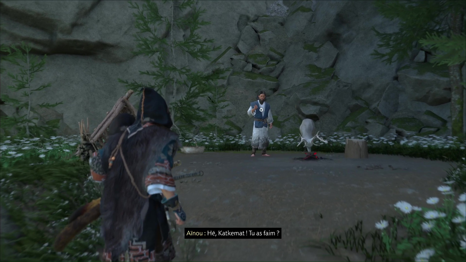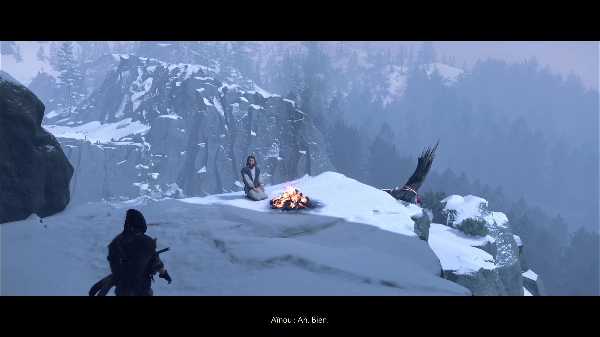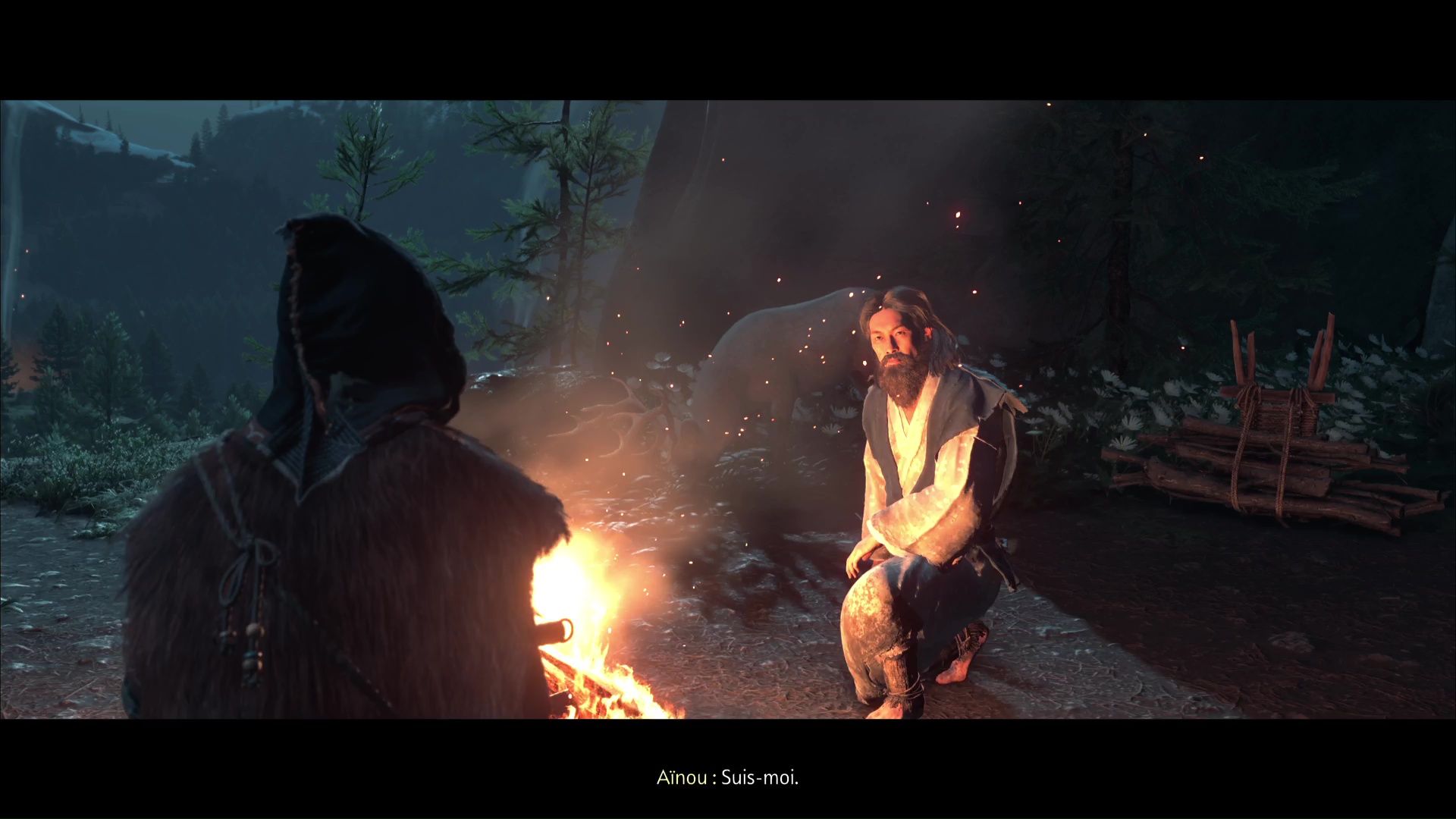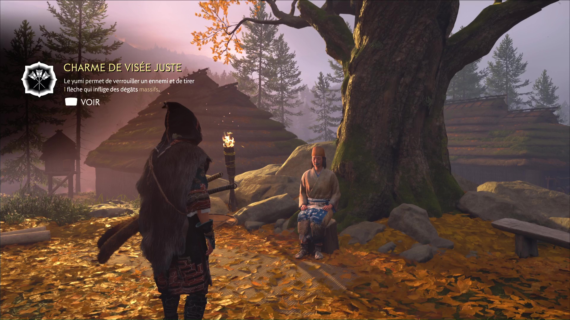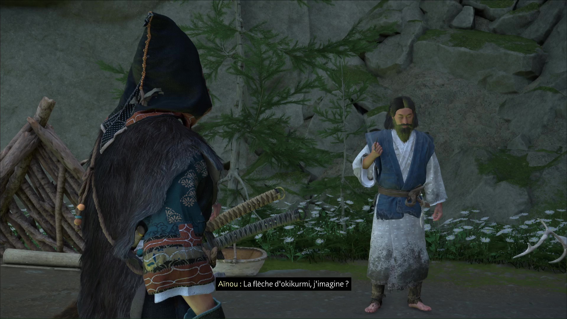 Parlez-lui et vous apprendrez qu’il a des informations sur la flèche légendaire. Mais d’abord, faites un feu. Au cours d’une petite discussion, l’aïnou vous invite à le suivre. Ensemble, tirez avec votre grappin pour retirer la barrière, et vous voici paré pour commencer votre périple.