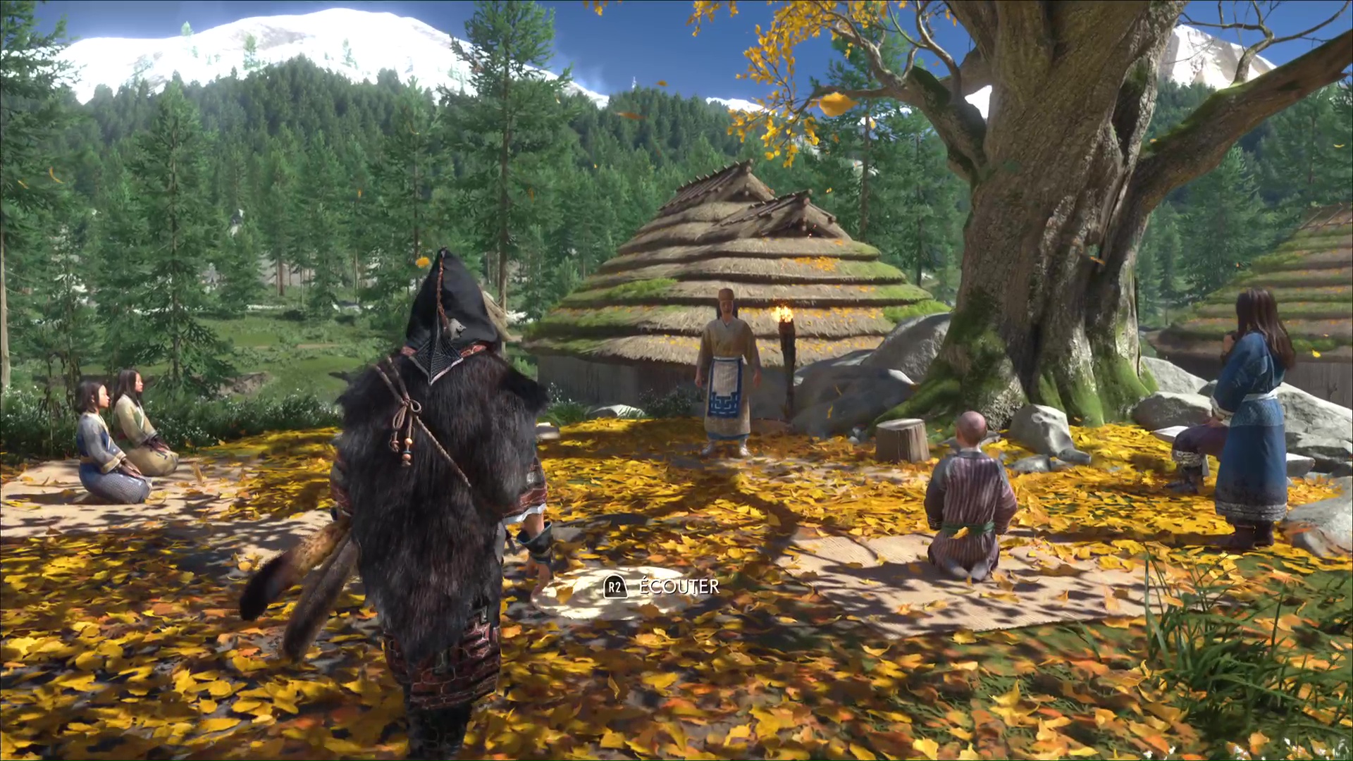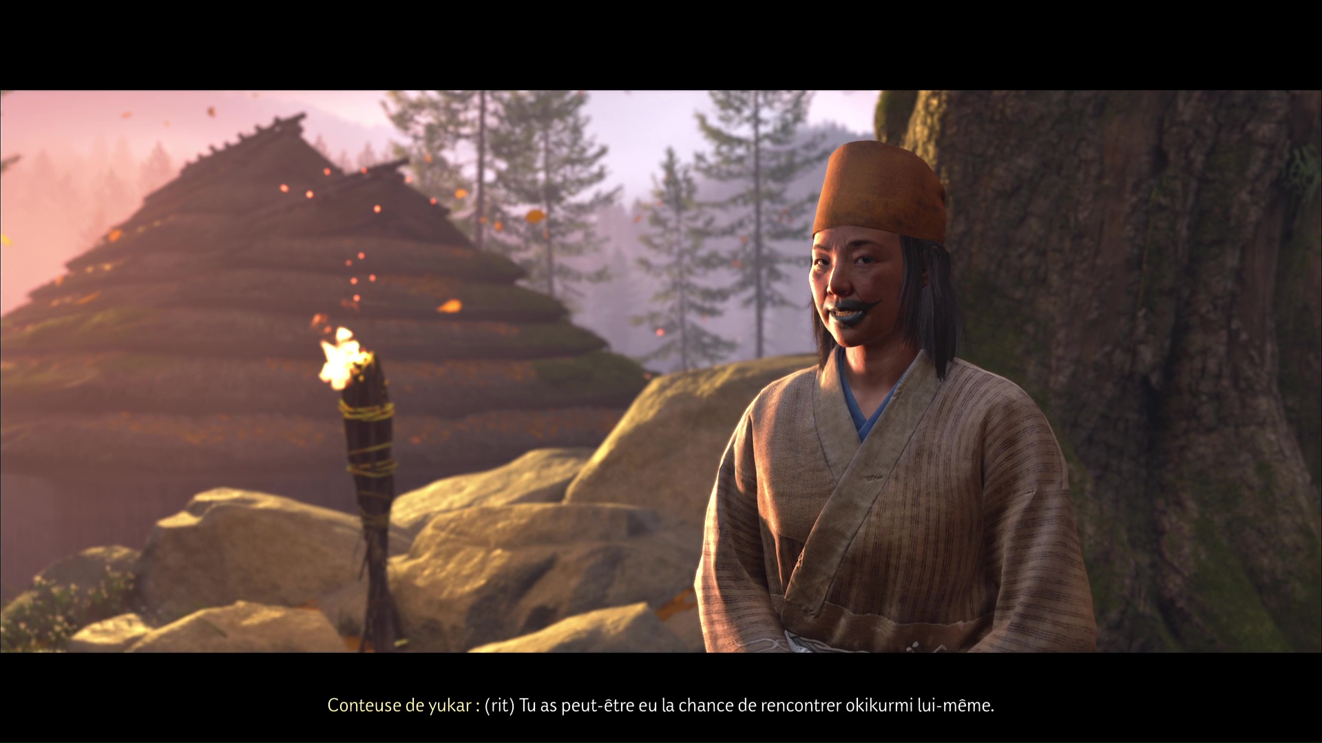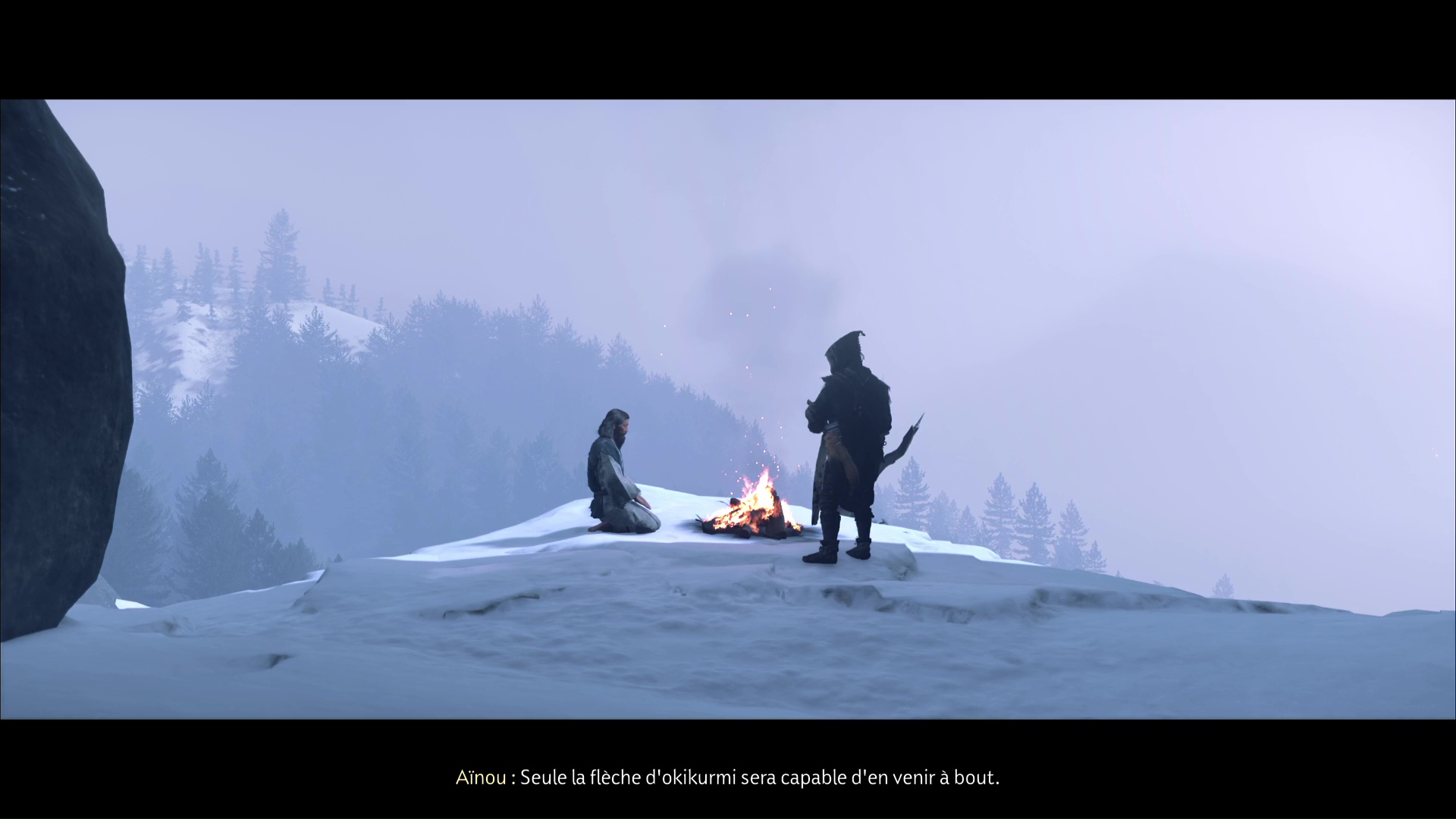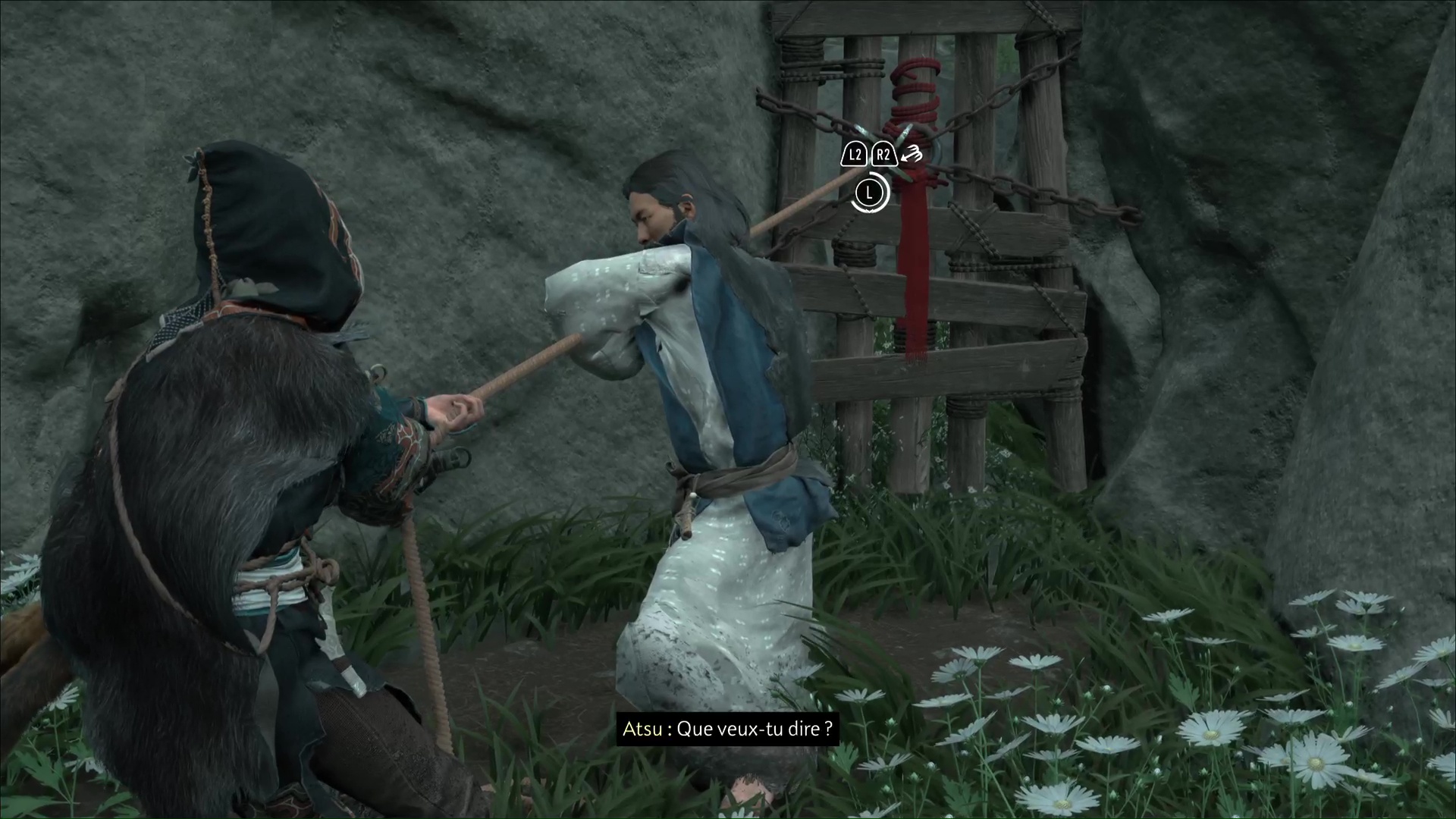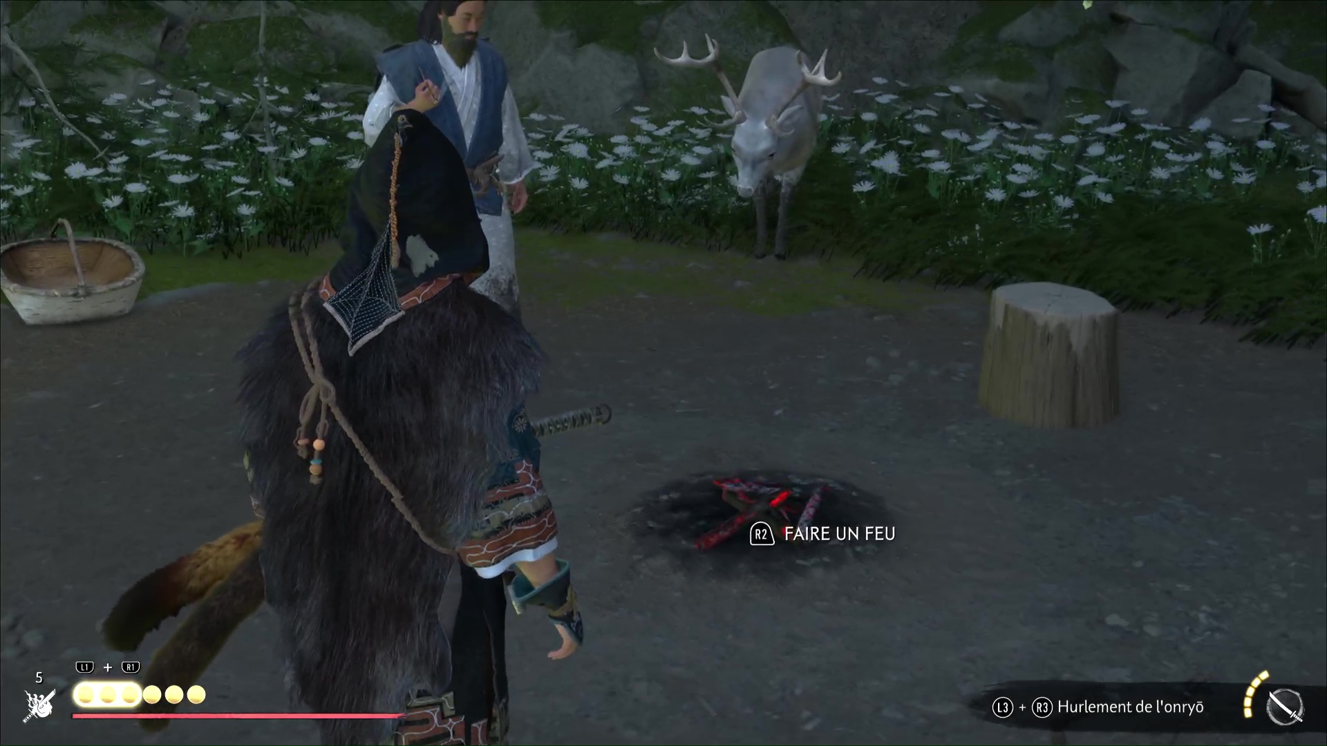 Parlez-lui et vous apprendrez qu’il a des informations sur la flèche légendaire. Mais d’abord, faites un feu. Au cours d’une petite discussion, l’aïnou vous invite à le suivre. Ensemble, tirez avec votre grappin pour retirer la barrière, et vous voici paré pour commencer votre périple.