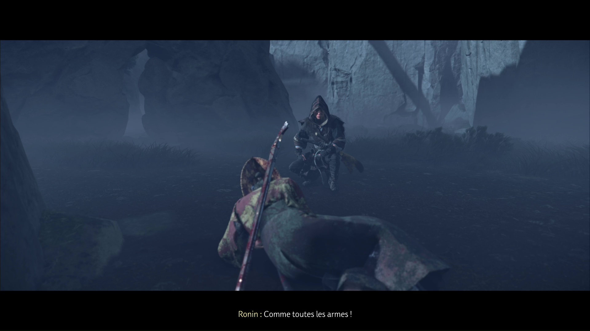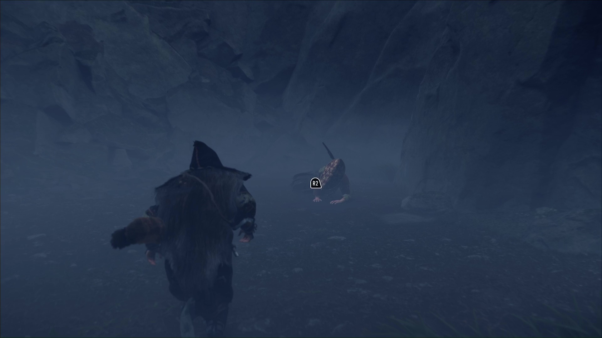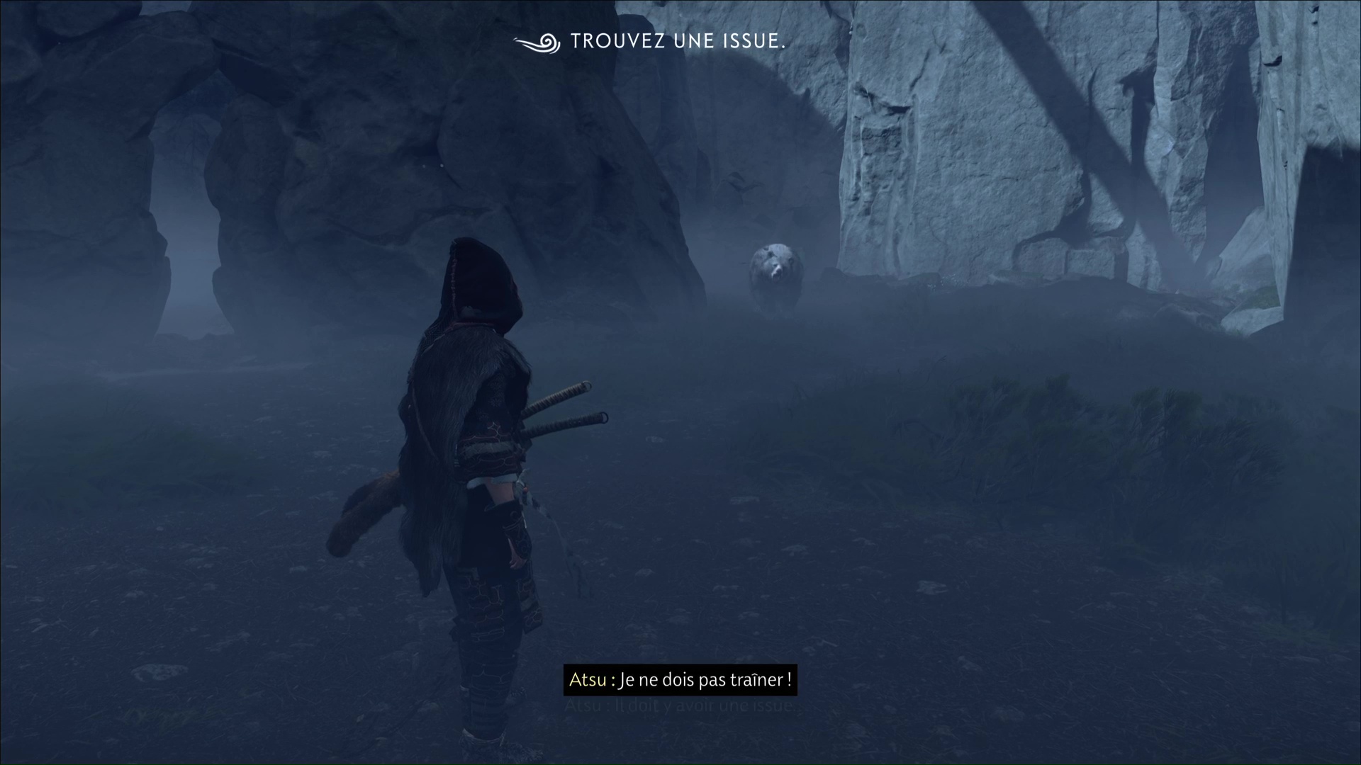 De nouveau sur pied, avancez droit devant pour vous faufiler à travers une ouverture. De l’autre côté, allez examiner un homme en difficulté, au bout de la zone. Il vous explique que l’ours est immortel et que vos armes n’ont aucun effet sur lui. N’essayez donc même pas de l’avoir avec votre arc.