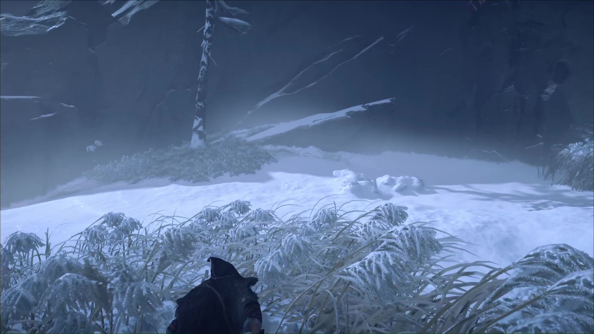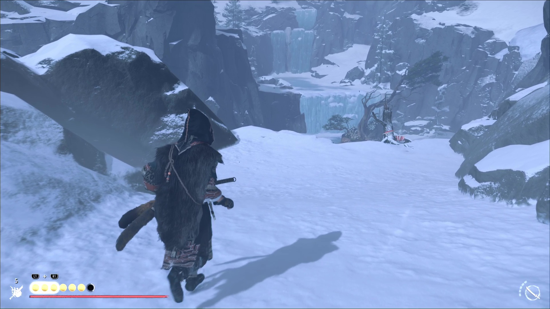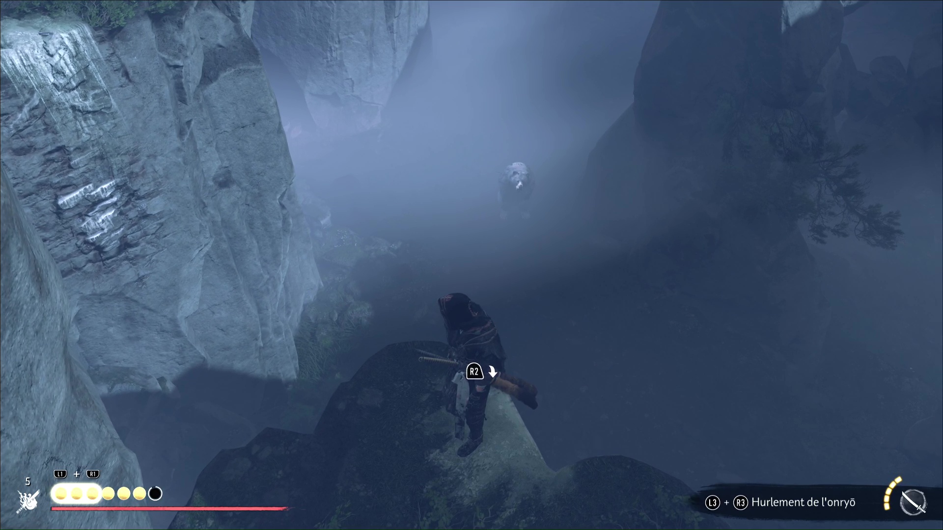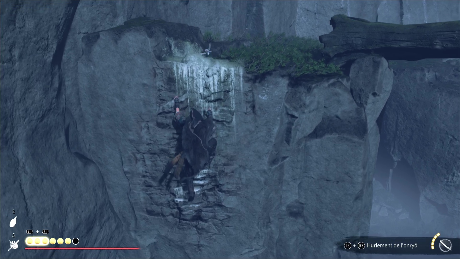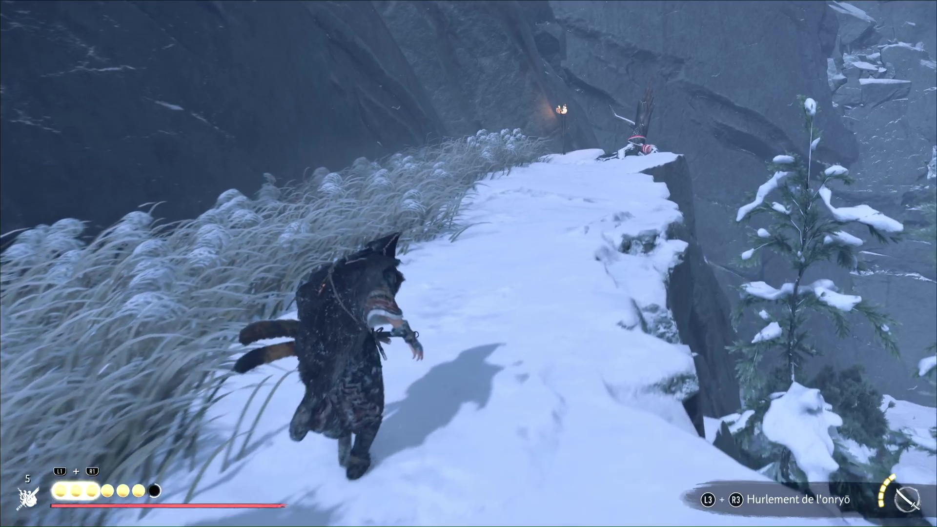 Visez le trou dans la montagne pour qu’Atsu fasse une remarque, puis suivez le cerf. Vous voici devant une branche à laquelle vous pouvez vous accrocher grâce au grappin. Sautez et atterrissez sur un arbre mort.