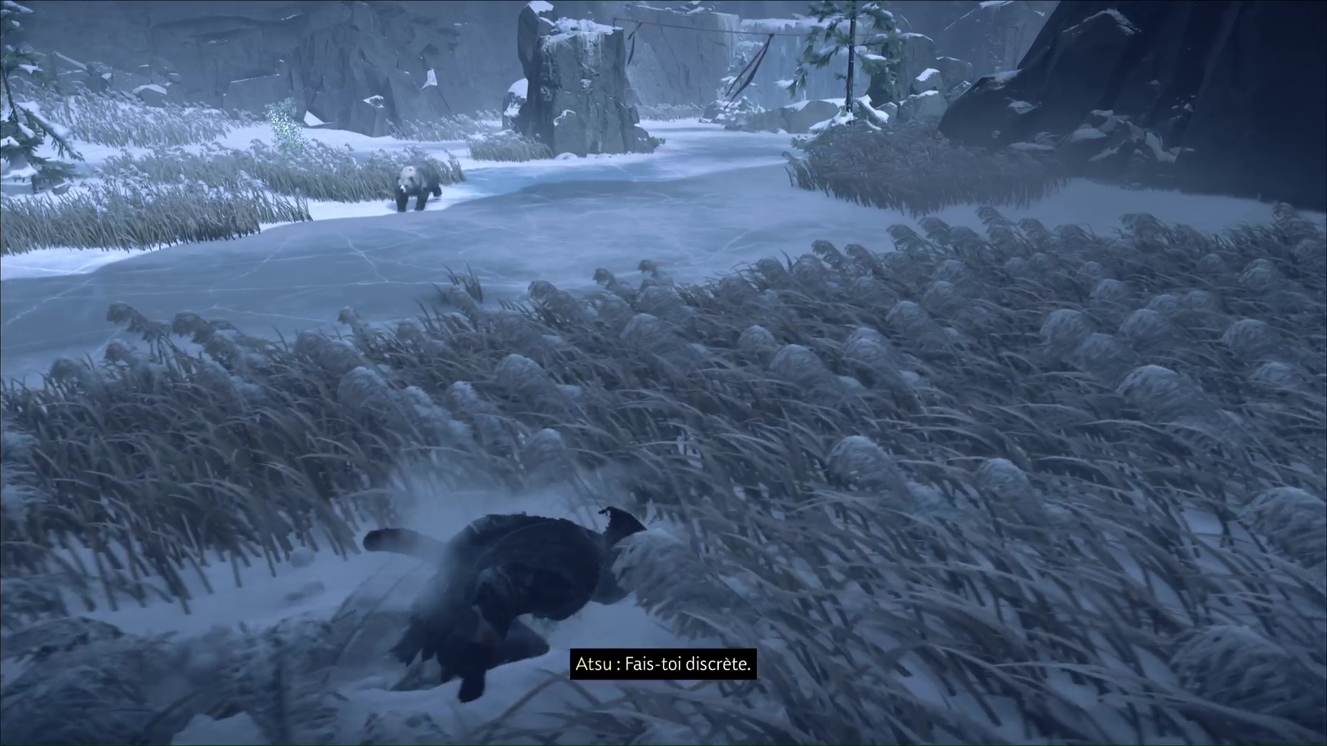 Descendez ensuite au grappin grâce au tronc juste à côté et terminez la descente jusqu’à rejoindre les fleurs. Vous allez démarrer une séquence de cache-cache avec l’ours. Attention, le fait qu’il ne vous voit pas ne suffit pas. Il peut également vous sentir s’il est assez près de vous. Ne restez donc pas immobile trop longtemps et progressez dès que vous pouvez.