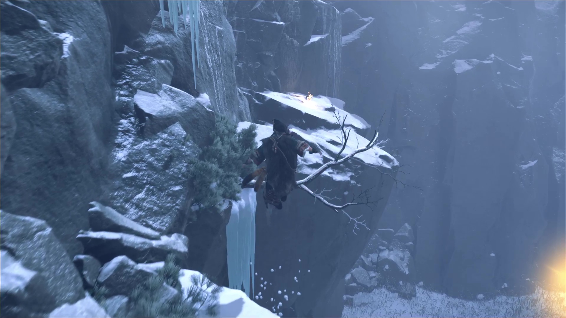 Une fois descendu dans la zone et la torche atteinte, grimpez vite aux prises rocheuses. En haut, sautez sur la branche puis en face.