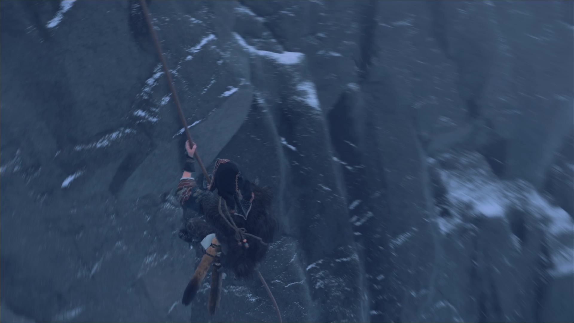 Soudain, l’ours revient. Filez sans plus tarder à travers l’ouverture sur votre gauche, puis courez vers les prises murales. Escaladez et vous serez à l’abri.