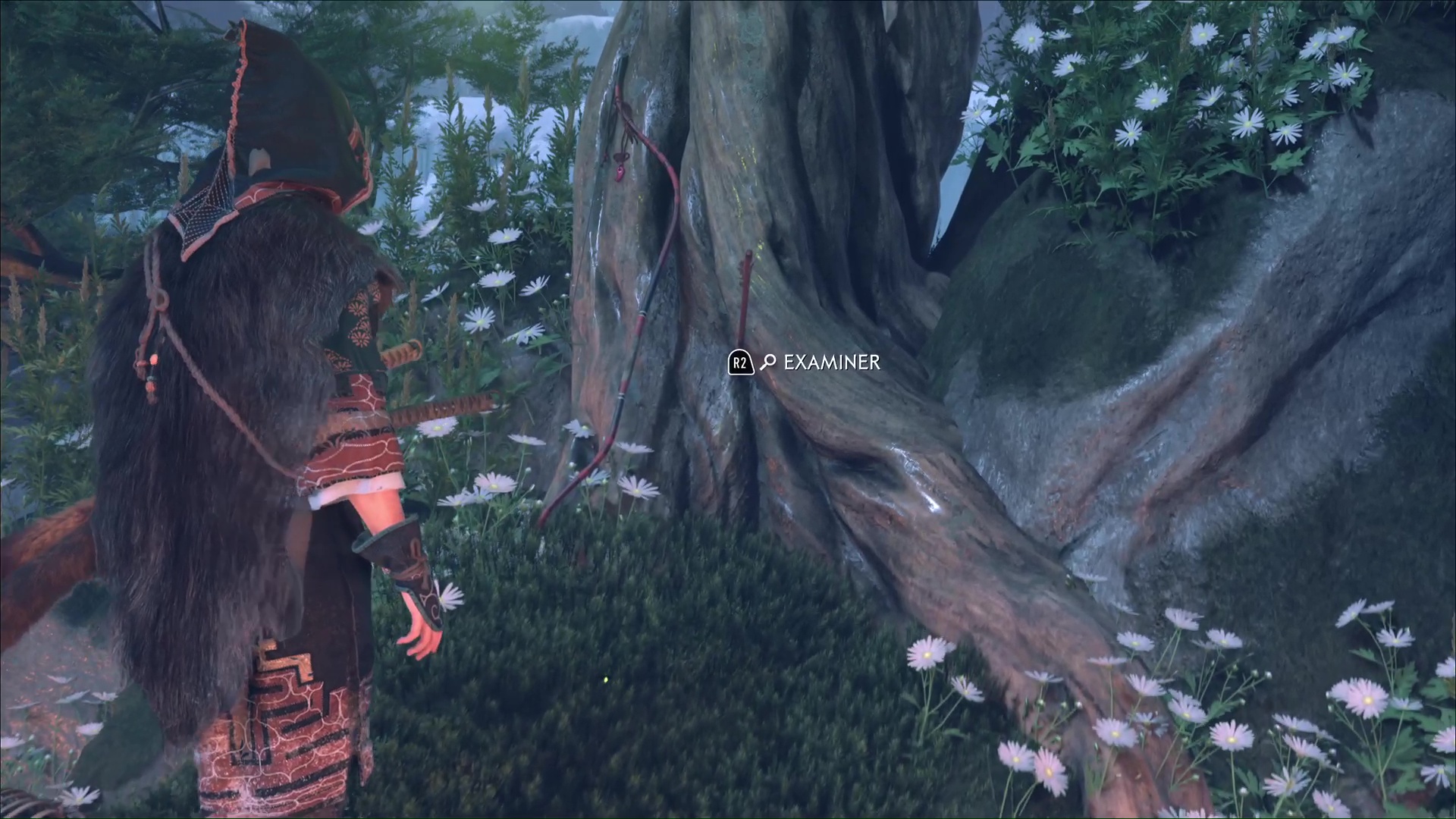 Tout d’abord, sautez en face. Une fois de l’autre côté, à gauche, l’artefact aïnou tesma vous attend. Pour le rejoindre, sautez puis sortez le grappin pour vous hisser grâce à un tronc.