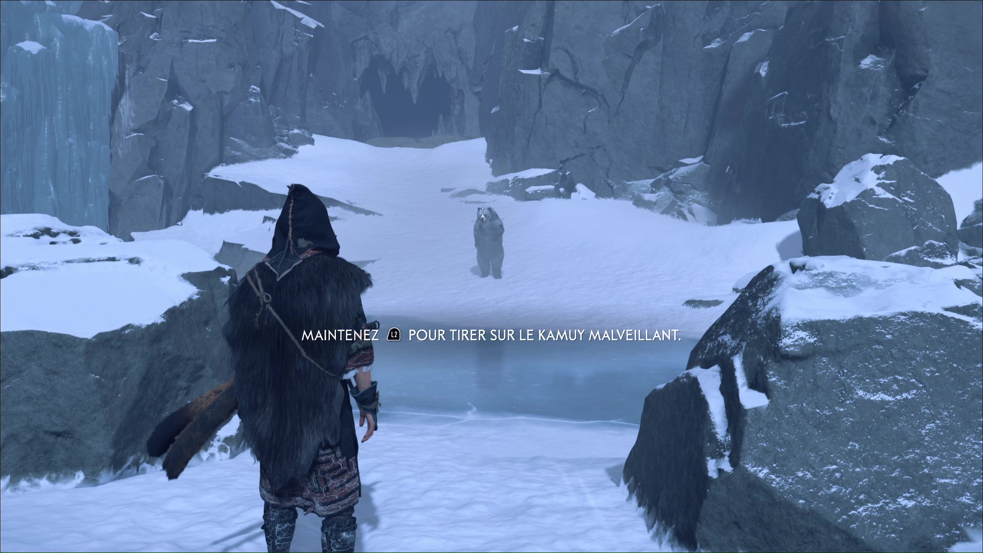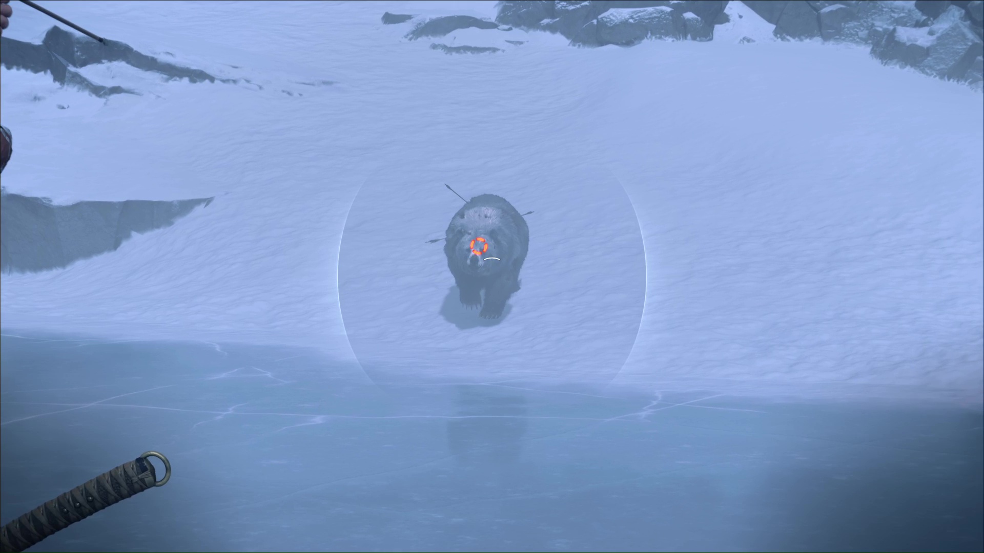 En haut, l’aînou vous attend. L’ours va alors approcher, et vous n’aurez plus qu’à brandir votre arc et à tirer dès lors que le viseur passe au rouge.