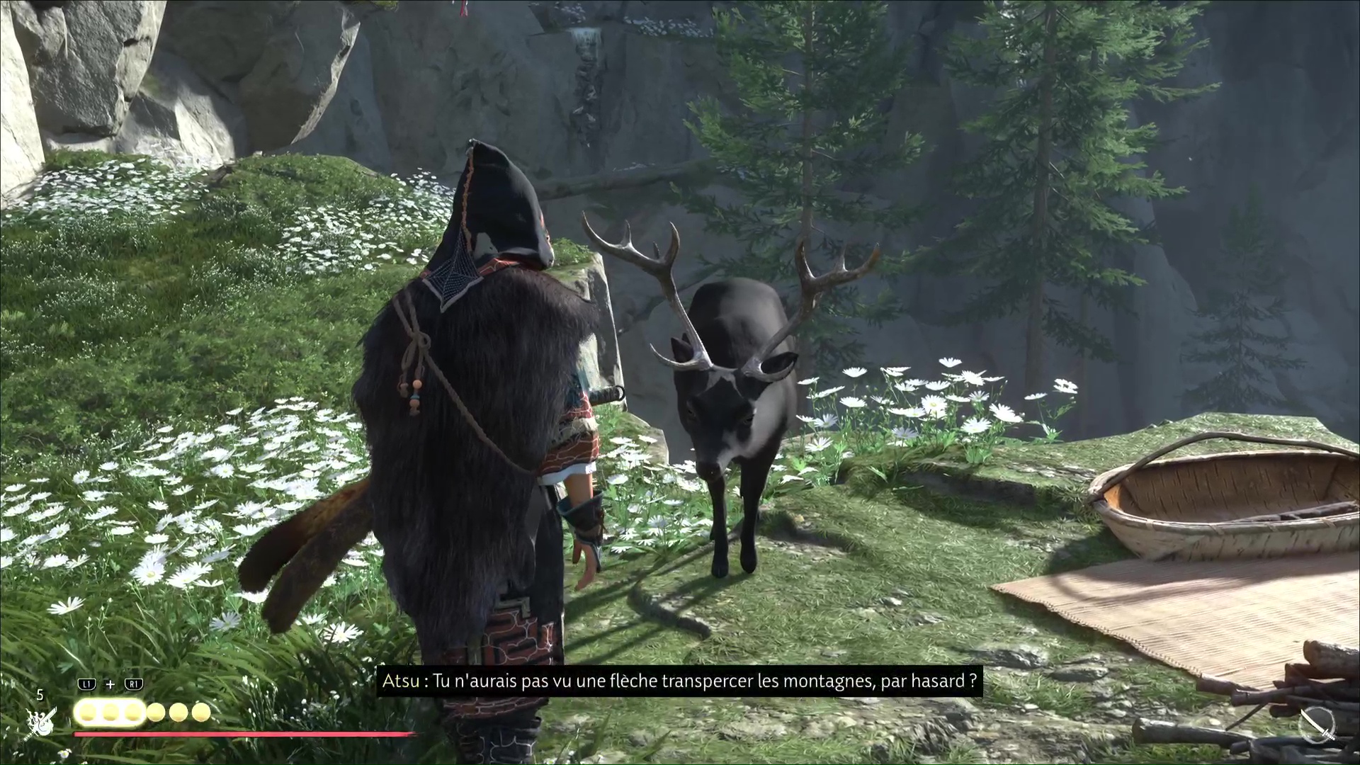 Un enfant viendra ensuite vous dire d’aller au Mont Niptay pour mener votre quête. Allez-y et grimpez la côte près d’un arbre aux feuilles blanches pour apercevoir un cerf. Interagissez avec puis faites « Observer » sur le tapis juste à côté.