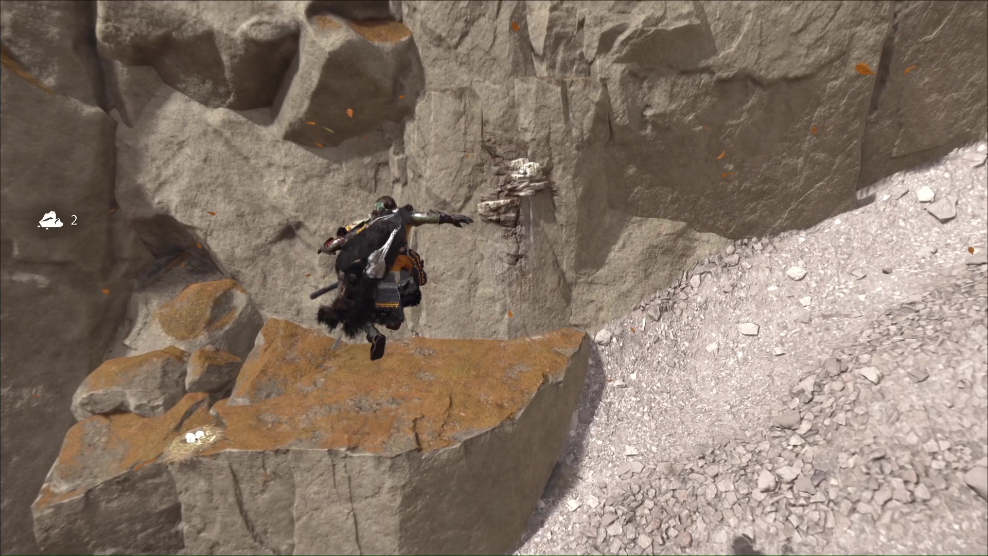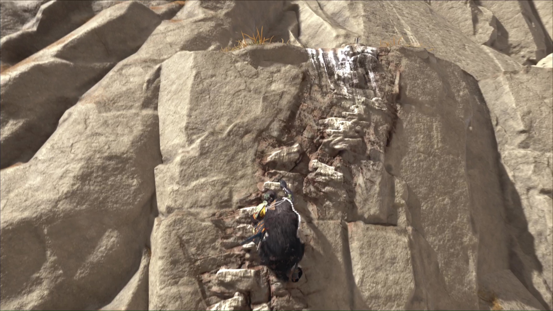 Si vous n’avez pas déjà exploré le coin, rendez-vous au repère indiqué par le musicien et, au pied des montagnes, cherchez des prises rocheuses pour démarrer l’escalade. Une fois hissé, sautez sur la gauche en passant au-dessus la pente.
