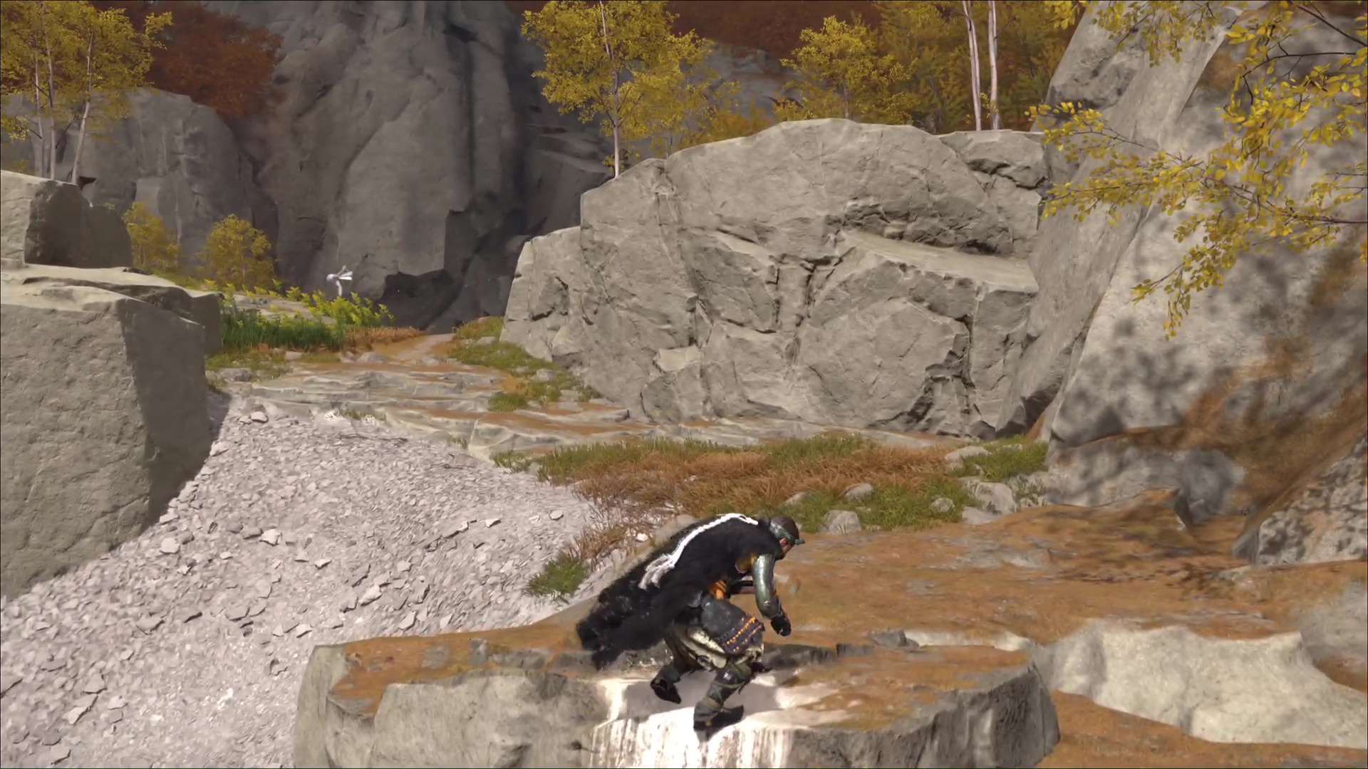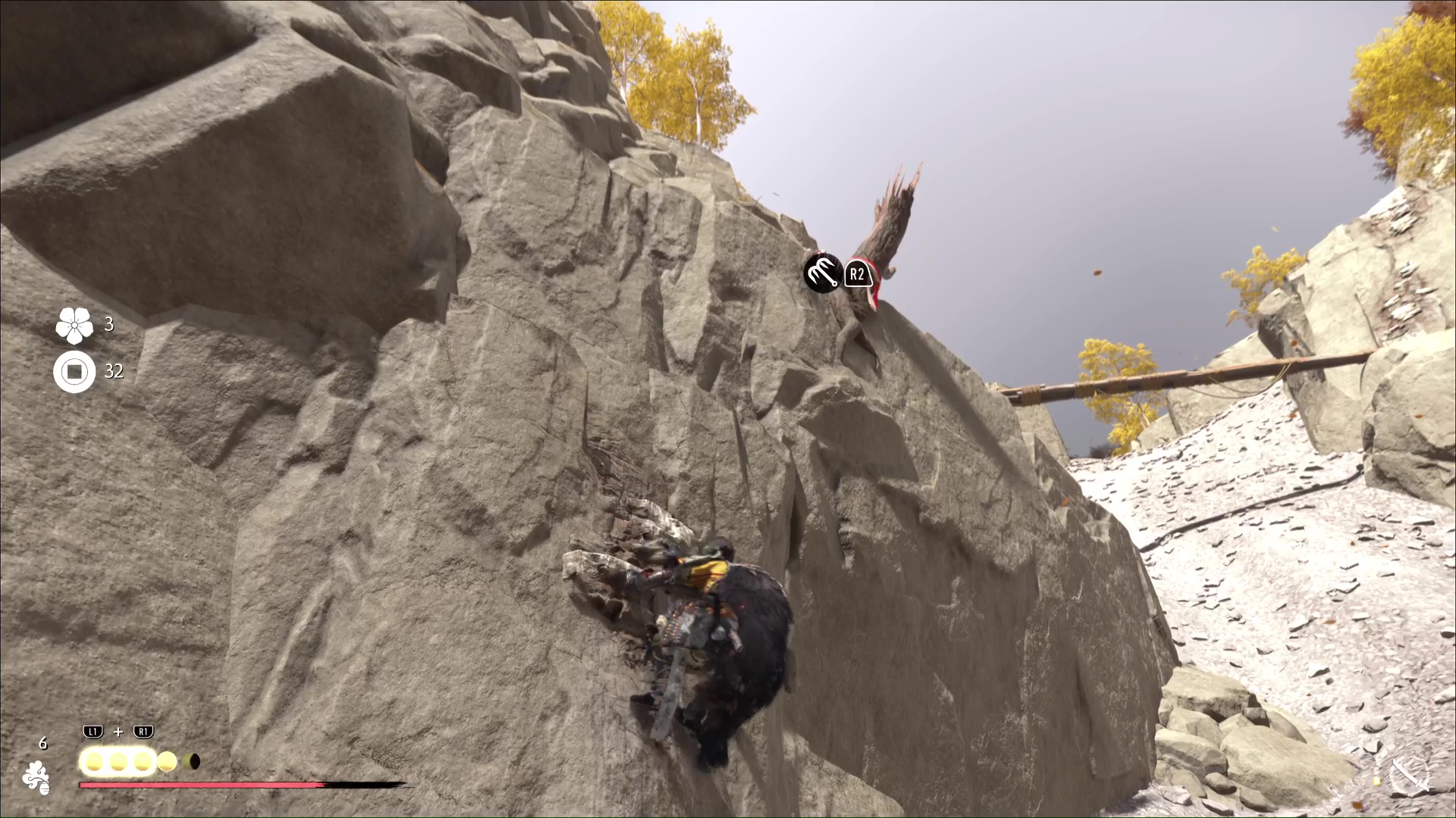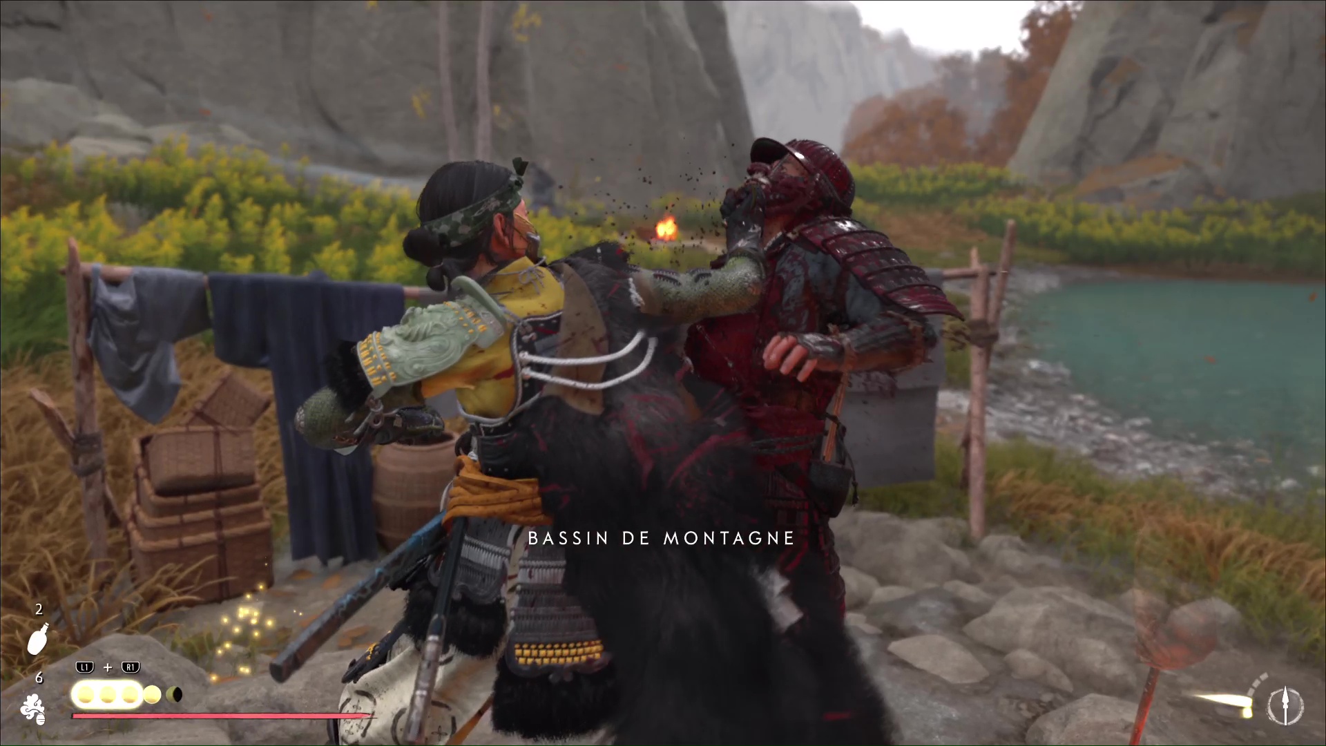 Montez ensuite sur la prise rocheuse droit devant, puis sautez vers le tronc à grappin et accrochez-vous. Ensuite, grimpez une autre paroi et franchissez un pont de bambous menant à de nouvelles proses rocheuses. Faites enfin quelques mètres pour arriver au Bassin de montagne. Hélas, vous n’êtes pas seul.