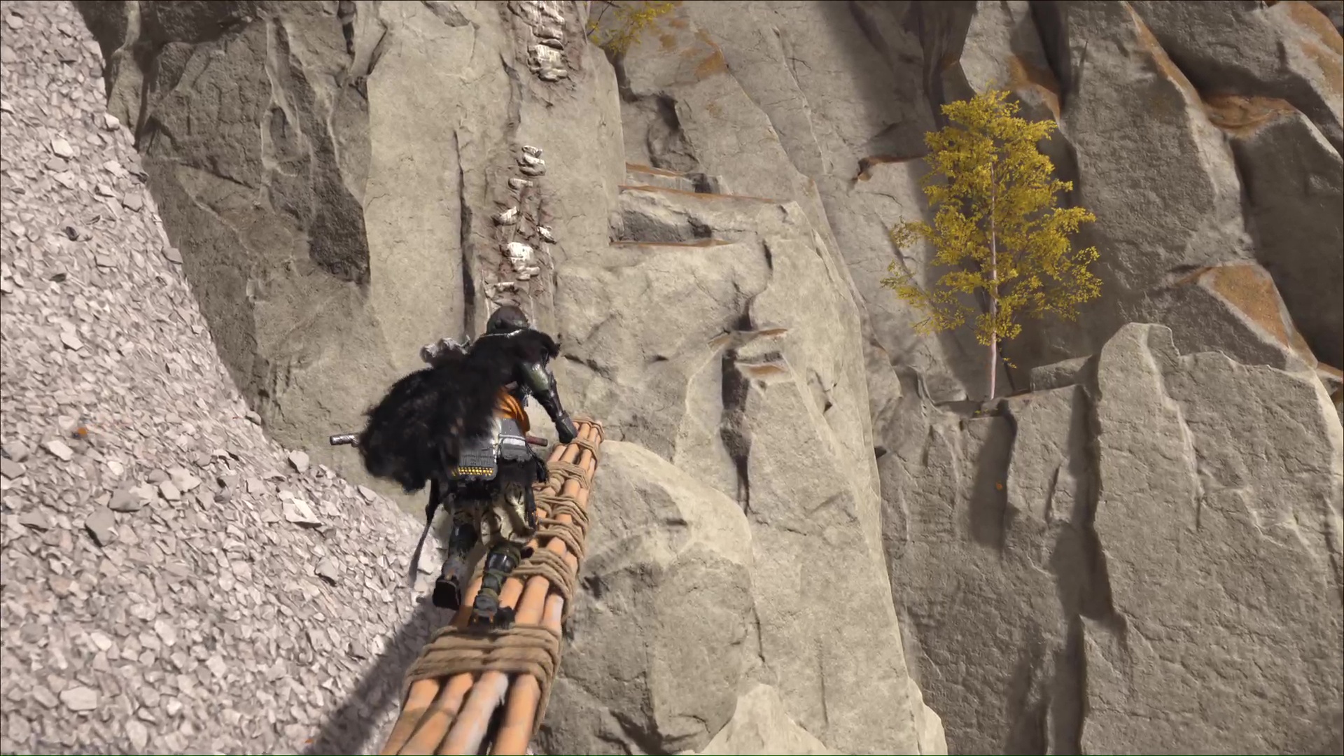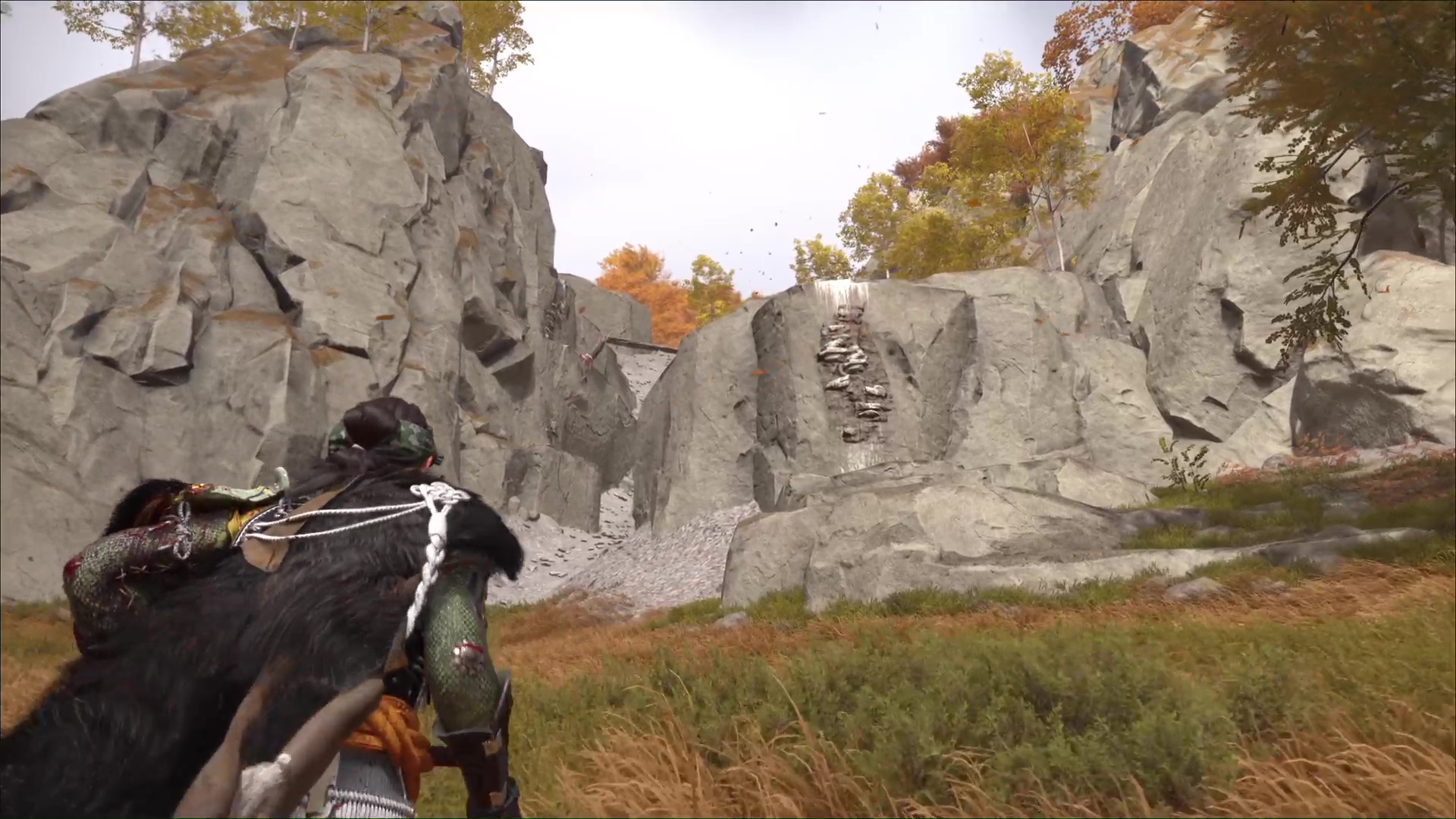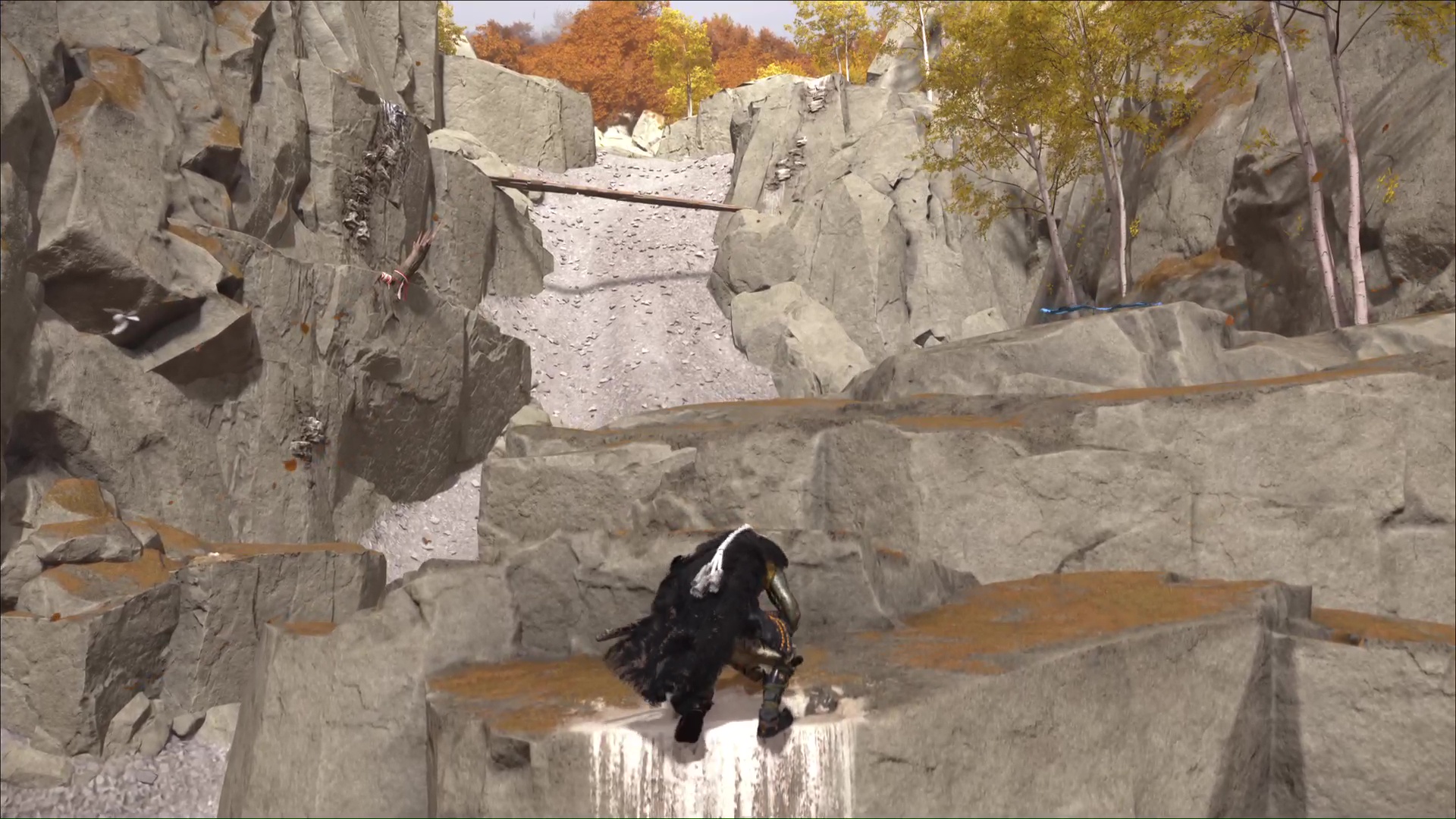 Montez ensuite sur la prise rocheuse droit devant, puis sautez vers le tronc à grappin et accrochez-vous. Ensuite, grimpez une autre paroi et franchissez un pont de bambous menant à de nouvelles proses rocheuses. Faites enfin quelques mètres pour arriver au Bassin de montagne. Hélas, vous n’êtes pas seul.