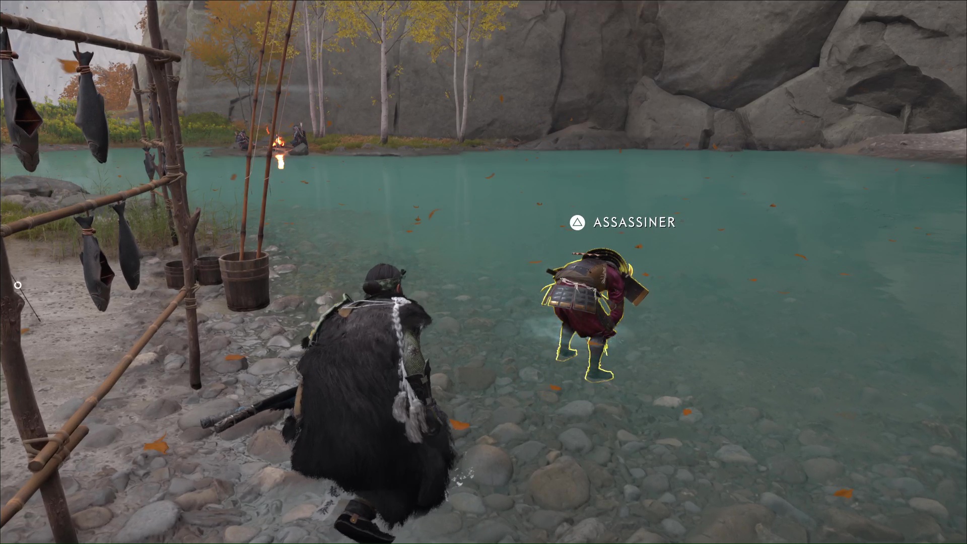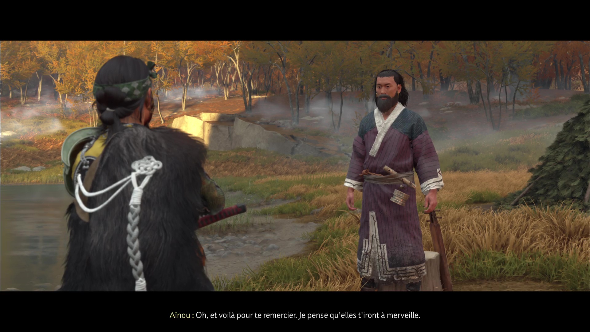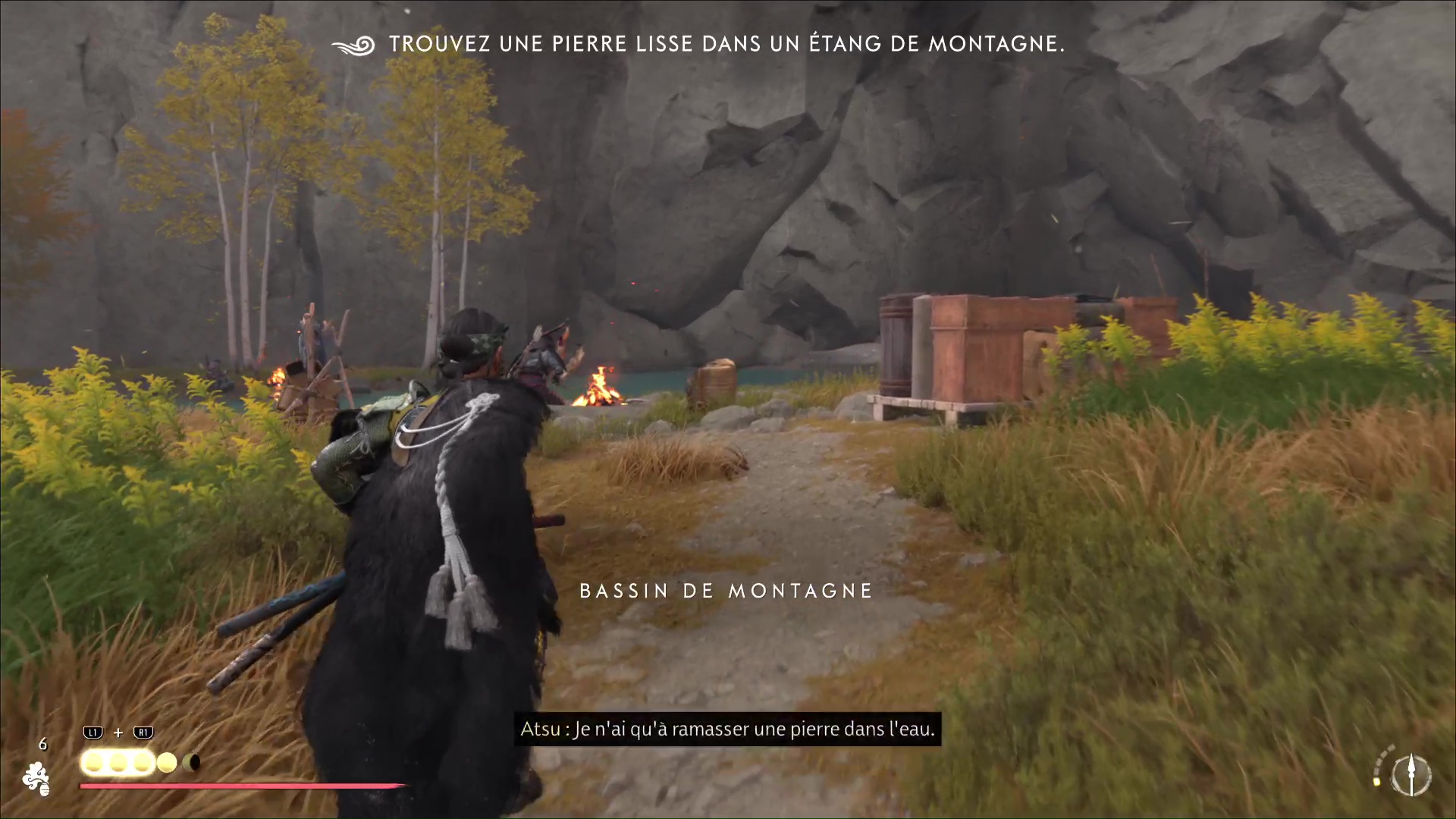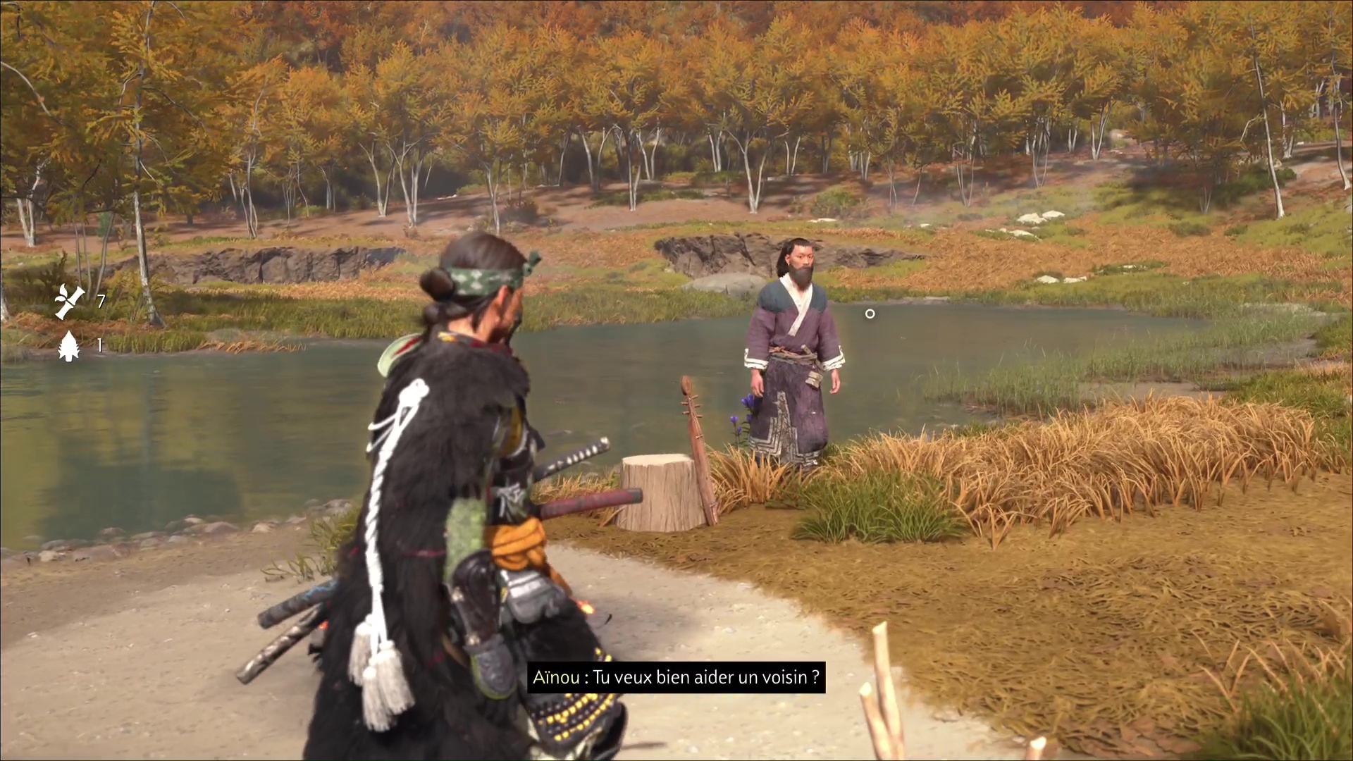 Après, c’est un peu plus compliqué de rester discret. Avancez sur la gauche, ramassez une arme et jetez-la sur un des deux ennemis au loin. Terminez ensuite le travail en combat frontal. Désormais tranquille, allez au fond du bassin pour trouver, sur le sable, la pierre lisse. Revenez auprès du musicien aïnou pour lui donner.
