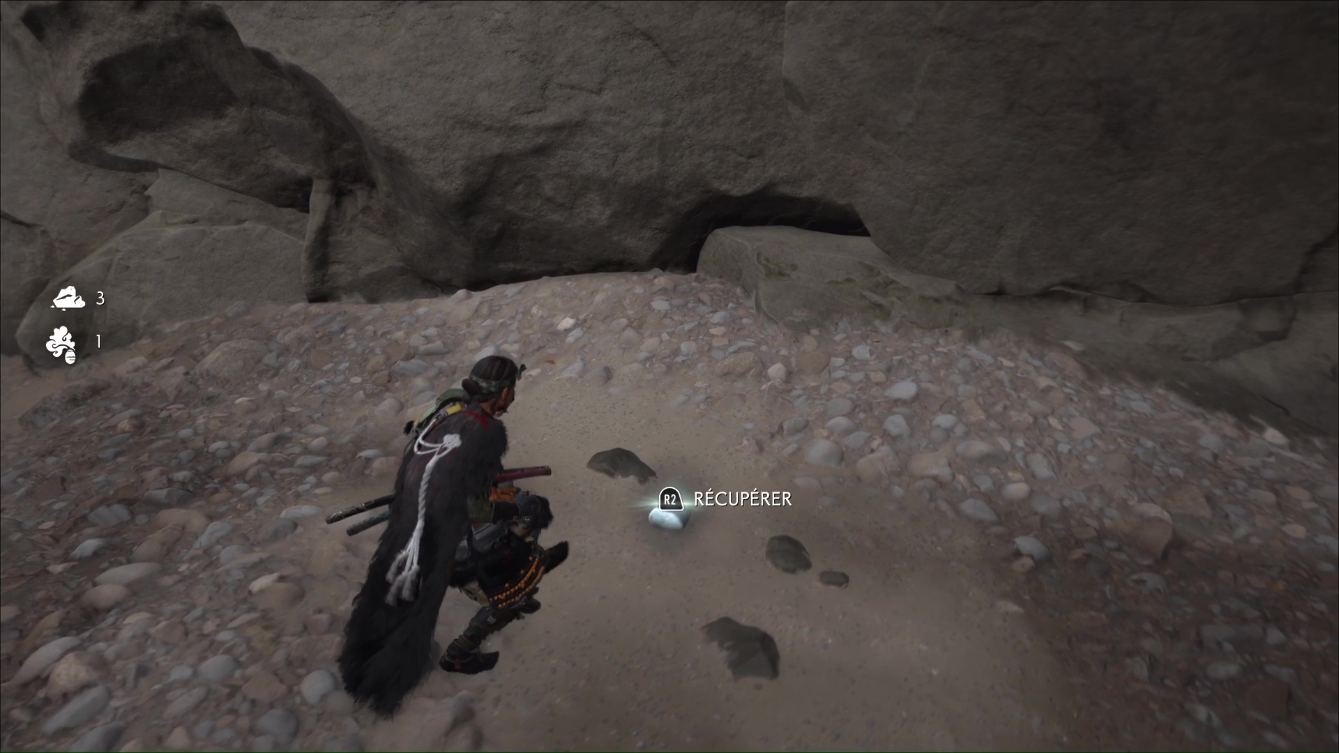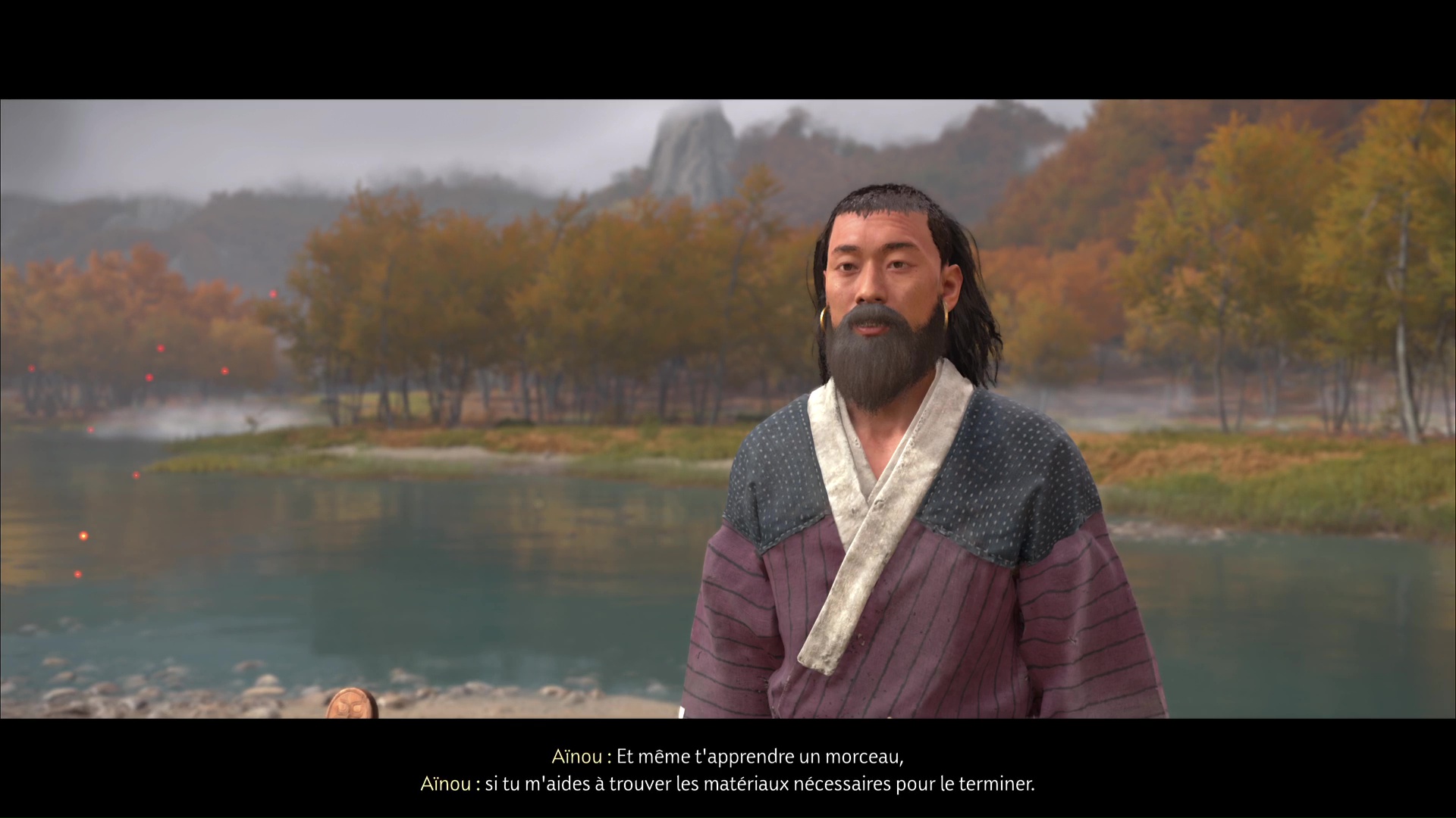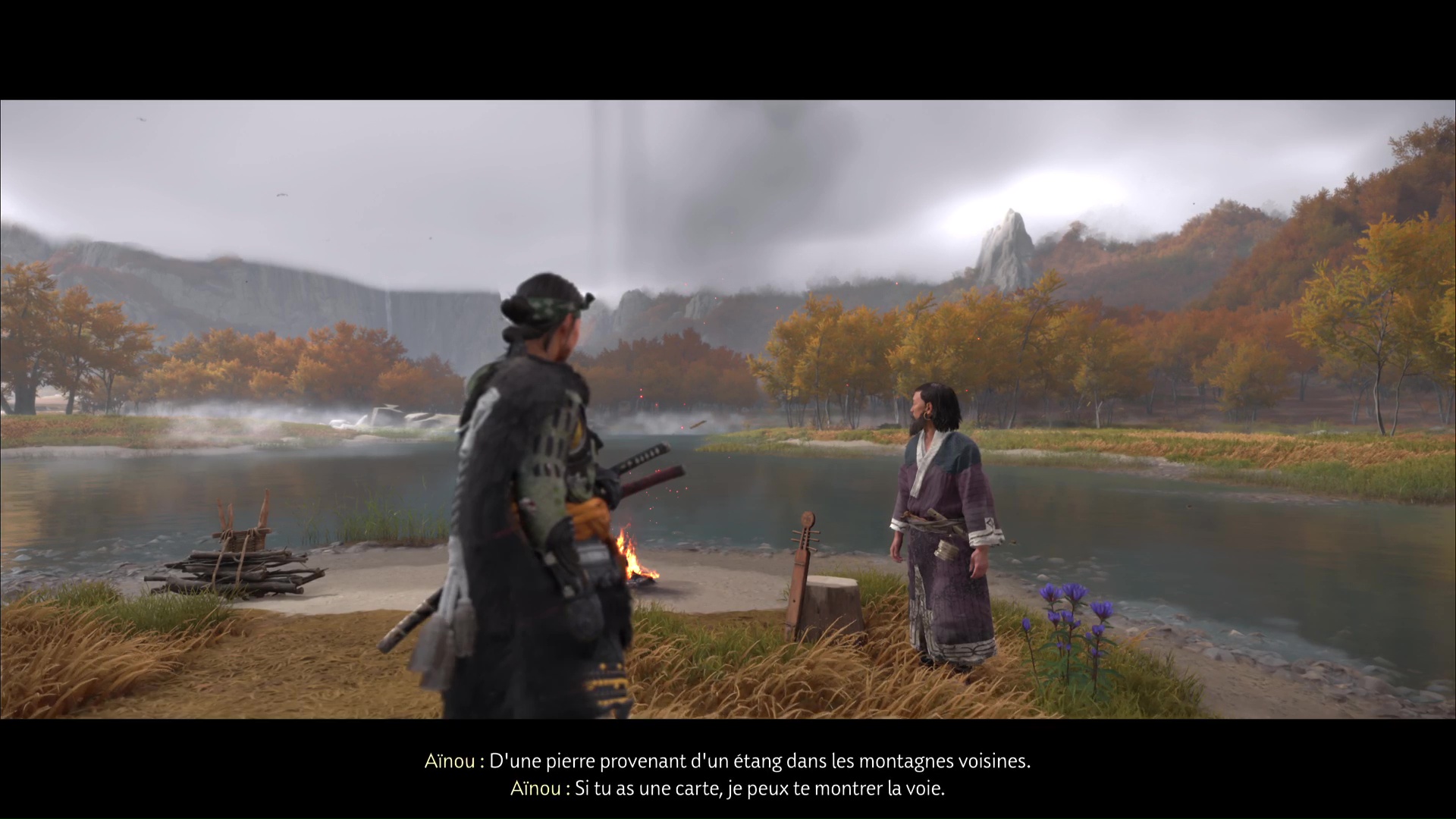 Après, c’est un peu plus compliqué de rester discret. Avancez sur la gauche, ramassez une arme et jetez-la sur un des deux ennemis au loin. Terminez ensuite le travail en combat frontal. Désormais tranquille, allez au fond du bassin pour trouver, sur le sable, la pierre lisse. Revenez auprès du musicien aïnou pour lui donner.