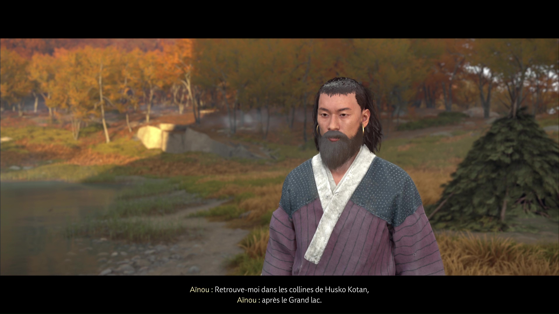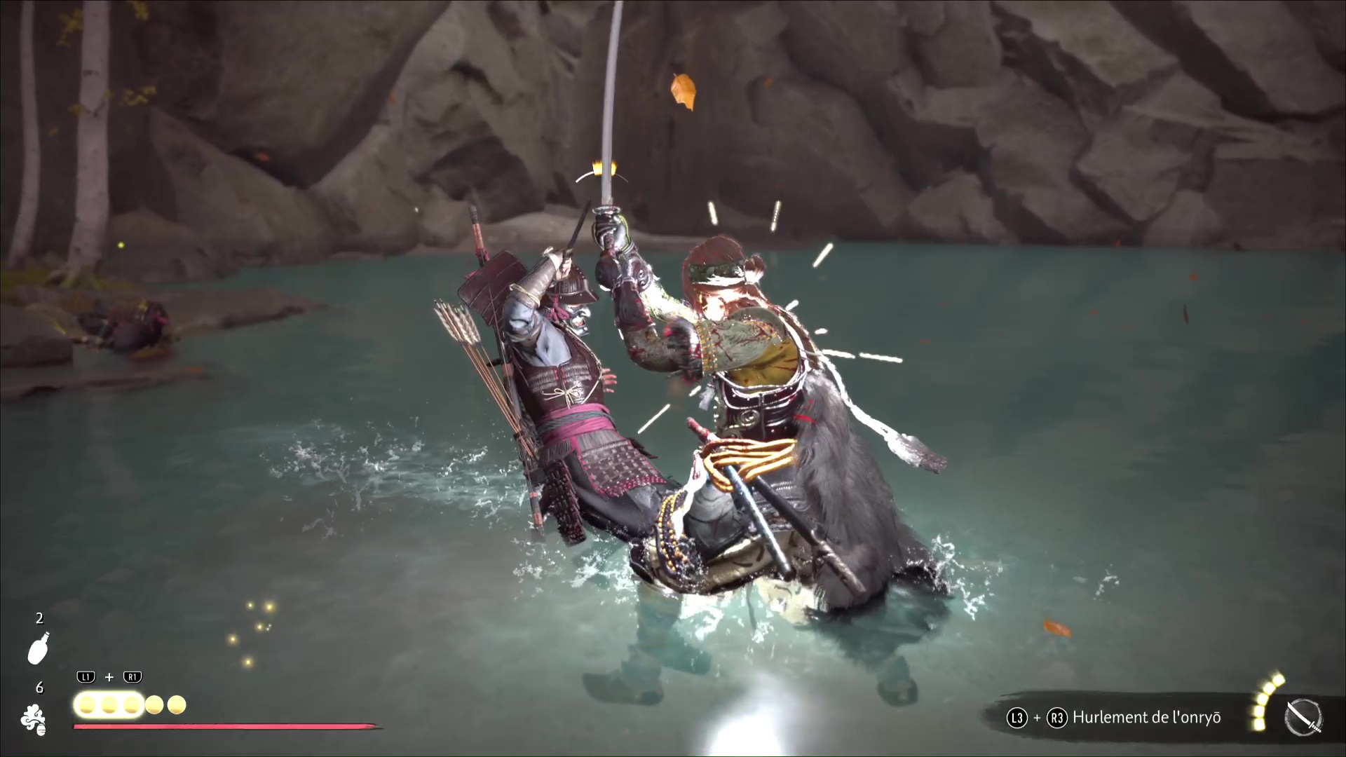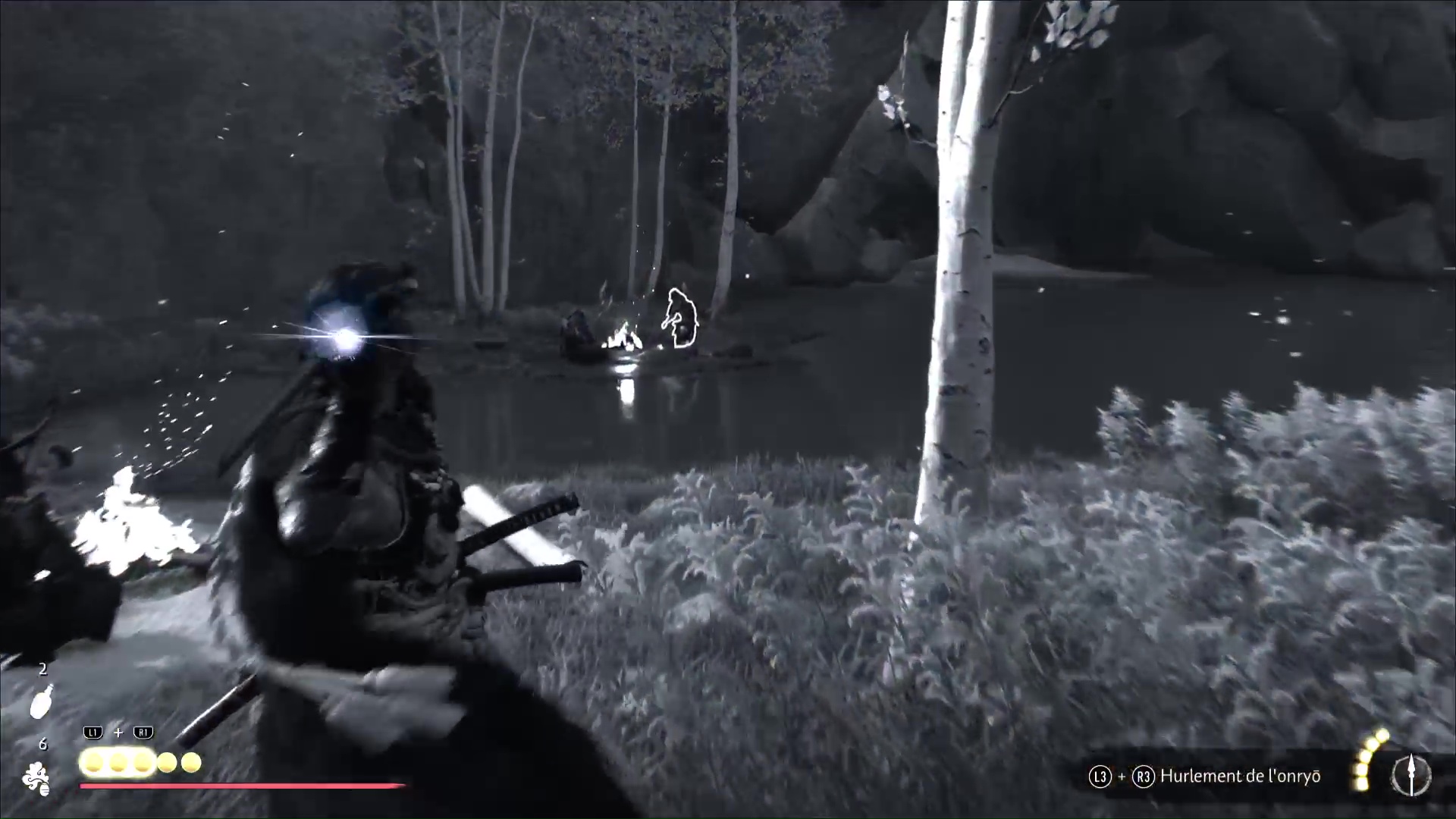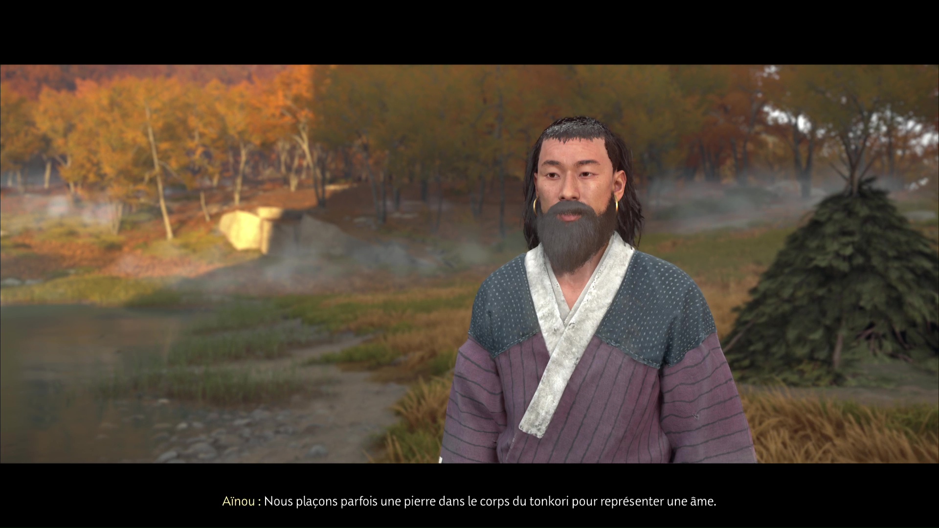 Après, c’est un peu plus compliqué de rester discret. Avancez sur la gauche, ramassez une arme et jetez-la sur un des deux ennemis au loin. Terminez ensuite le travail en combat frontal. Désormais tranquille, allez au fond du bassin pour trouver, sur le sable, la pierre lisse. Revenez auprès du musicien aïnou pour lui donner.